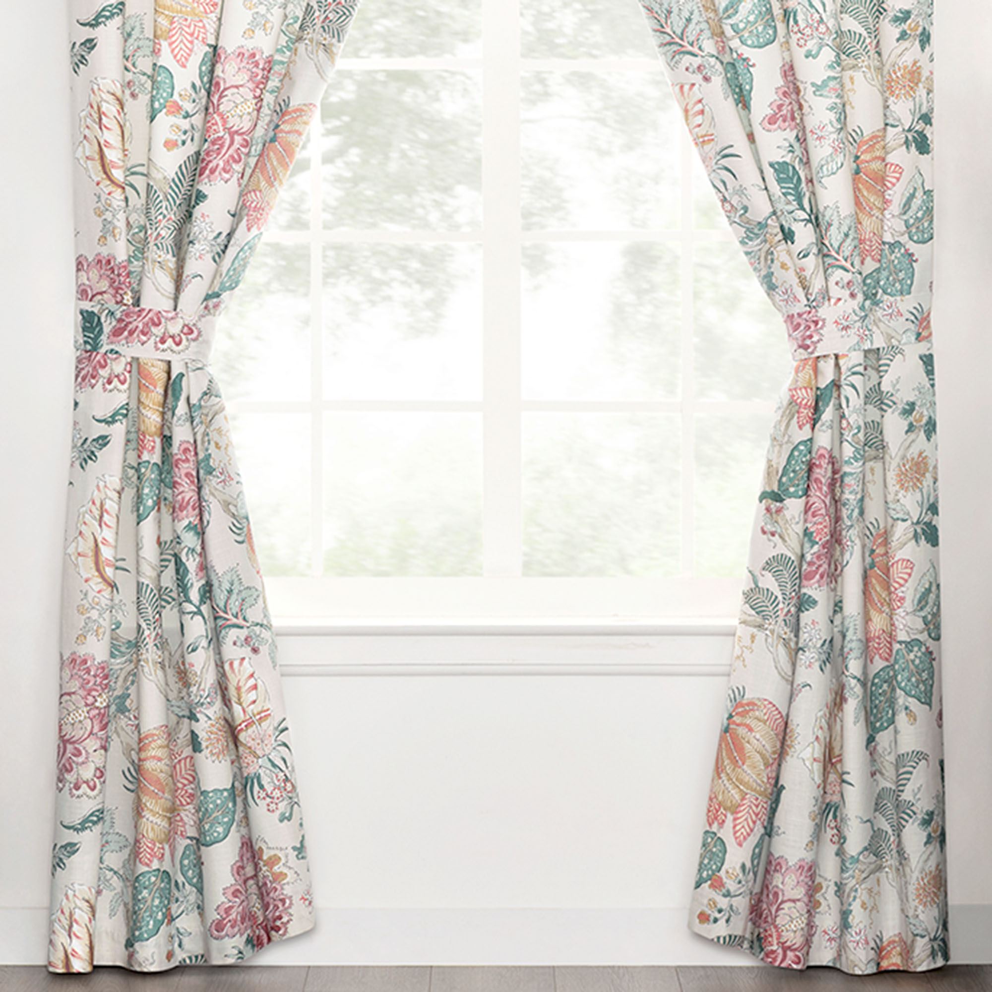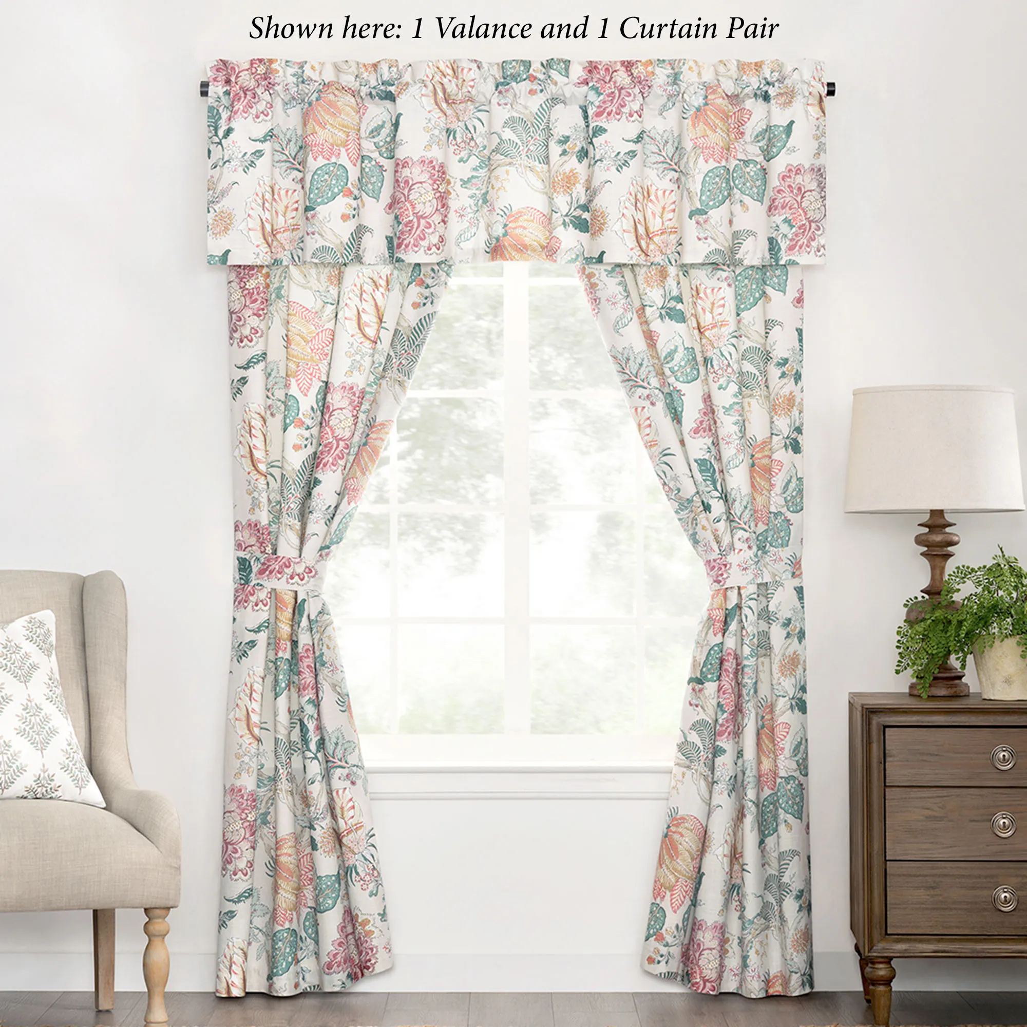 Tailored, lined Window Treatment has a Jacobean floral pattern and 3" rod pockets. Wide Curtain Pair includes tiebacks. Valance is also available.