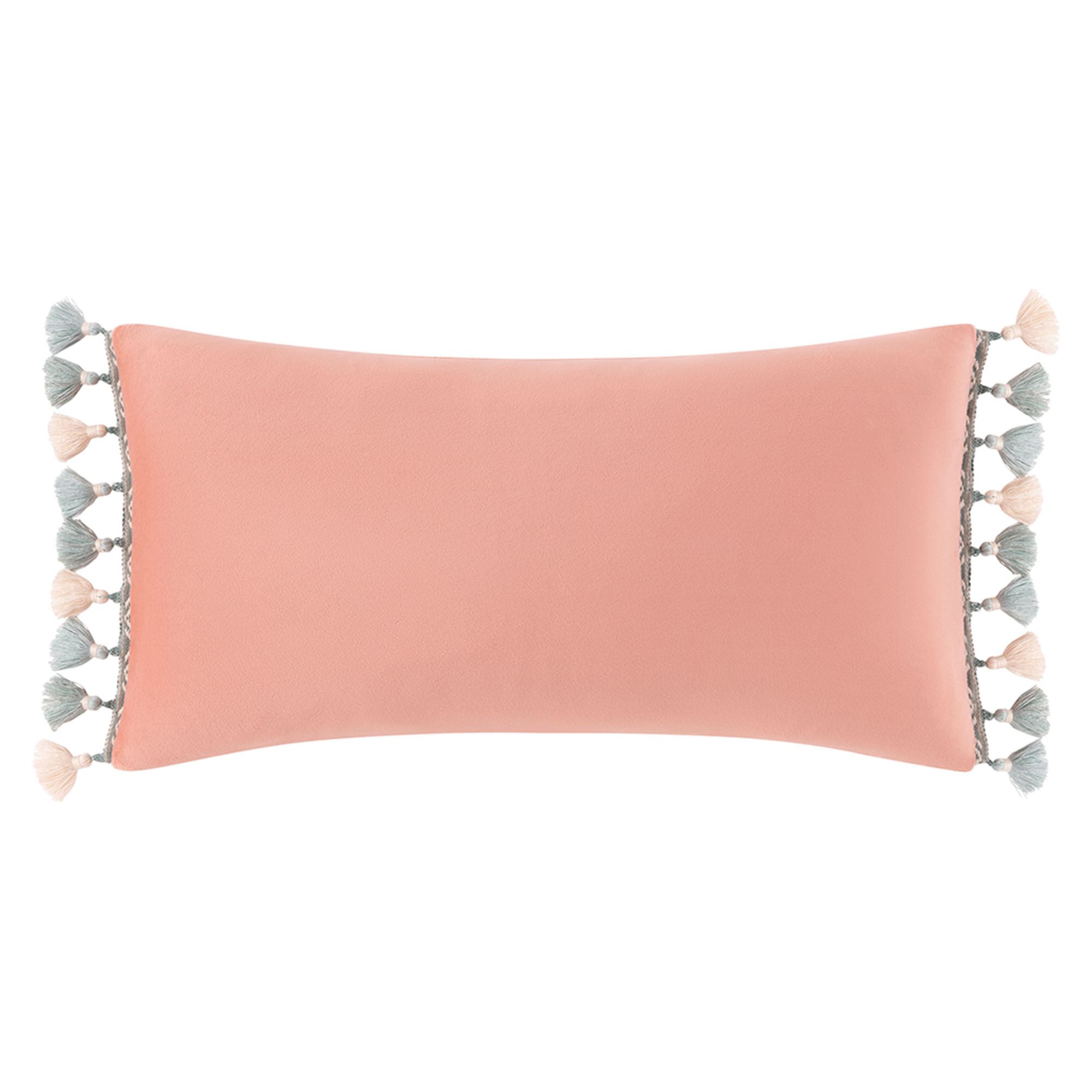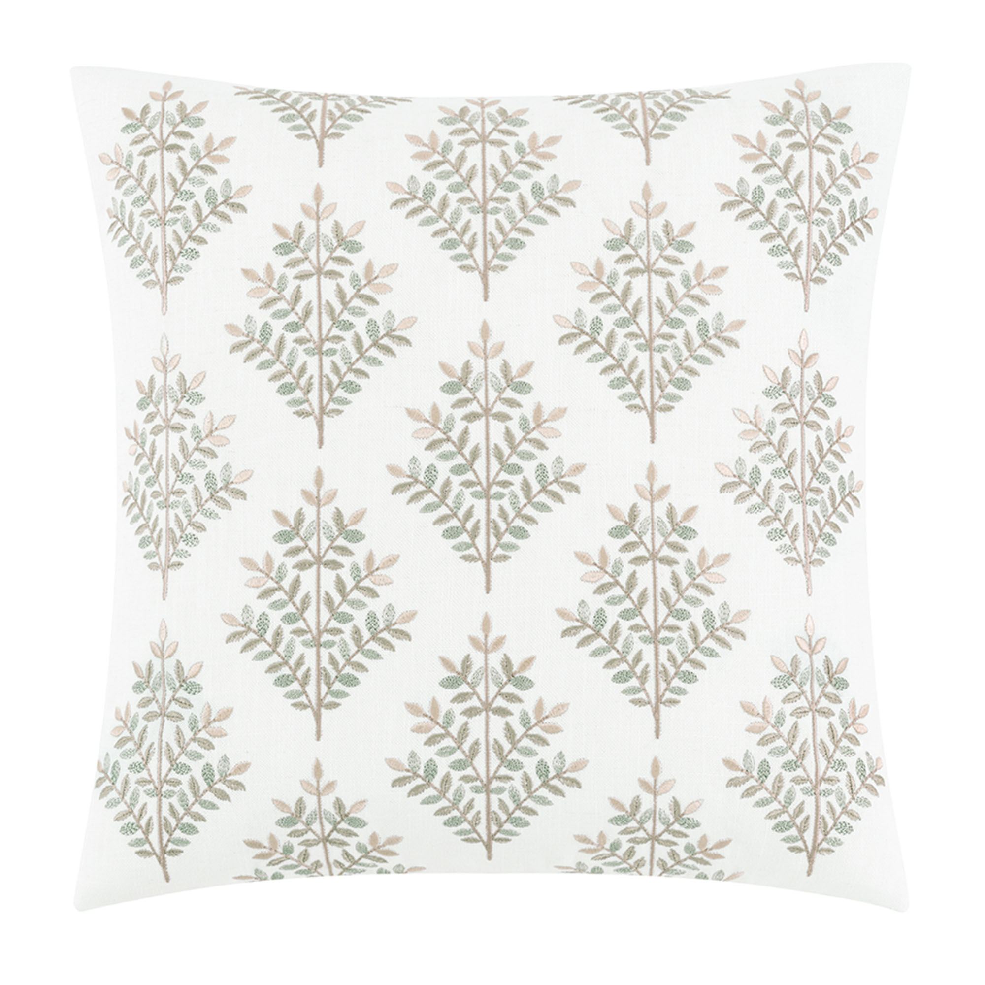 Polyester Pillows have zipper closures. The 16" Square has pieced squares of woven stripes and fringed ends; reverses to green and light cream woven chenille geometric designs. The tailored 20" Square has embroidered leaves in green and beige on a woven ivory background. The reversible Rectangle has a soft coral pink velvet face and tassels on the length ends.
