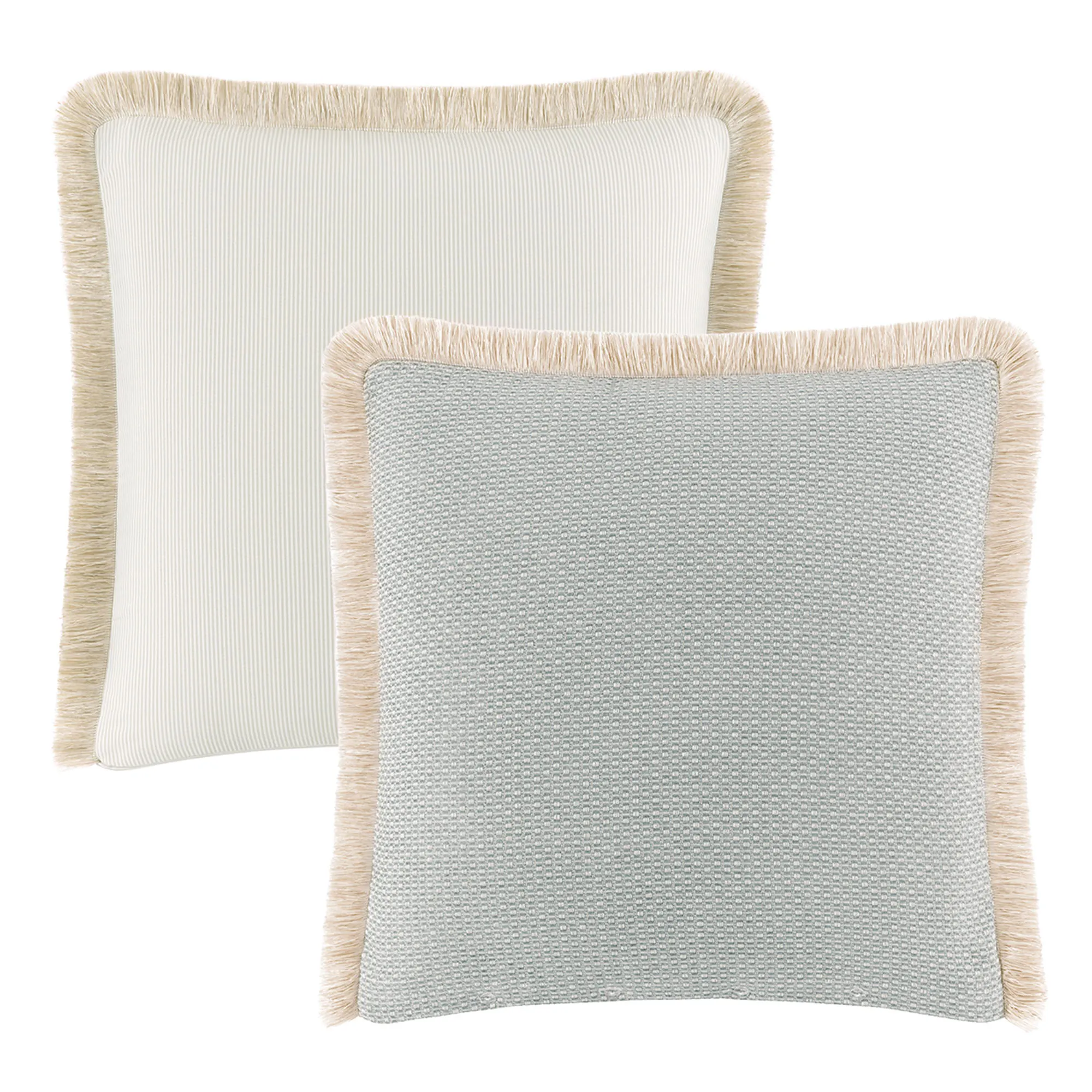 The polyester European Sham has a green and light cream woven chenille geometric pattern on the front, brushed fringe on three sides, and a button closure; reverse has coordinating woven stripes. Dry clean.