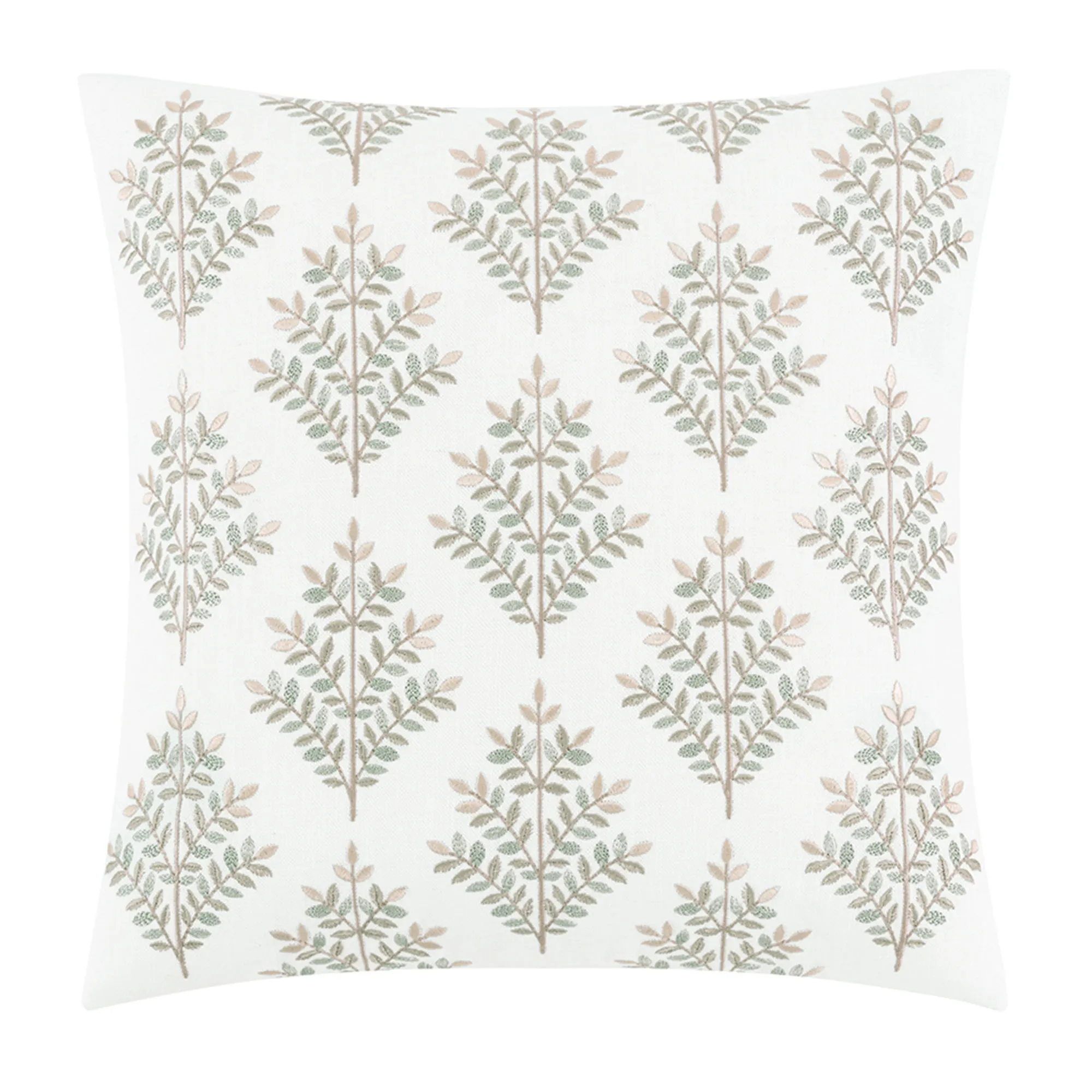 Polyester Pillows have zipper closures. The 16" Square has pieced squares of woven stripes and fringed ends; reverses to green and light cream woven chenille geometric designs. The tailored 20" Square has embroidered leaves in green and beige on a woven ivory background. The reversible Rectangle has a soft coral pink velvet face and tassels on the length ends.