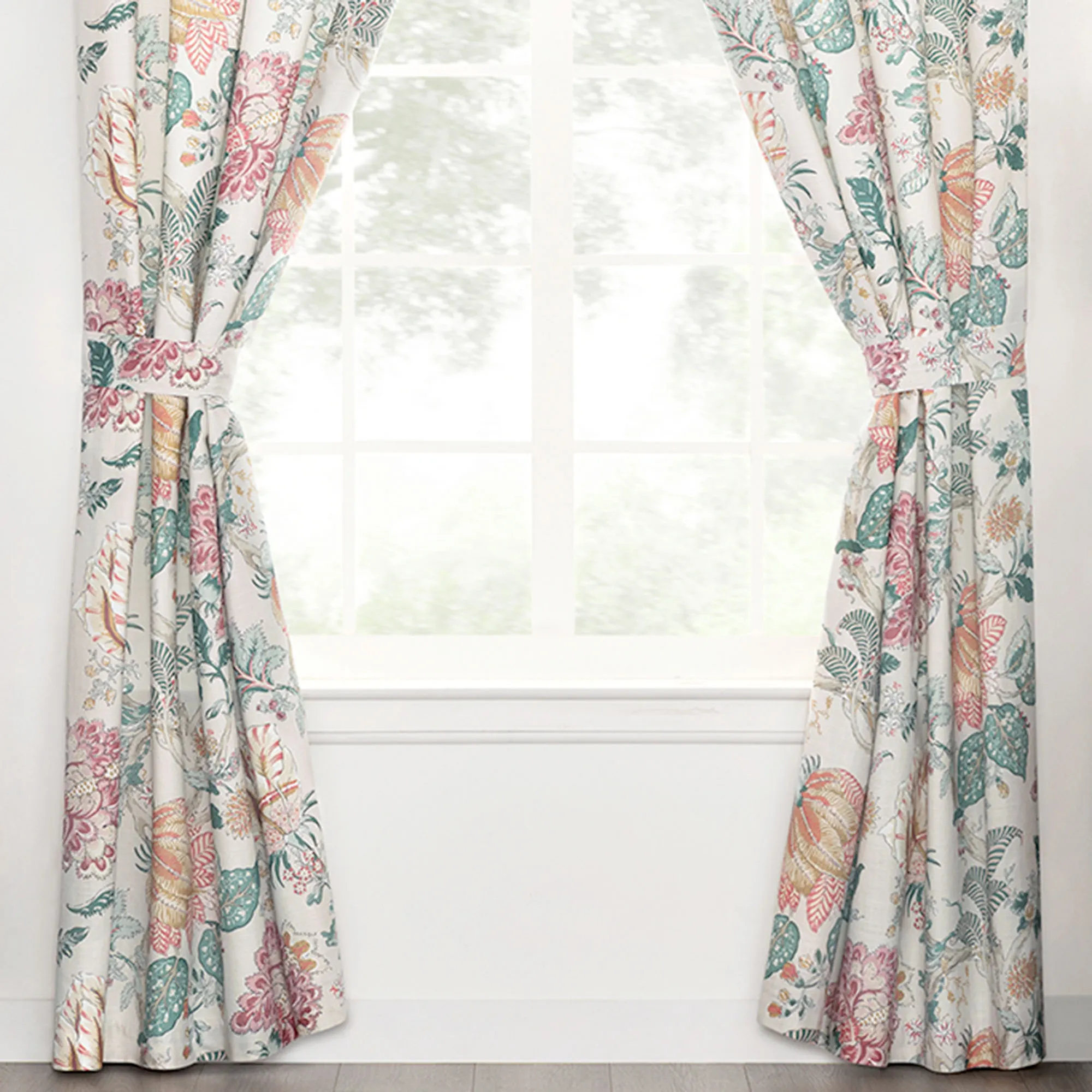 Tailored, lined Window Treatment has a Jacobean floral pattern and 3" rod pockets. Wide Curtain Pair includes tiebacks. Valance is also available.