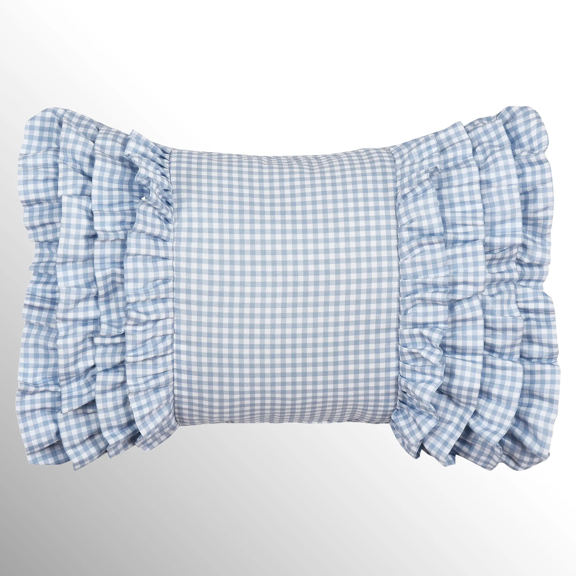Pillows: Spot clean. Square has the floral print, diamond quilting, and a ruffled blue and white gingham flange; reverses to the blue and white gingham print. Rectangle has the blue and white gingham print, layered ruffles on the length ends, and a blue and white gingham print backing. The handmade Round has the blue and white gingham print, a button tuft in the center, white lace trim, and a blue and white gingham print backing.