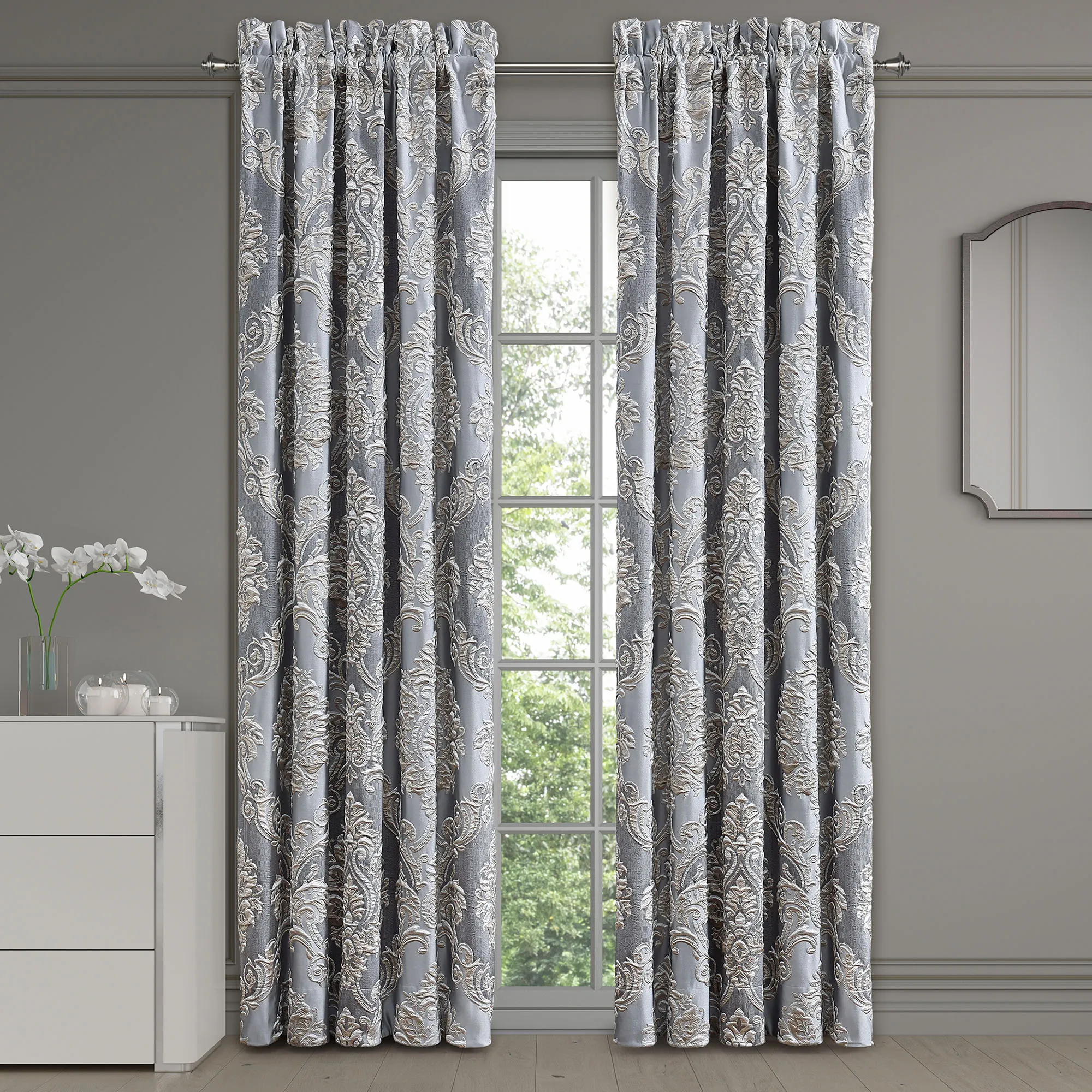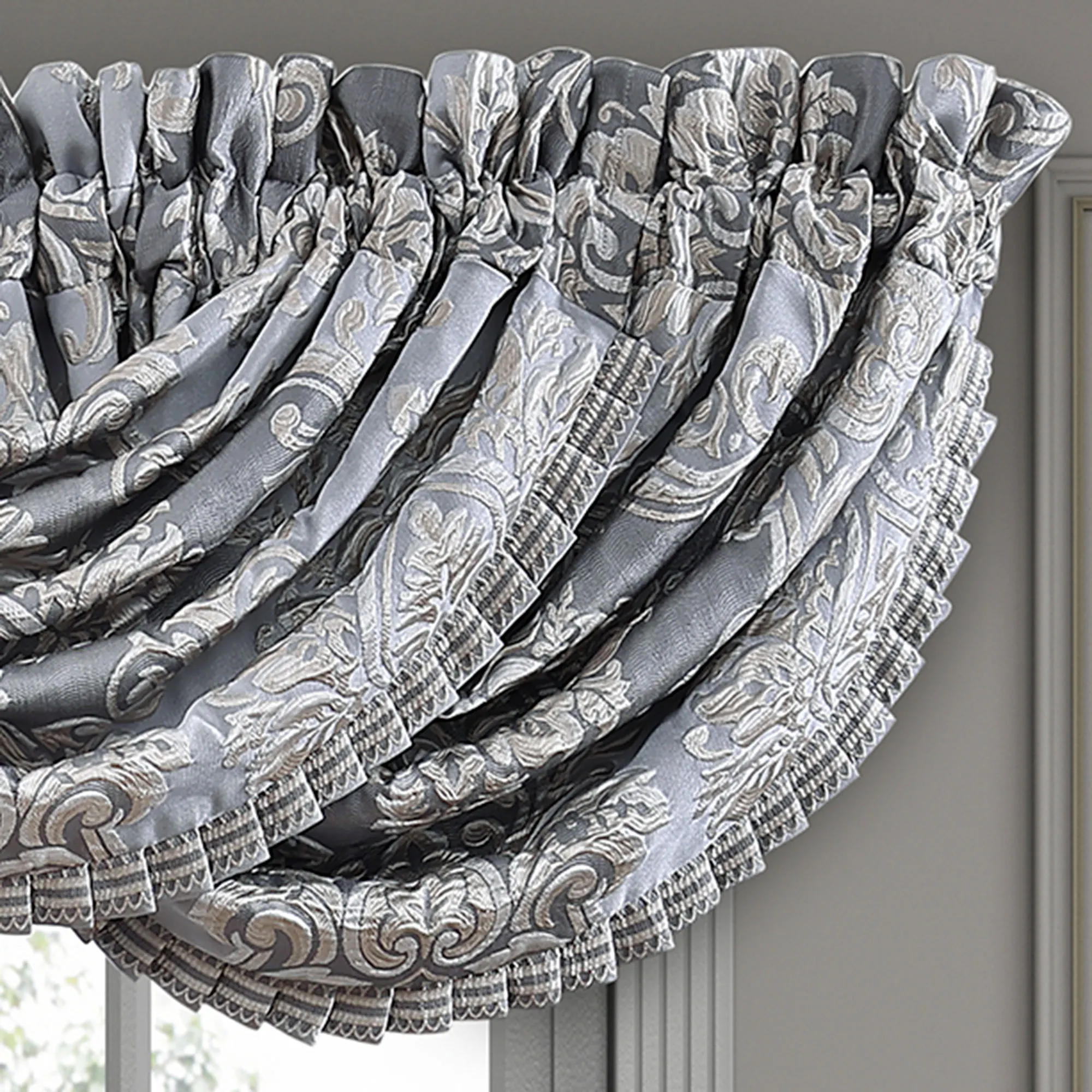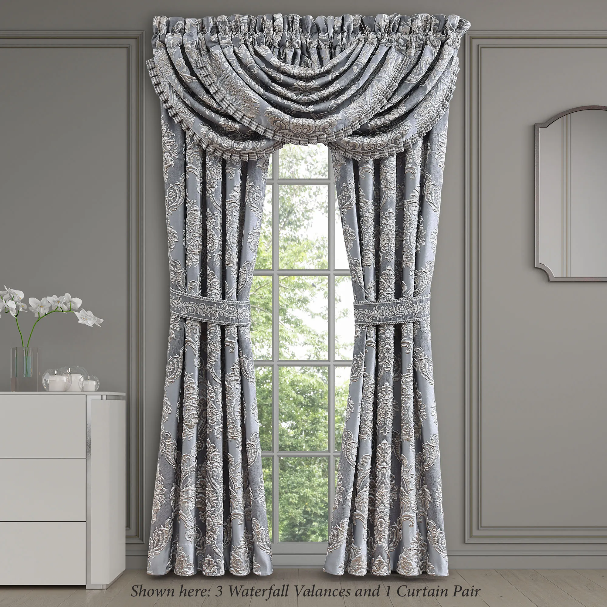 Window Treatment: Wide Curtain Pair has a 3" rod pocket and is 100"W; choose 84"L or 95"L. Each Waterfall Valance has a 3.25" rod pocket and is 43"Wx33"L. We recommend one valance for every 12"-15" of window width.