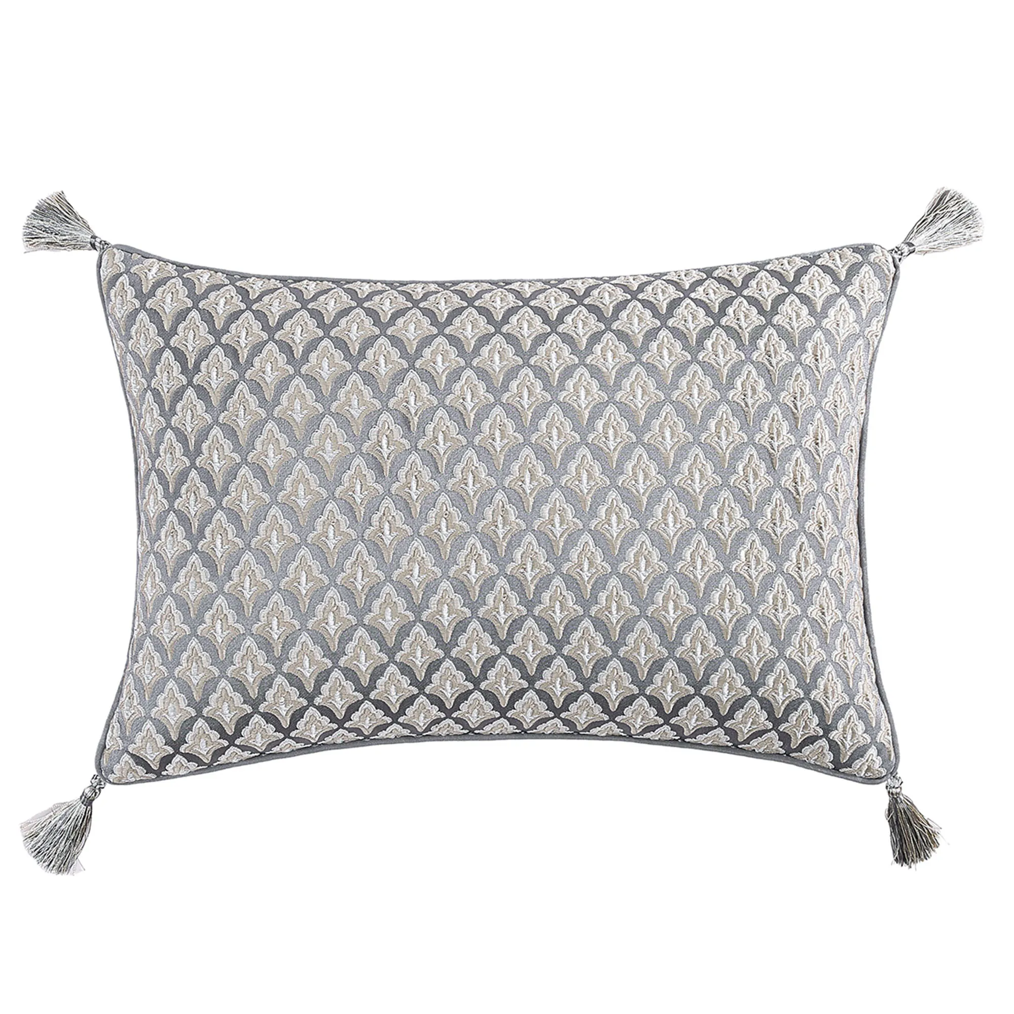 Piped Pillows: Spot clean. The Damask 20" Square has woven damask designs and reverses to woven-jacquard stripes with fleur designs. The Embroidered 20" Square has embroidered lattice designs. The mitred Tufted 18" Square has a border of woven-jacquard fleurs and a central button tuft. The Accent Rectangle has woven-jacquard foulard designs and corner tassels. The Jumbo Rectangle has woven-jacquard foulard motifs and reverses to woven-jacquard stripes with fleur designs.