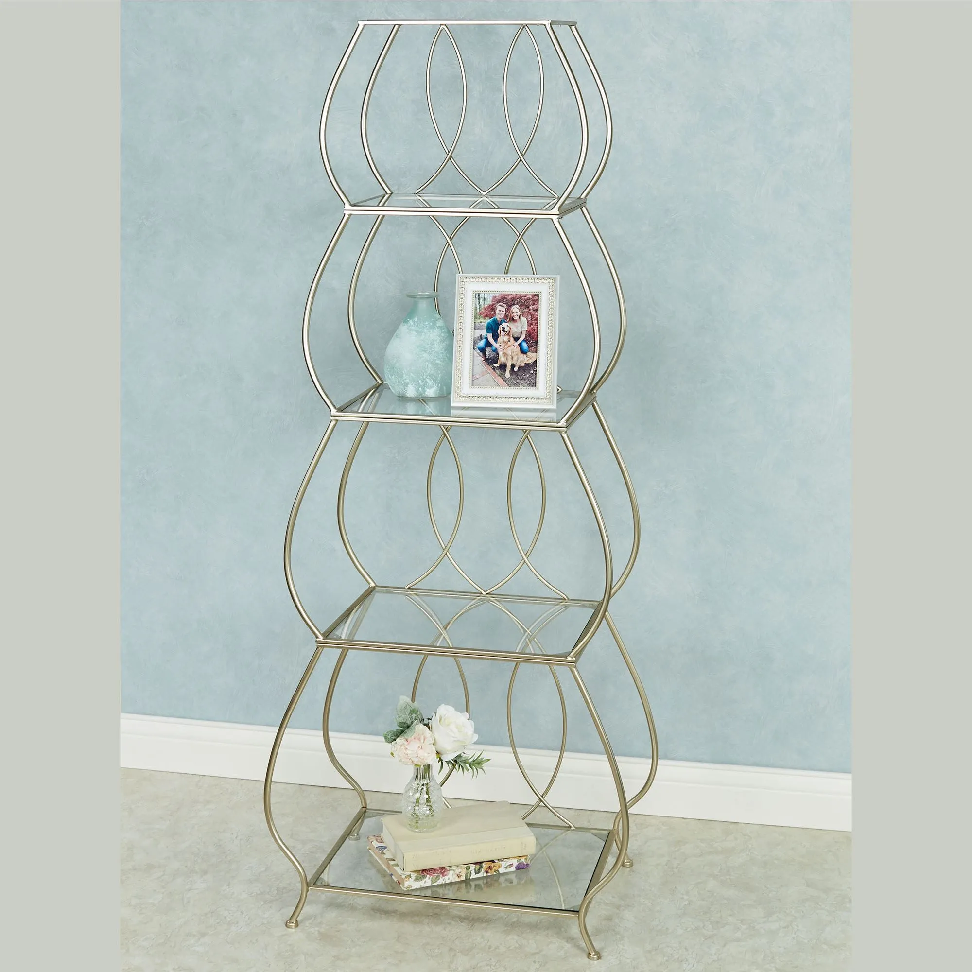 With its graceful curves and elegant look, the Krysta Four-Tier Etagere will be a fabulous addition to your decor. Metal furnishing has a beautiful champagne gold finish and clear glass shelves. Shelves are approx. 13.5"W-19.5"W to 9.5"D-14"D and are perfect for your trinkets. Shelf heights, from top to bottom, are 12.5", 13.5", 14.5", and 16". Overall, the etagere is 25"Wx14"Dx62"H; weighs 21 lbs.