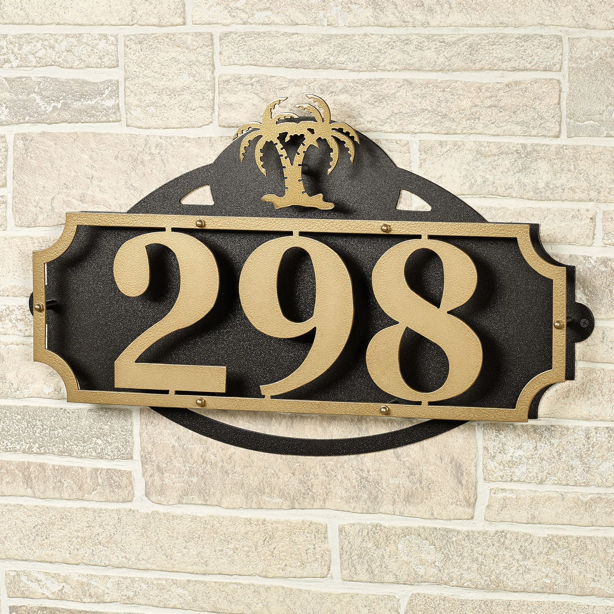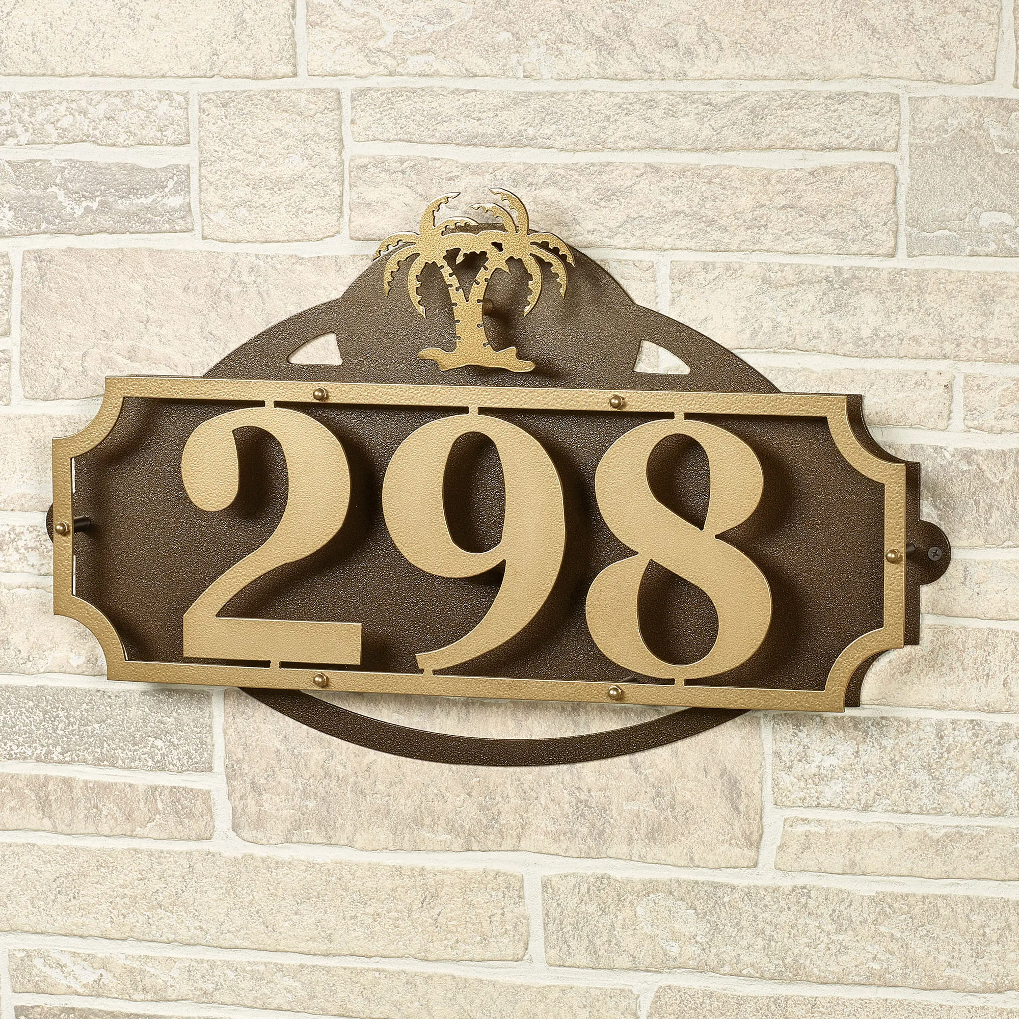 For an elegant look outdoors, place the La Casa Palm Tree House Number Wall Address Sign near your entryway and display your address numbers with pride. Handcrafted of precision-cut, 14-gauge steel, this sign has a powder-coated finish that is UV-, weather-, and tarnish-resistant. The arched backplate is 13"H. The address sign, the 6"H numbers, and the decorative accent at the top have a gold finish. Outdoor year-round use. Overall, wall address sign measures 21"Wx1.5"Dx13"H. (C)2015 Touch of Class(R).