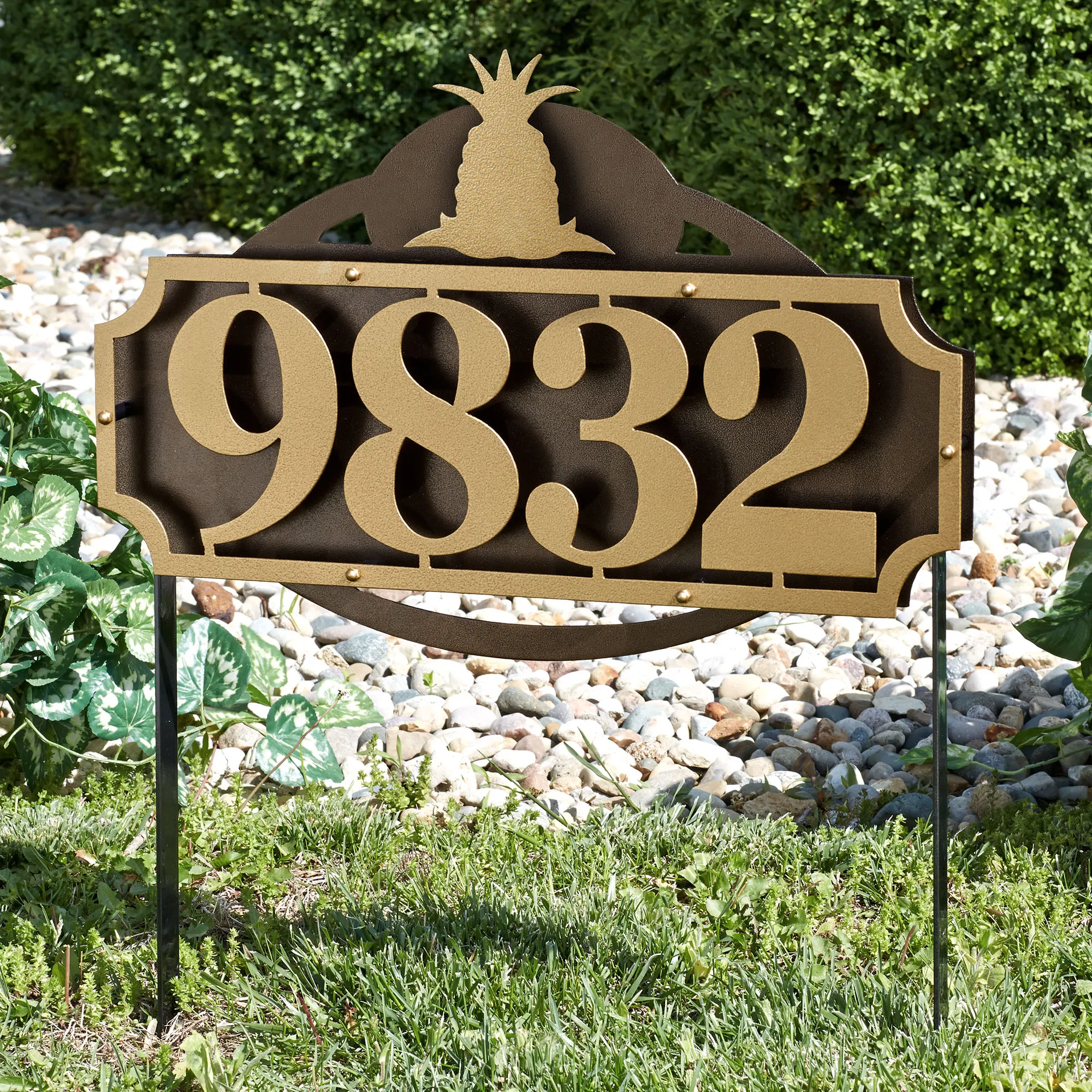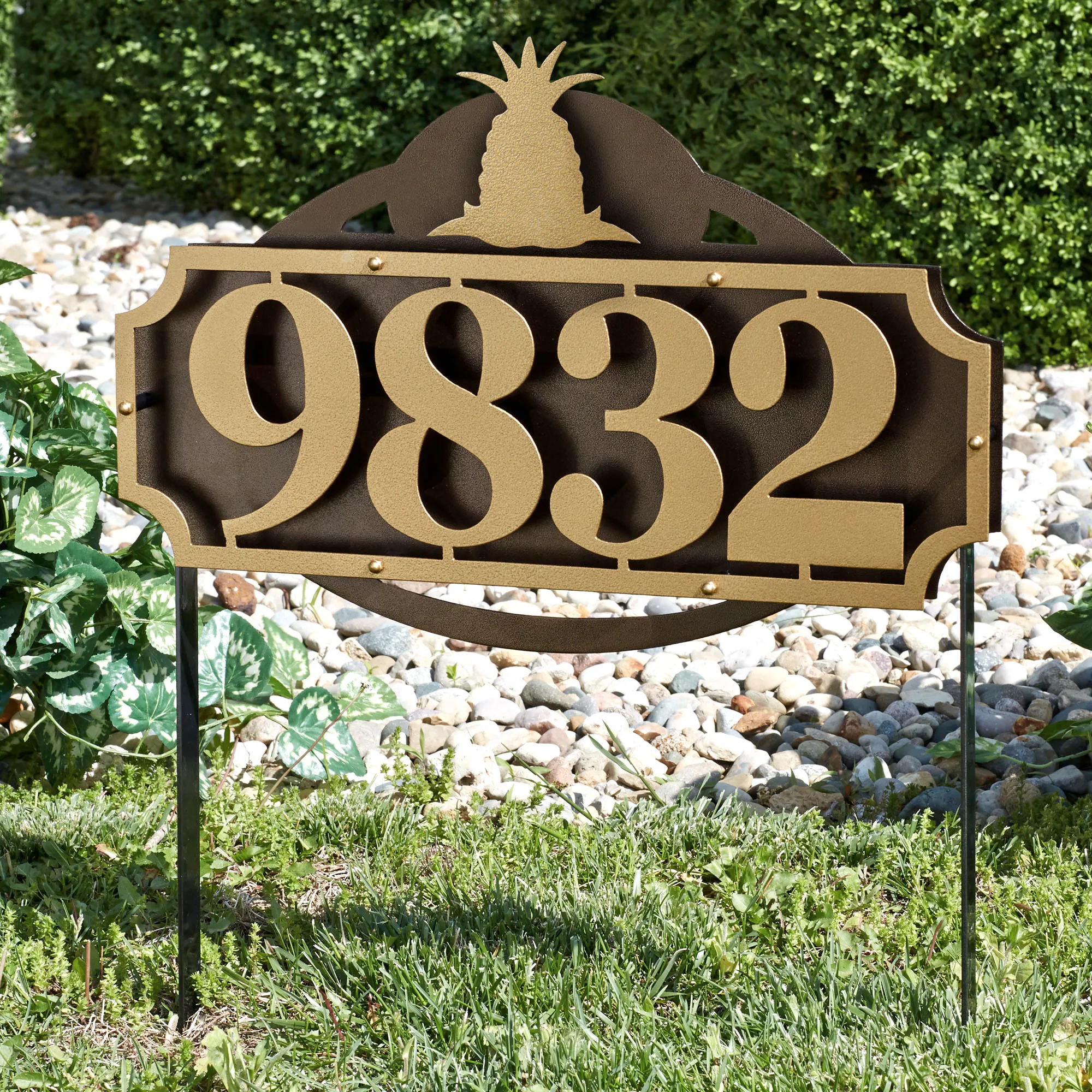 For an elegant look outdoors, place the La Casa Pineapple House Number Address Sign Stake in your yard or by the driveway to display your address numbers with pride. Handcrafted of precision-cut, 14-gauge steel, this yard sign has a powder-coated finish that is UV-, weather-, and tarnish-resistant. The arched backplate is 13"H. The address plaque, the 6"H numbers, and the decorative accent at the top have a gold finish. Outdoor year-round use. Overall, yard sign stake measures 21"Wx2.5"Dx27"H. (C)2014 Touch of Class(R).