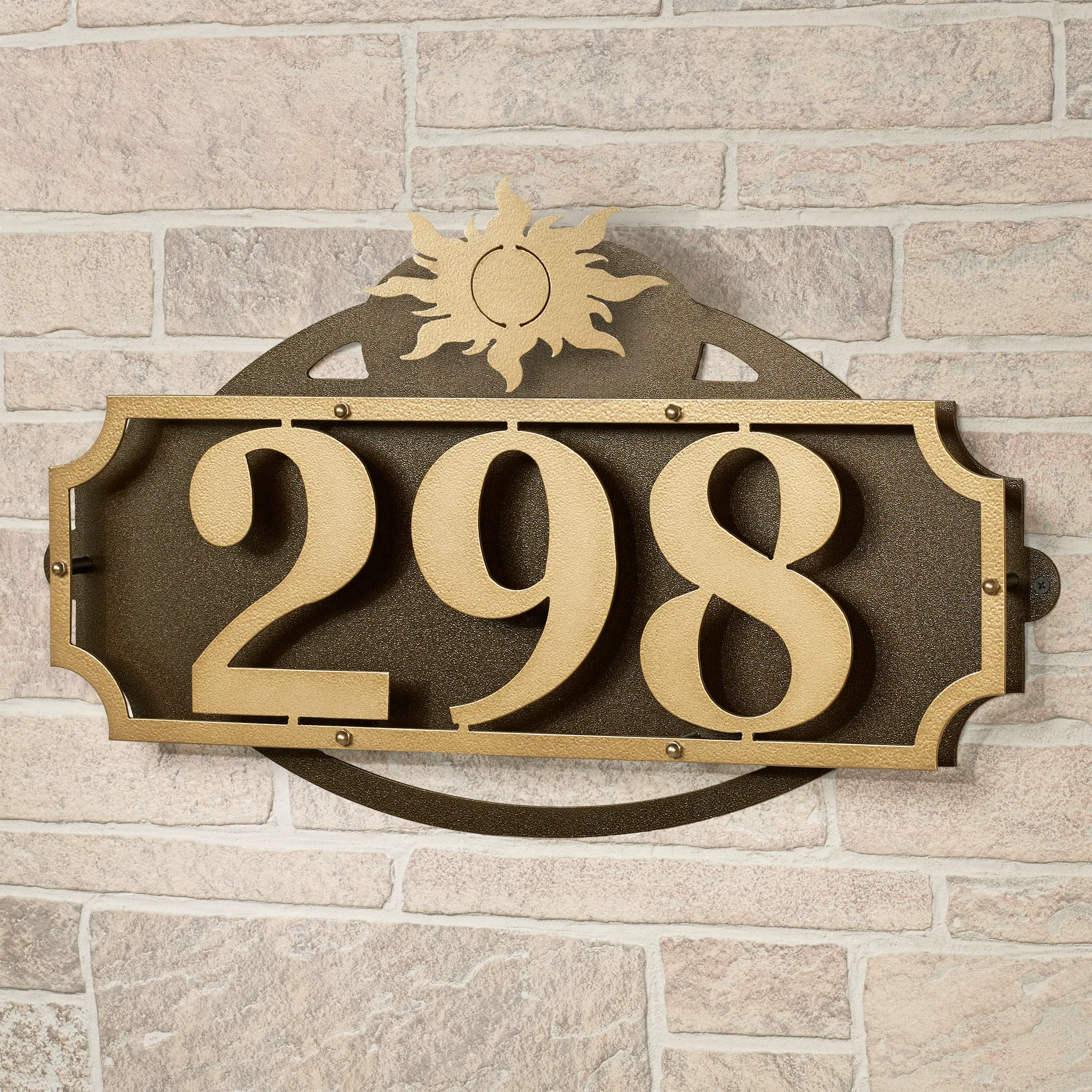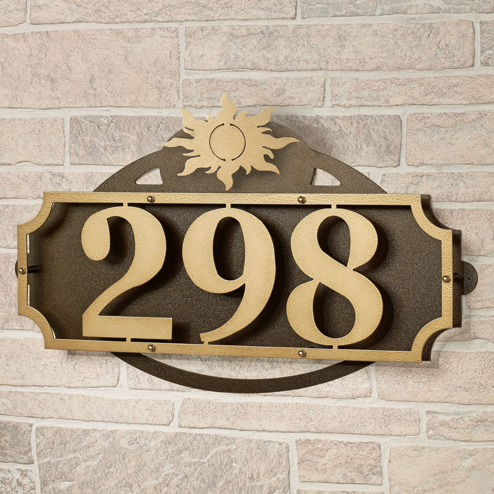 For an elegant look outdoors, place the La Casa Sun House Number Wall Address Sign near your entryway and display your address numbers with pride. Handcrafted of precision-cut, 14-gauge steel, this sign has a powder-coated finish that is UV-, weather-, and tarnish-resistant. The arched backplate is 13"H. The address sign, the 6"H numbers, and the decorative accent at the top have a gold finish. Outdoor year-round use. Overall, wall address sign measures 21"Wx1.5"Dx13"H. (C)2015 Touch of Class(R).