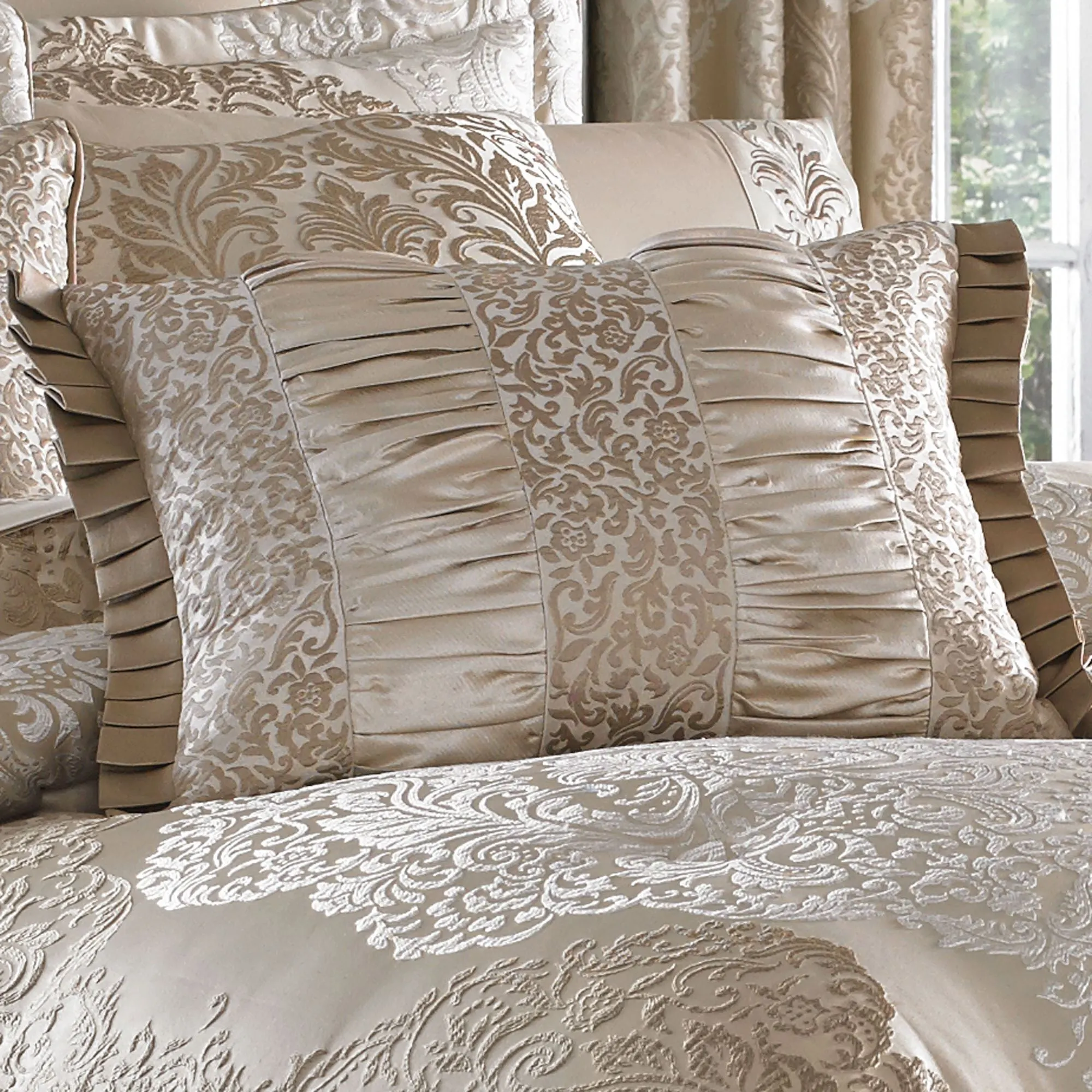 Pillows: Spot clean. The Framed Piped 18" Square has a fawn center with a mitred, pieced frame of coordinating latte scrolling leaves and florals on fawn. The Medallion Piped 20" Square is fawn with a latte medallion design; pillow reverses to an ivory medallion on fawn. Pieced Rectangle features alternating columns of ruched fawn and coordinating latte scrolling leaves and florals on fawn, finished with pleated flange on the length ends.