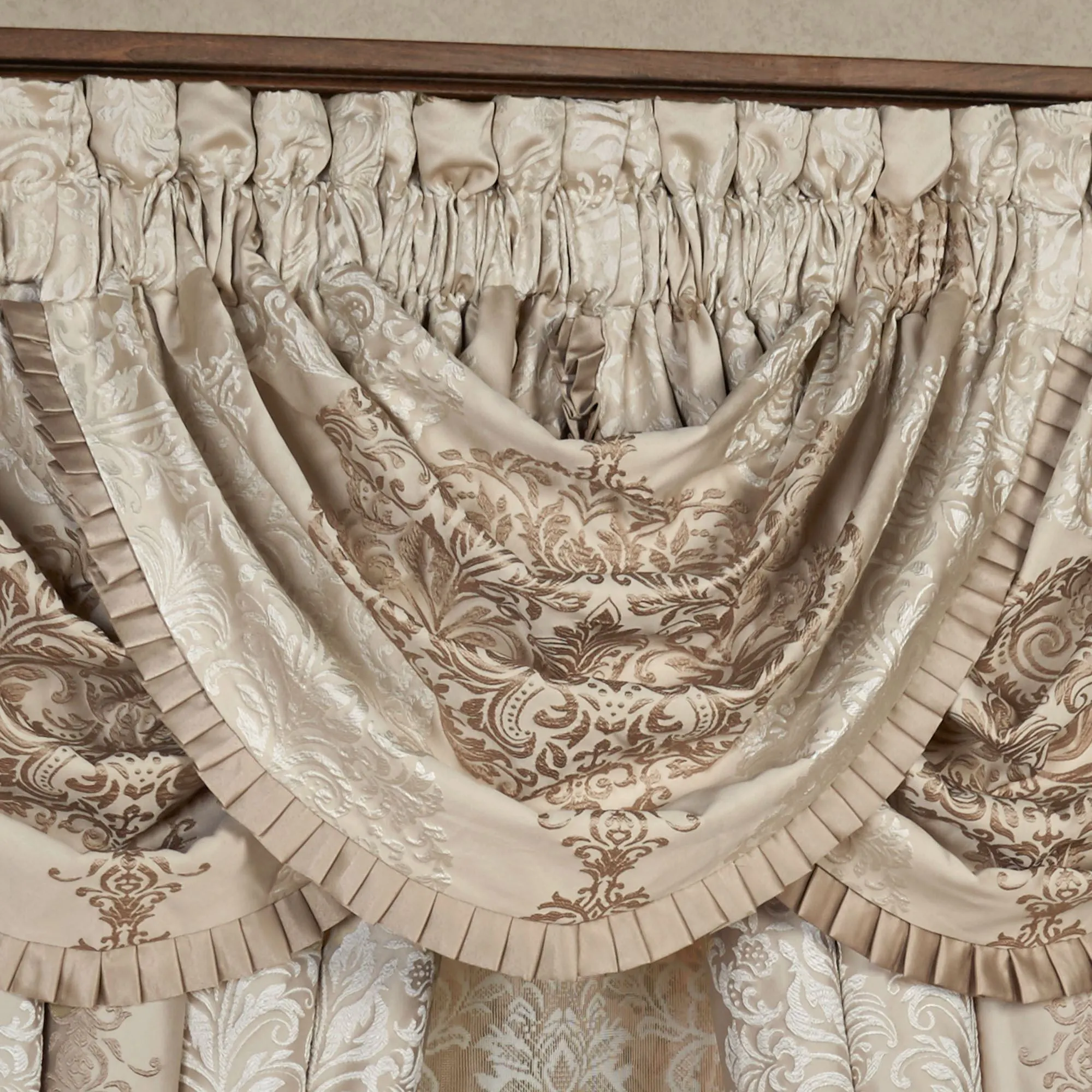 Window Treatment: Curtain Pair: 96"Wx84"L or 100"Wx95"L. Curtains have a 3" rod pocket. Each Waterfall Valance measures 49"Wx33"L; 3.25" rod pocket. We recommend one valance for every 12"-15" of window width.