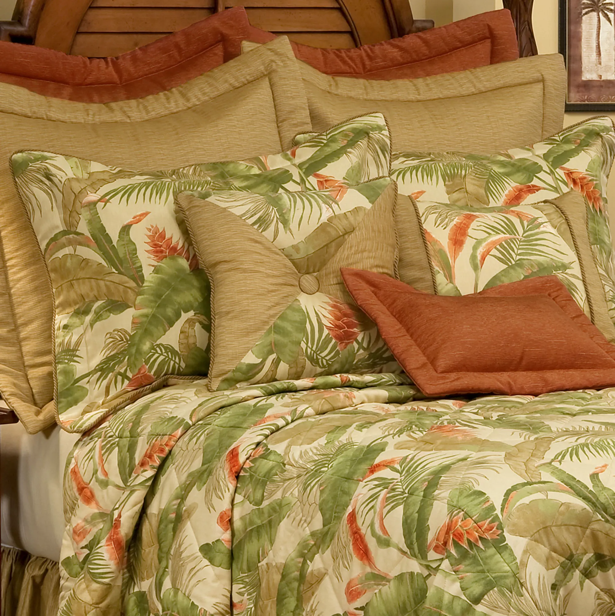 Deep within the rain forests, La Selva II stands as a tropical oasis, a home and haven to abundant wildlife and thriving greenery. This cotton tropical bedding ensemble combines shades of jungle green, loden, fern, vermillion, dark vermillion, light cream, light brown, amber, caramel, and light gold.