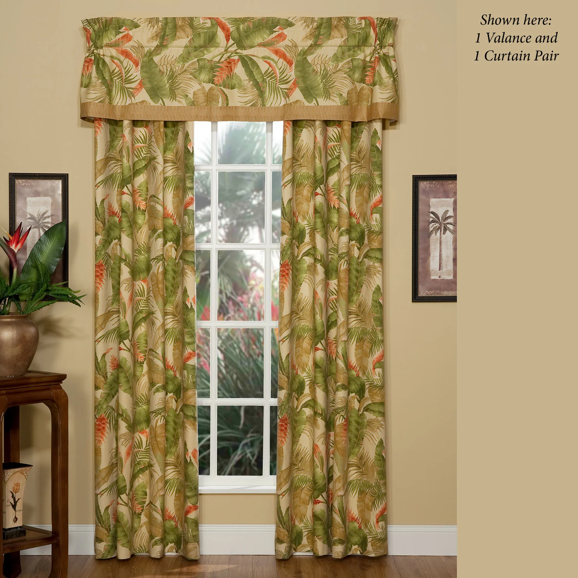 Tailored, lined Window Treatment has the tropical pattern and 3" rod pockets. Wide Curtains are available. Valance is pieced with a grassy band on the bottom edge.