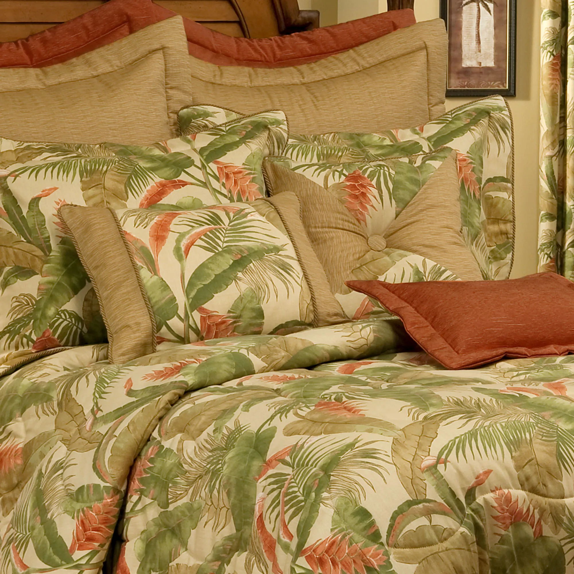 Deep within the rain forests, La Selva II stands as a tropical oasis, a home and haven to abundant wildlife and thriving greenery. This cotton tropical bedding ensemble combines shades of jungle green, loden, fern, vermillion, dark vermillion, light cream, light brown, amber, caramel, and light gold.