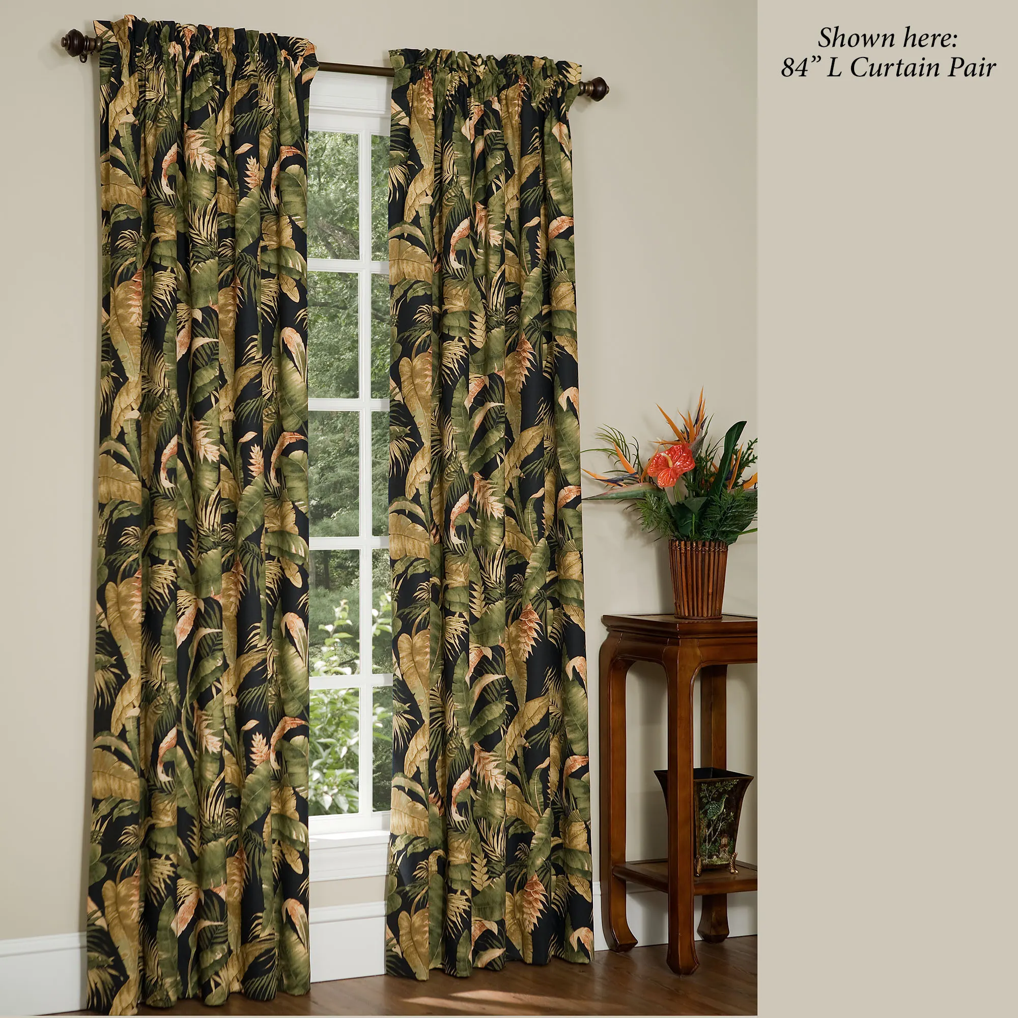 Lined, tailored Window Treatments are cotton with tropical leaves and 3" rod pockets. Wide Curtains are sold as a pair. Tailored Valance has a square-patterned bottom band. Tie-Up Valance contains a square-patterned bottom and two attached ties.