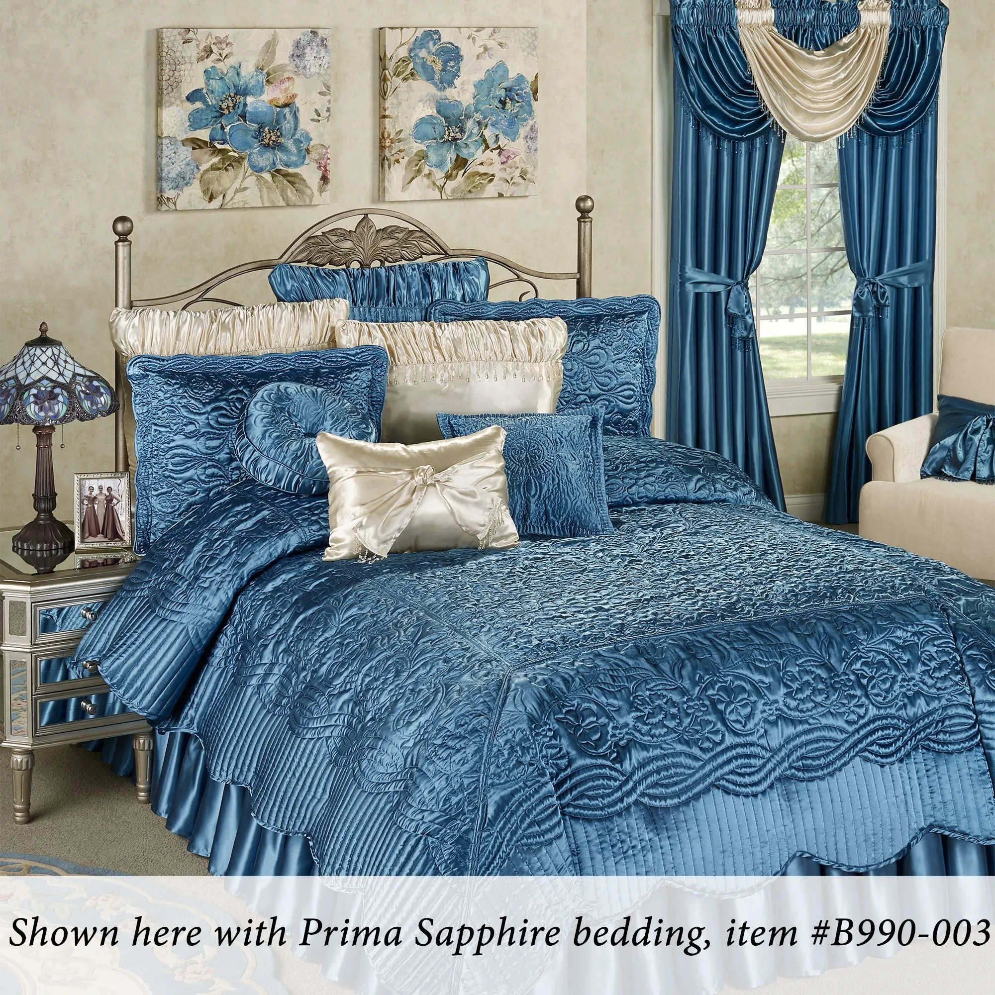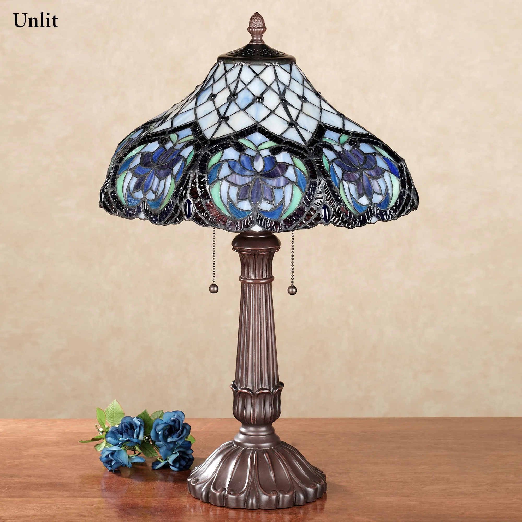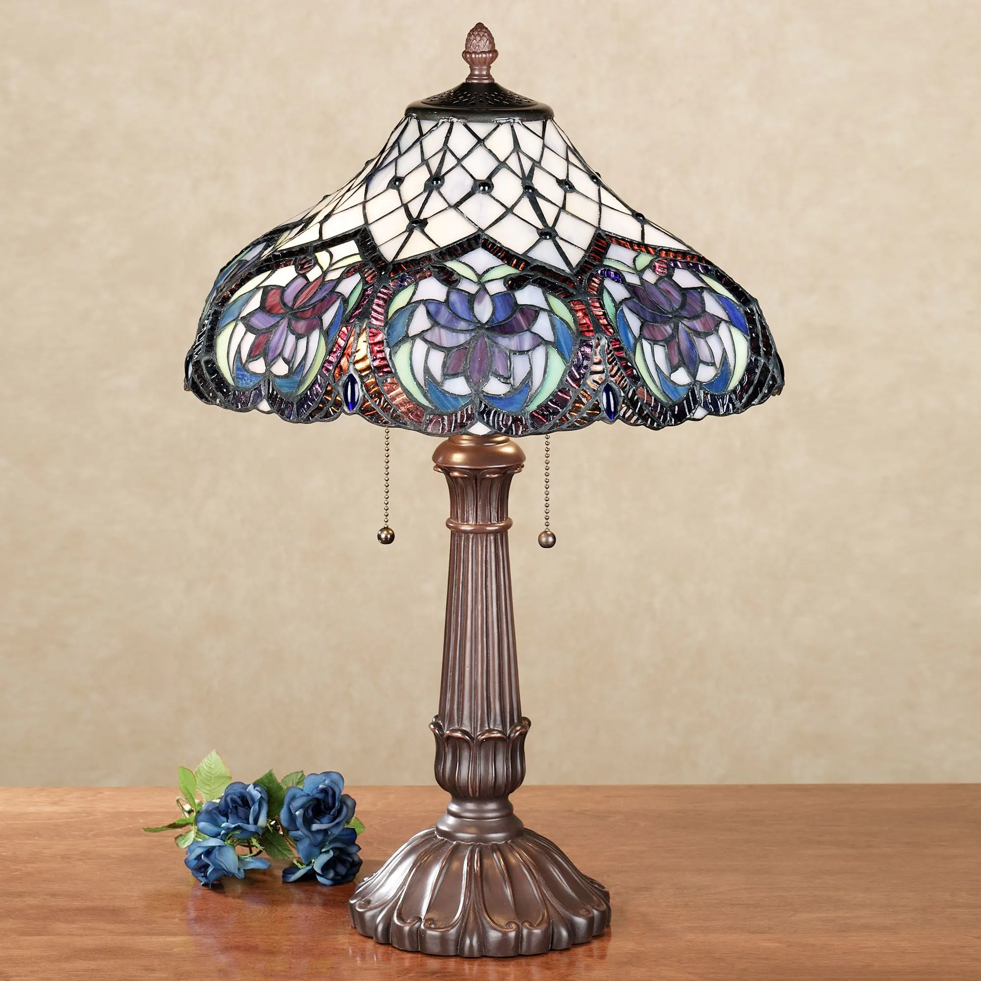 The Lahela Stained Glass Table Lamp displays exotic floral blossoms with graceful elegance. The handcrafted, hand-cut, and hand-soldered stained art glass shade, approx. 17" dia., features sapphire jewel accents and includes the colors of periwinkle blue, purple, green, and ivory. Font is resin and has a bronze finish. UL listed. Requires two 60W max. bulbs. Overall, table lamp measures 24"H, including the 1.5"H finial; weighs 10 lbs.