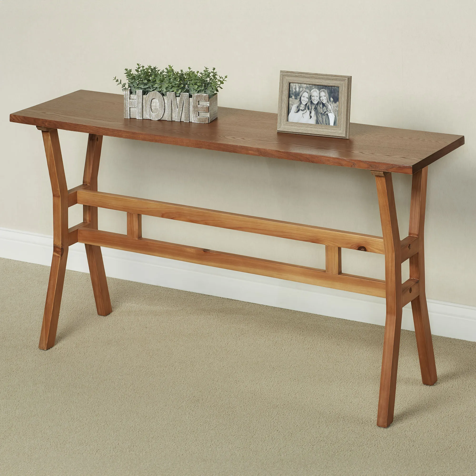 The extra-long length of the Landon Console Table can be put to good use. This wooden console table has a windsor oak finish, a woodgrain top, a double support bracket, and a unique leg design. The table can hold up to a 65" flat screen TV. Measures 57.5"Wx16"Dx29.5"H; weighs 18 lbs.