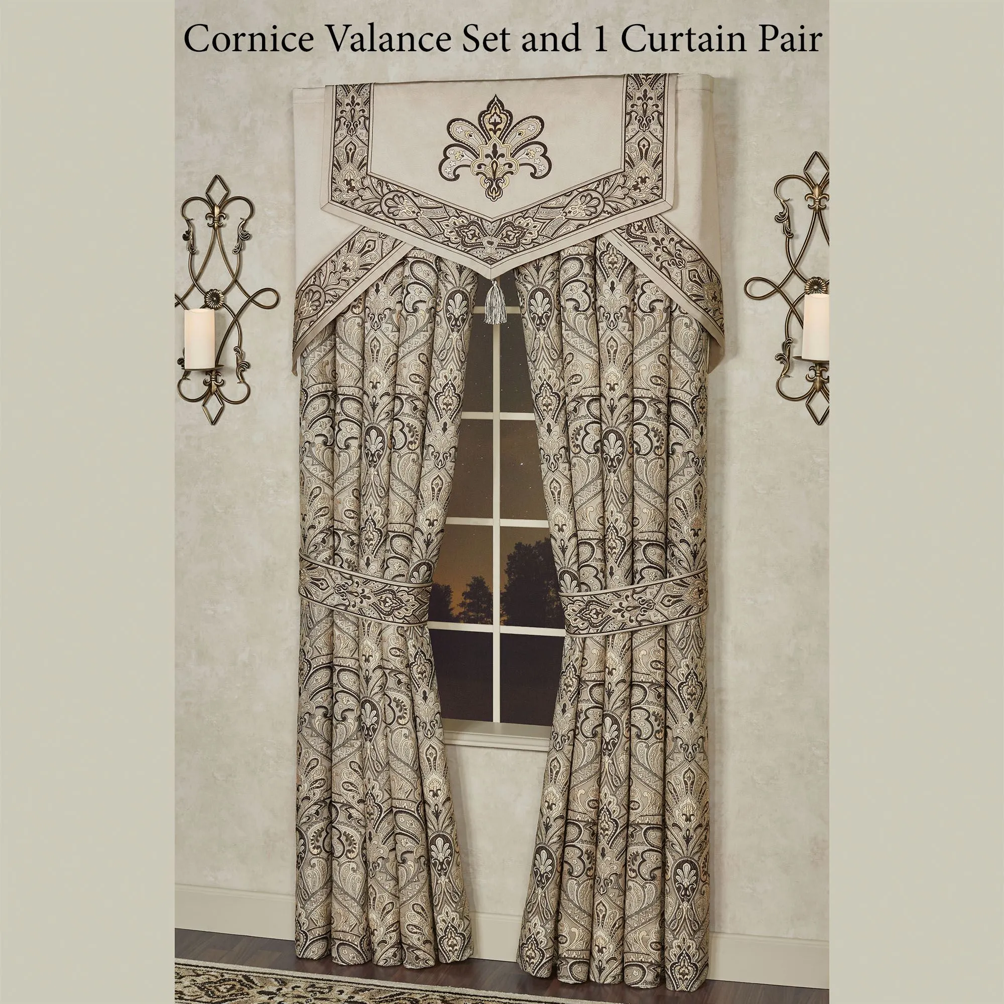 Window Treatments are lined. Wide Curtain Pair has tailored edges, 3" rod pockets, and tiebacks. The three-piece Cornice Valance Set includes one center and two sides. Cornice valances are solid with damask trim. Center has an embroidered medallion and a tassel accent. Rod pockets are 1.5". Scalloped Valance has a damask top, solid bottom, gimp trim accent, and 3" rod pocket.