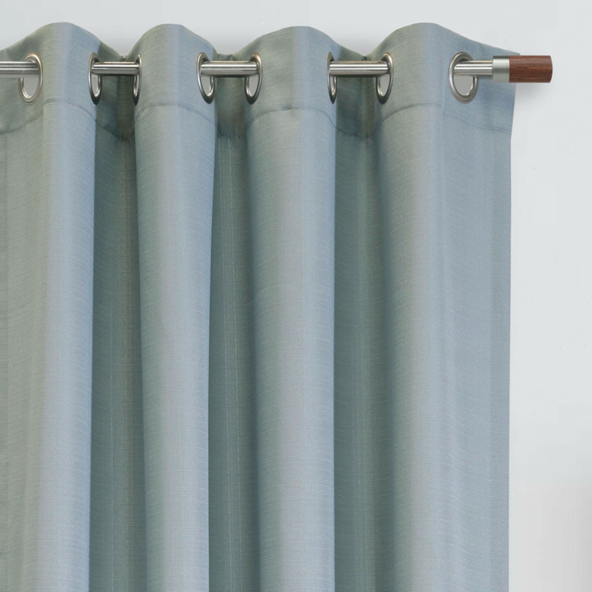 The soft blue tone of the Langford Grommet Curtain Panel soothes a space. With a subtle woven texture, the polyester window panel hangs via the 1.5" dia. matte silver-finished metal grommets. Sold individually, each panel measures 52"W. Machine washable. Imported.