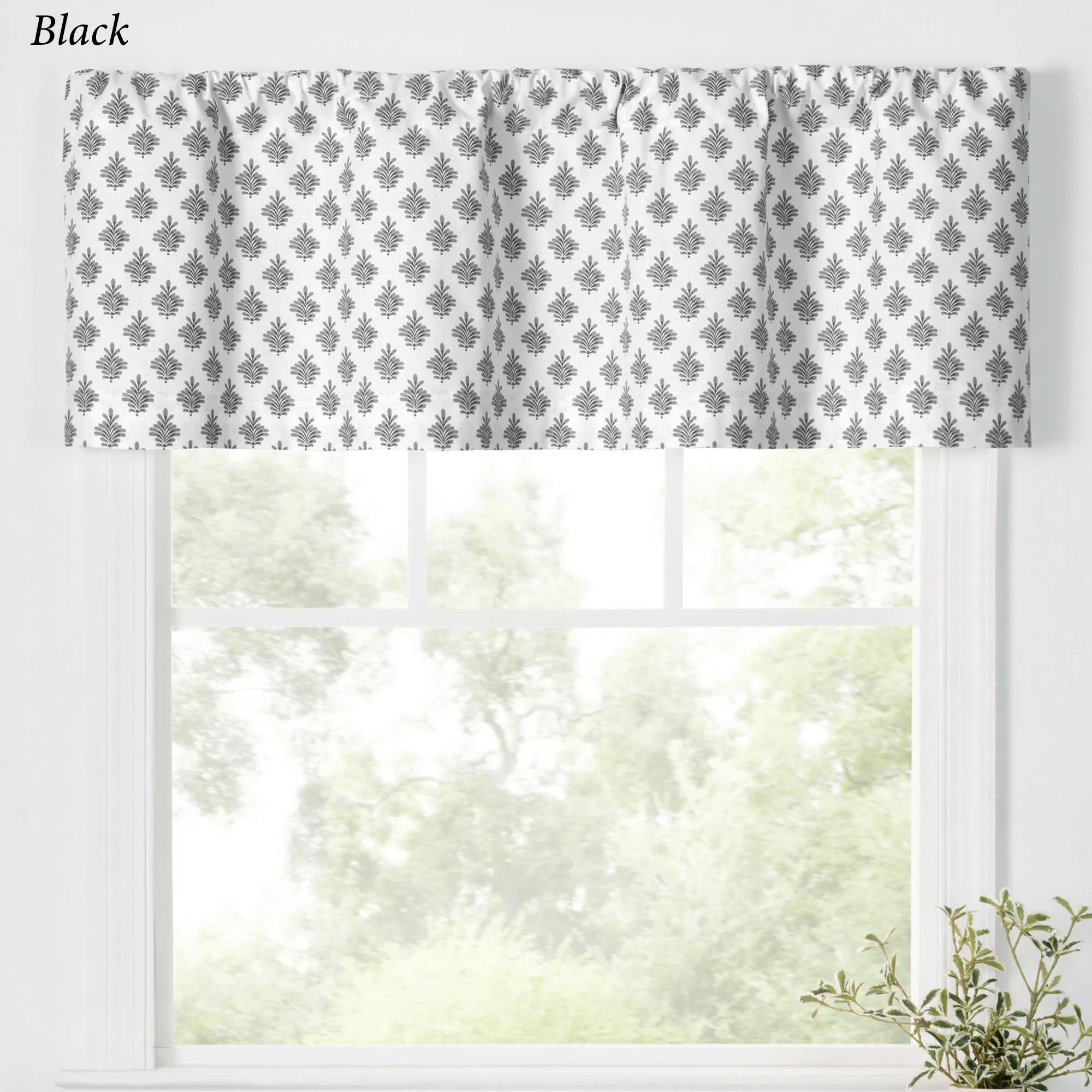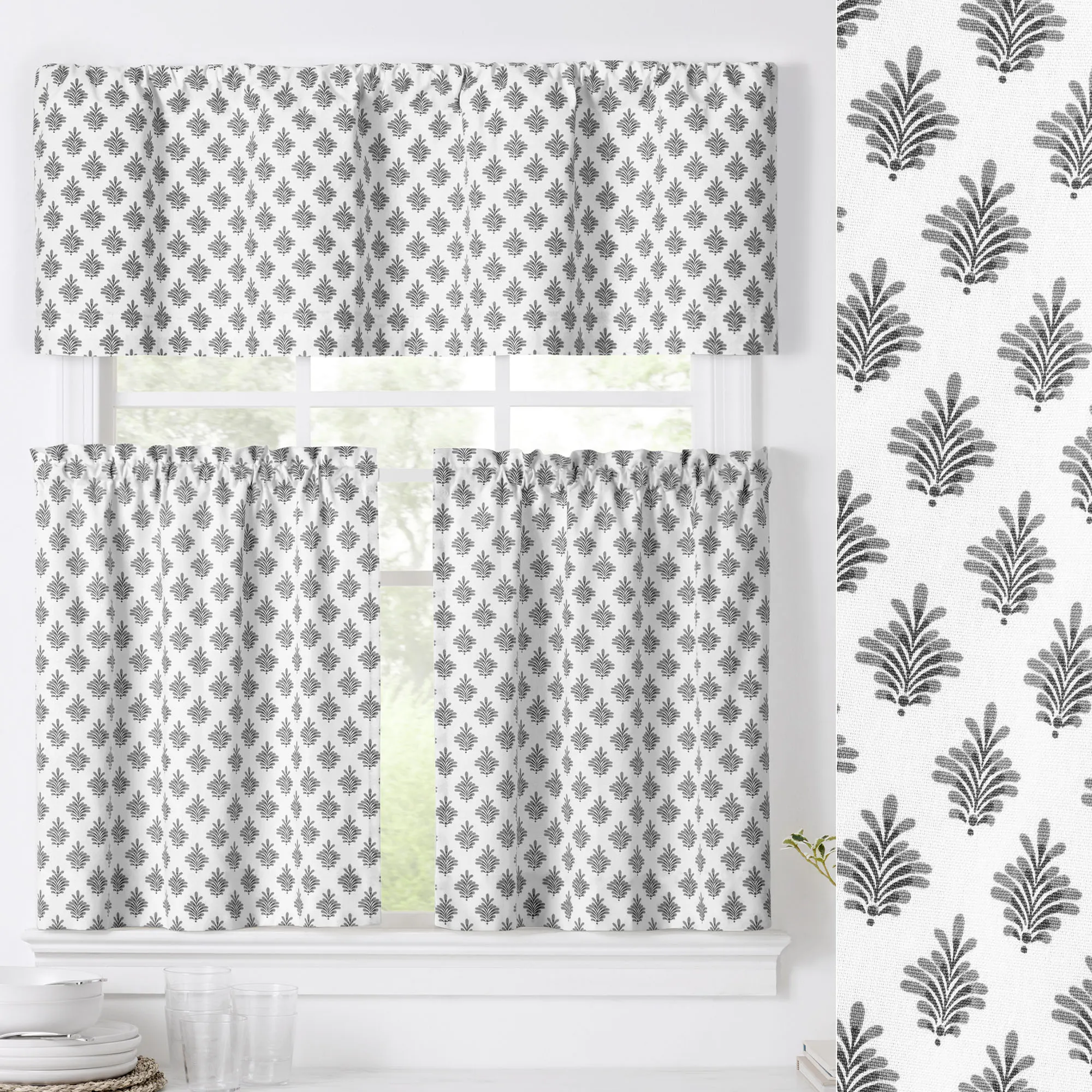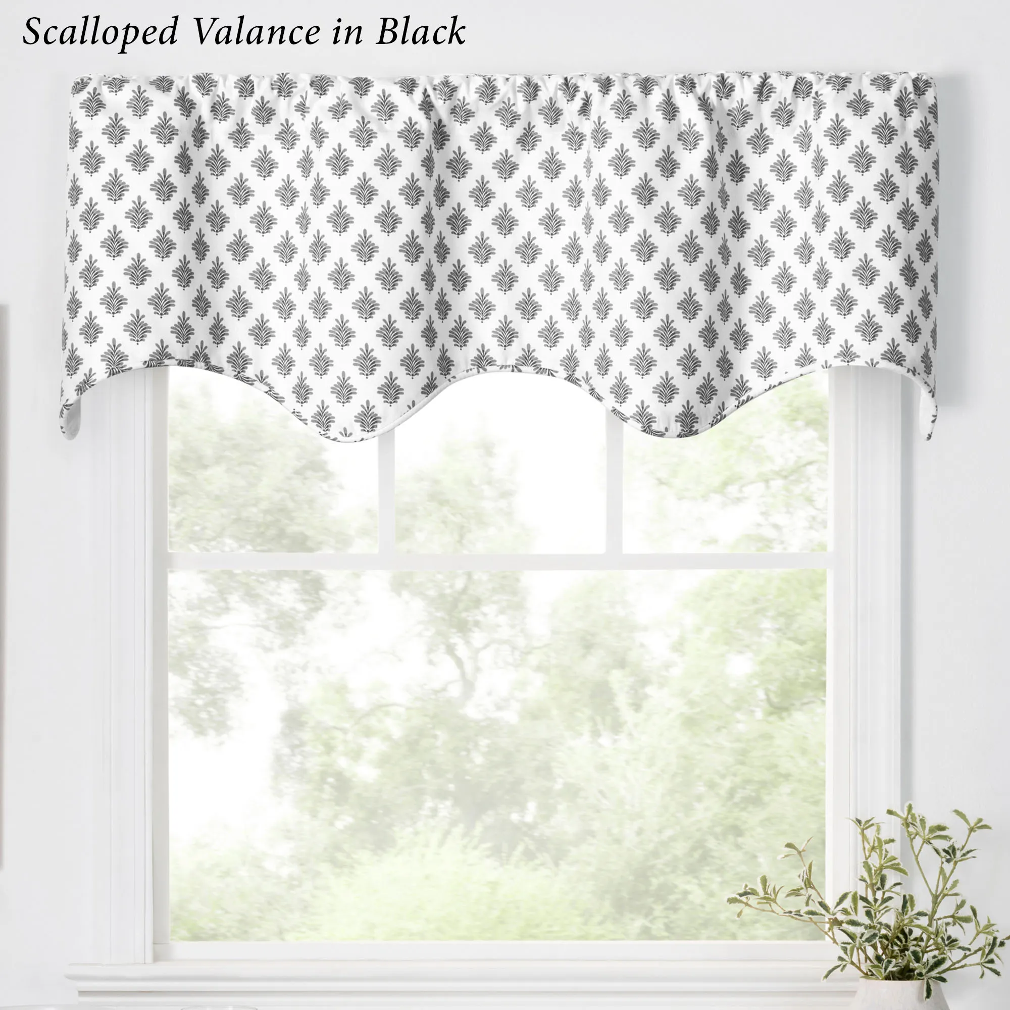A fanning fleur pattern flourishes with charm on the Lanigan Tier Window Treatment. This cotton window treatment has an all-over design on white. Specify Tier Pair, Tailored Valance, or Scalloped Valance. Tier Pair has a 1.5" rod pocket and measures 50"W. Tailored Valance has a 3" rod pocket and measures 50"Wx16"L. Scalloped Valance has a 3" rod pocket and a polyester/cotton lining; measures 50"Wx16"L. Machine washable.
