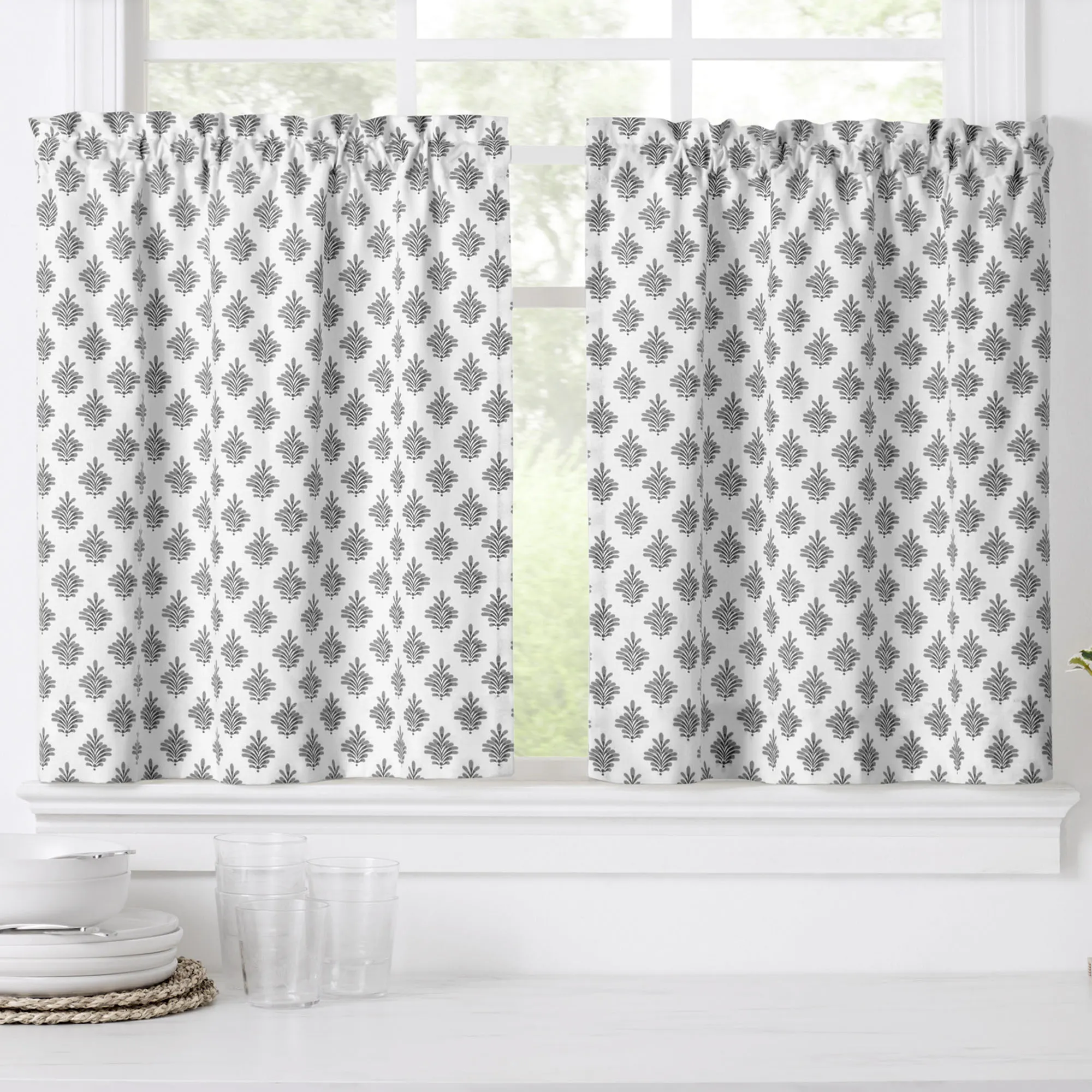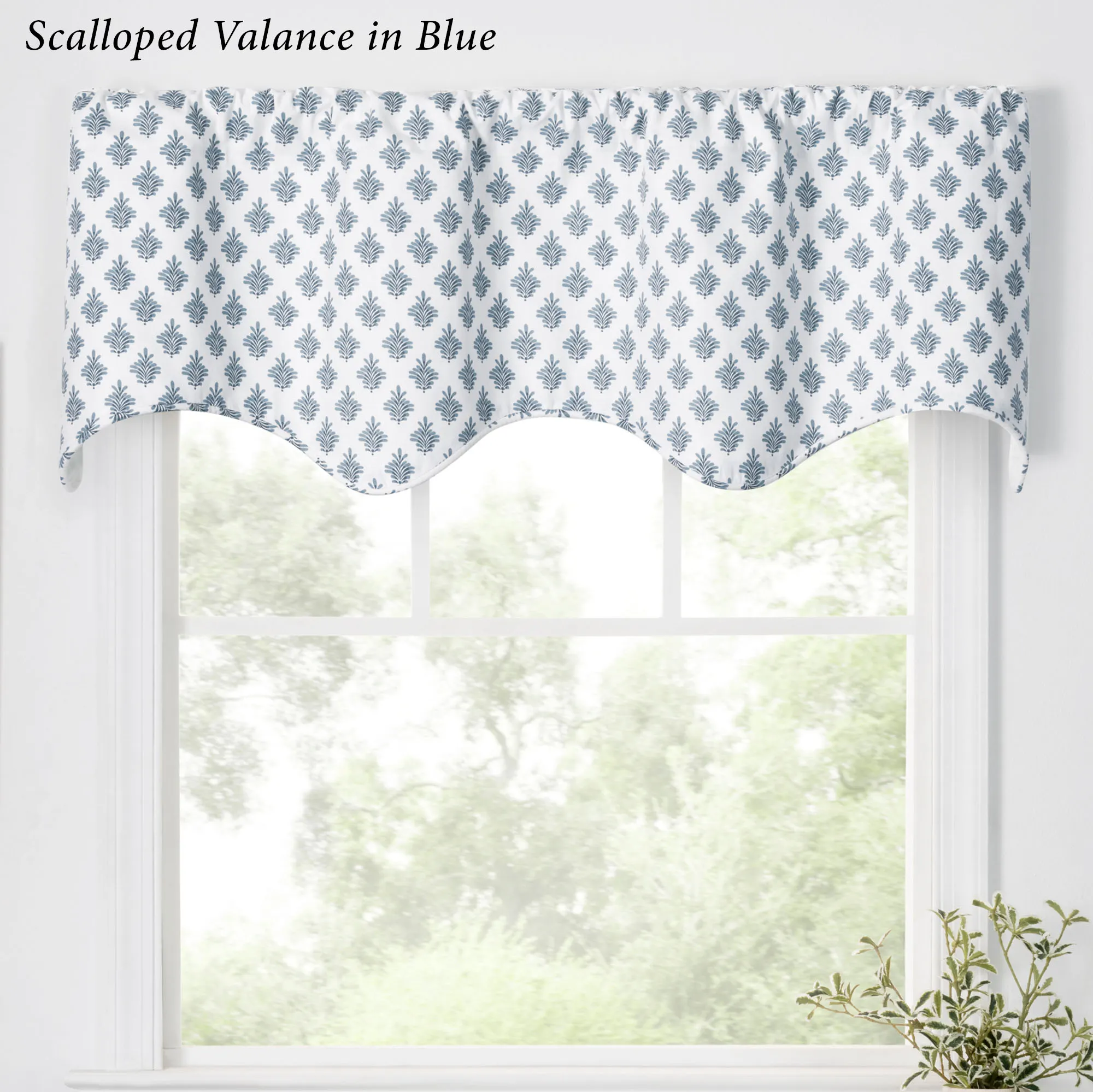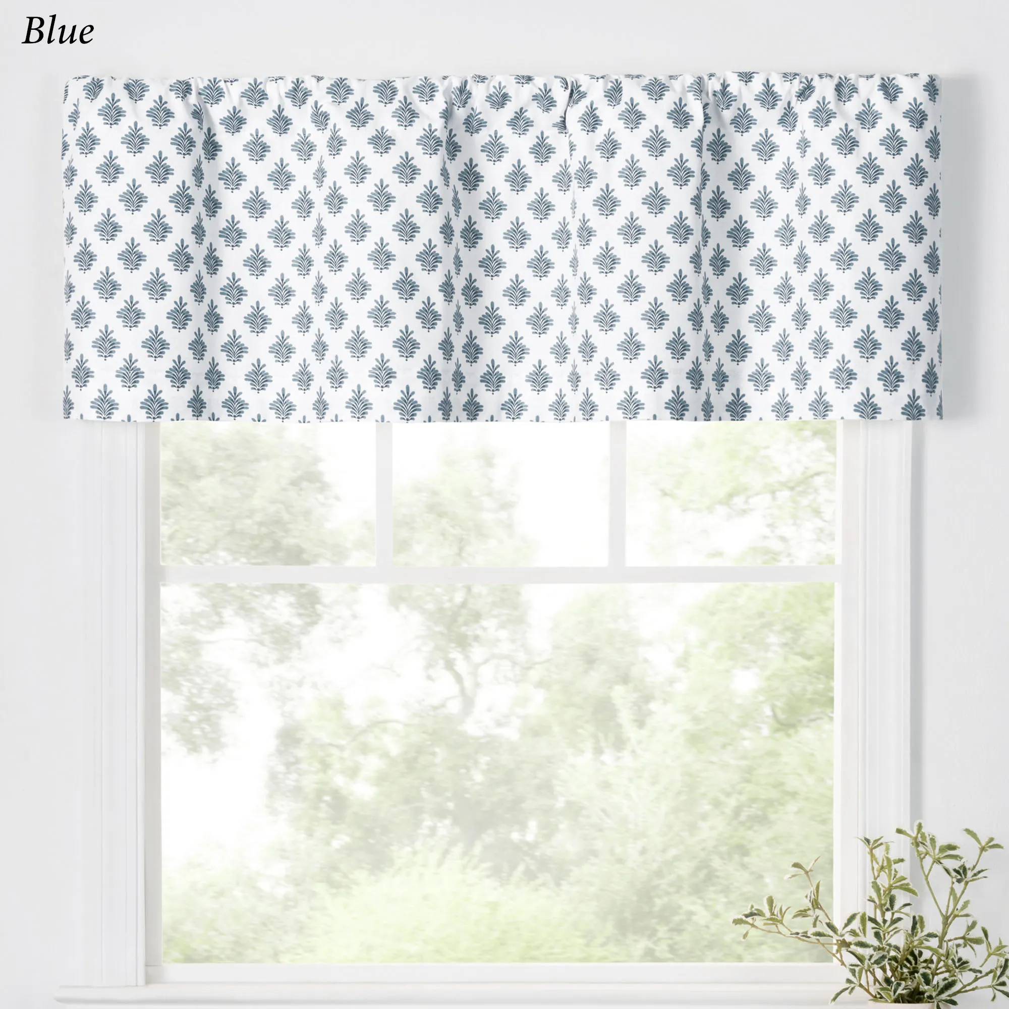 A fanning fleur pattern flourishes with charm on the Lanigan Tier Window Treatment. This cotton window treatment has an all-over design on white. Specify Tier Pair, Tailored Valance, or Scalloped Valance. Tier Pair has a 1.5" rod pocket and measures 50"W. Tailored Valance has a 3" rod pocket and measures 50"Wx16"L. Scalloped Valance has a 3" rod pocket and a polyester/cotton lining; measures 50"Wx16"L. Machine washable.