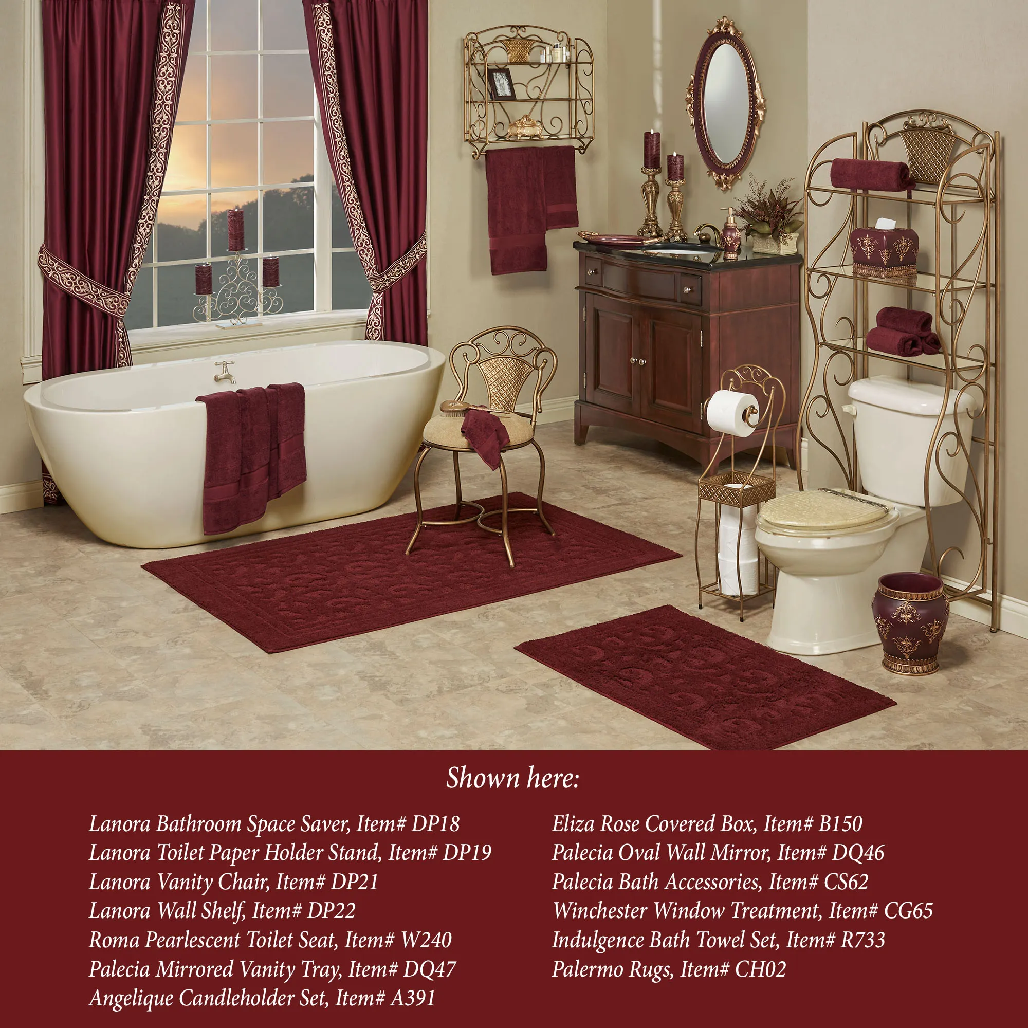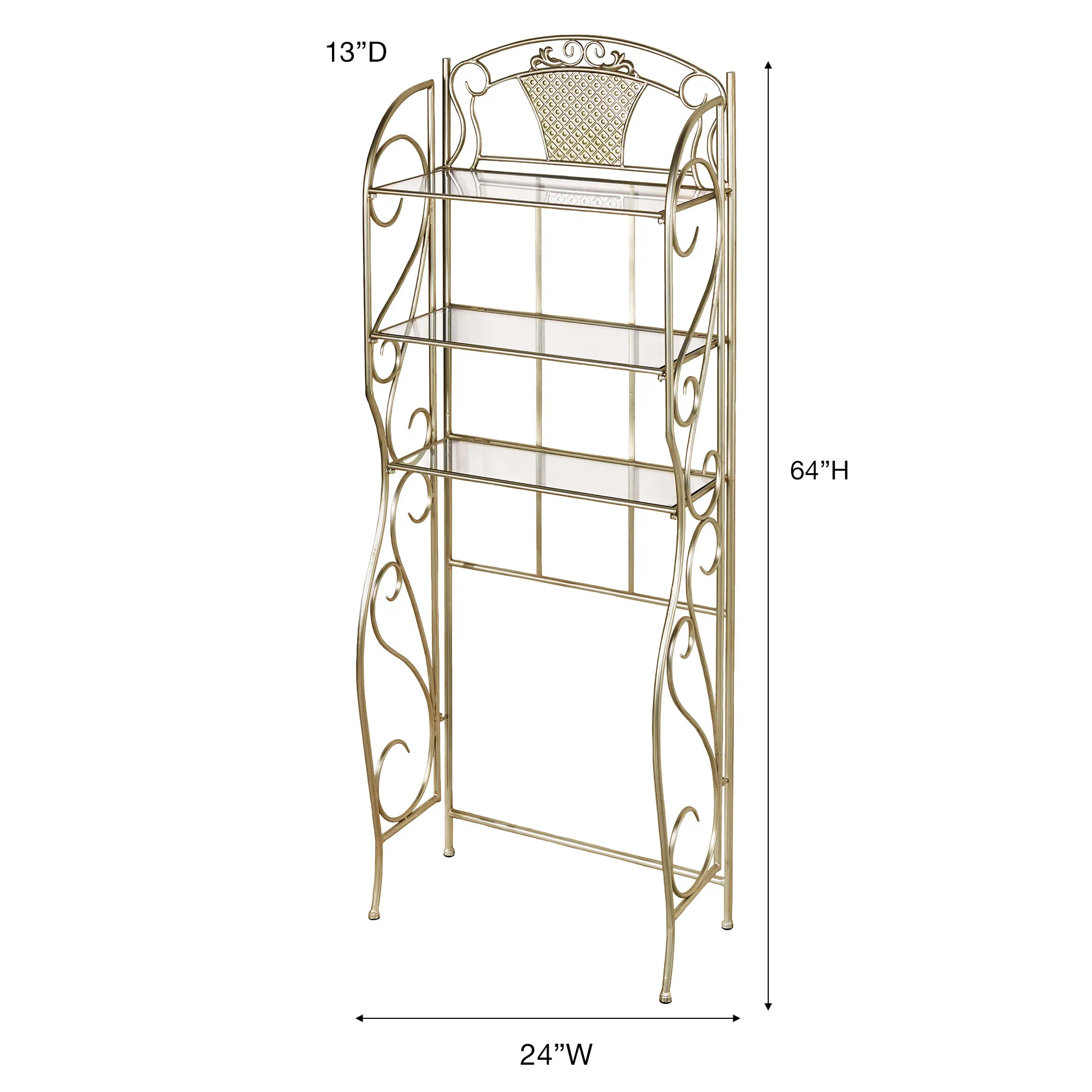 The Lanora Platinum Bathroom Space Saver provides stylish storage with a scrolling flourish. In a powder-coat finish, the openwork metal design features elegant scrollwork, dimensional diamond detailing, and three glass shelves. The two larger shelves measure 22"Wx9"D each; the lower shelf measures 22"Wx7"D. Perfect for adding storage over a toilet or laundry hamper, the shelving unit measures 24"Wx13"Dx64"H and weighs approx. 26 lbs.