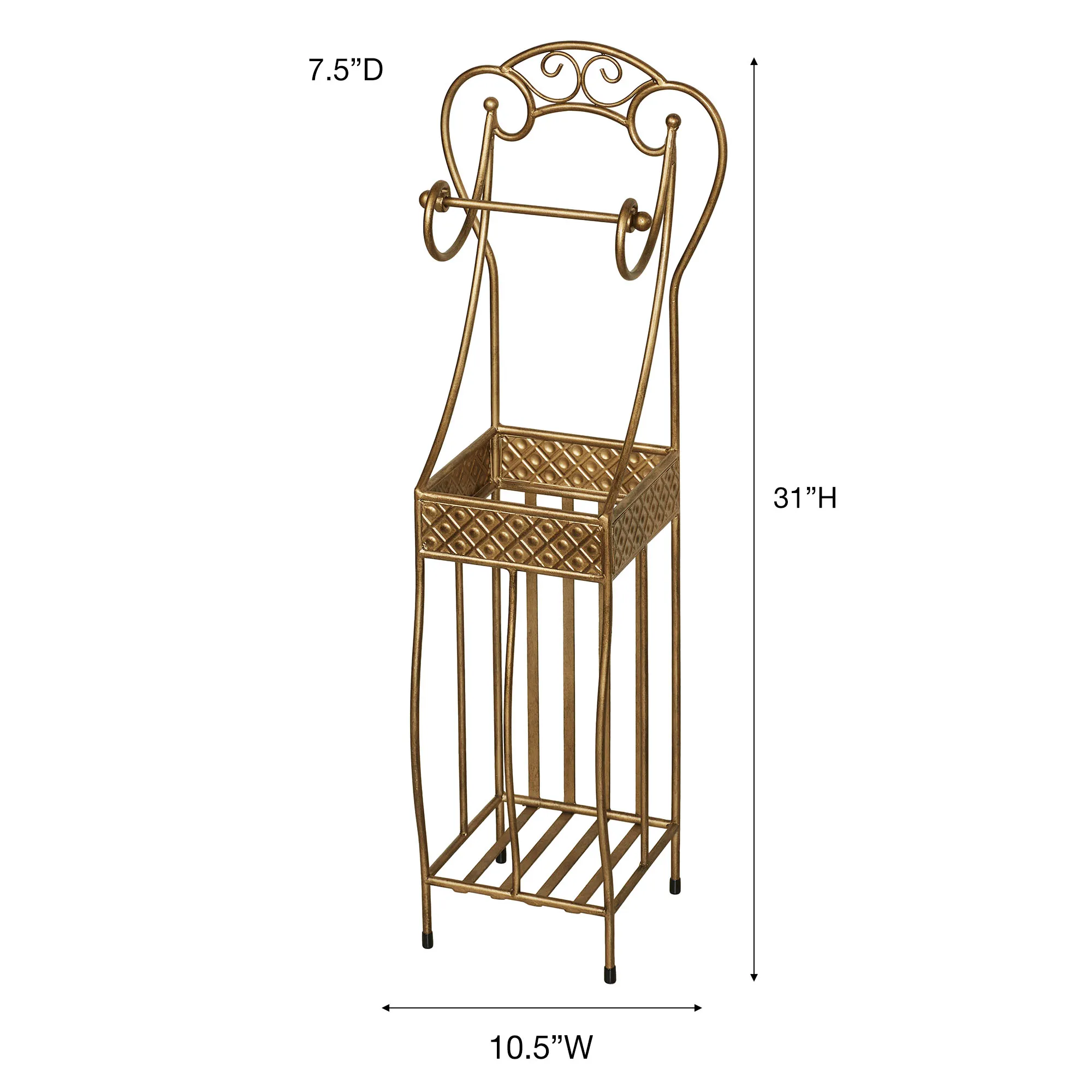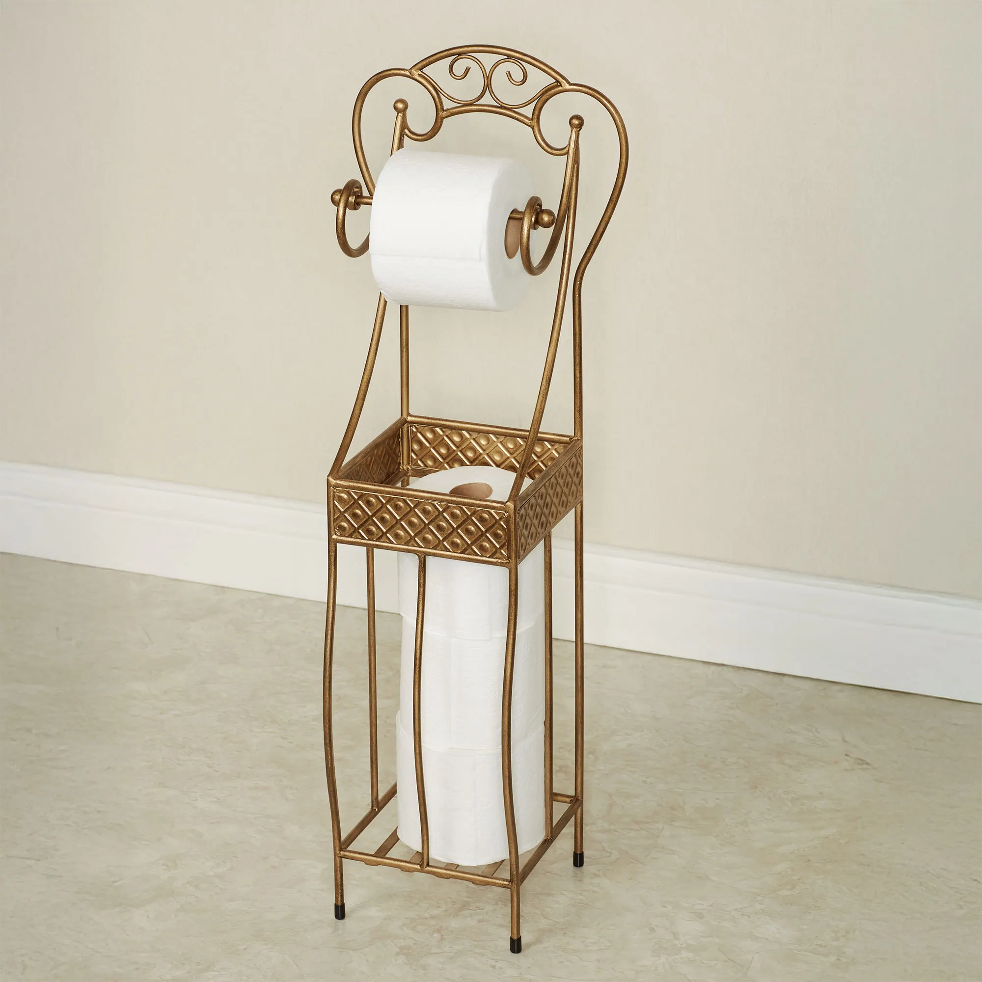 The Lanora Aged Gold Toilet Paper Stand provides stylish storage with a scrolling flourish. In a powder-coat finish, the openwork metal design features an elegant scrollwork topper, curved arms with a removable bar to hold your toilet paper roll, a decorative diamond band, and lower storage for three extra rolls. Overall, the toilet paper stand and storage accent measures 10.5"Wx7.5"Dx31"H.