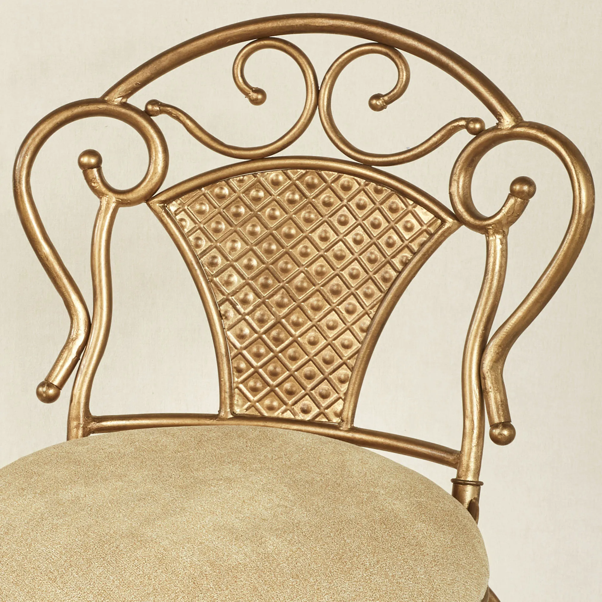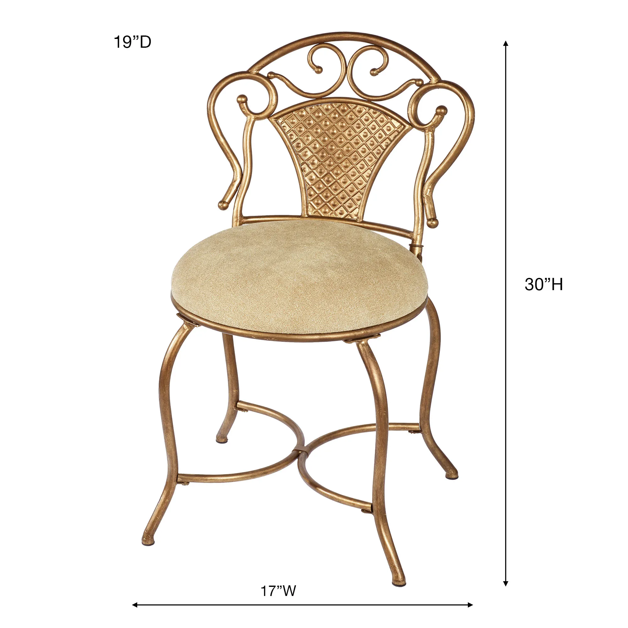 The Lanora Aged Gold Vanity Chair provides stylish seating with a scrolling flourish. In a powder-coat finish, the metal frame features openwork scroll detailing and a dimensional diamond-inset seat back. The 16" dia. polyurethane foam-filled cushion has buff-colored microsuede upholstery; seat height is 19". Perfect for a bathroom, vanity, or dressing area, the chair measures 17"Wx19"Dx30"H overall. Spot clean the fabric.