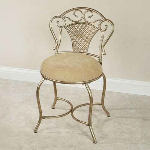 The Lanora Platinum Vanity Chair provides stylish seating with a scrolling flourish. In a powder-coat finish, the metal frame features openwork scroll detailing and a dimensional diamond-inset seat back. The 16" dia. polyurethane foam-filled cushion has buff-colored microsuede upholstery; seat height is 19". Perfect for a bathroom, vanity, or dressing area, the chair measures 17"Wx19"Dx30"H overall. Spot clean the fabric.