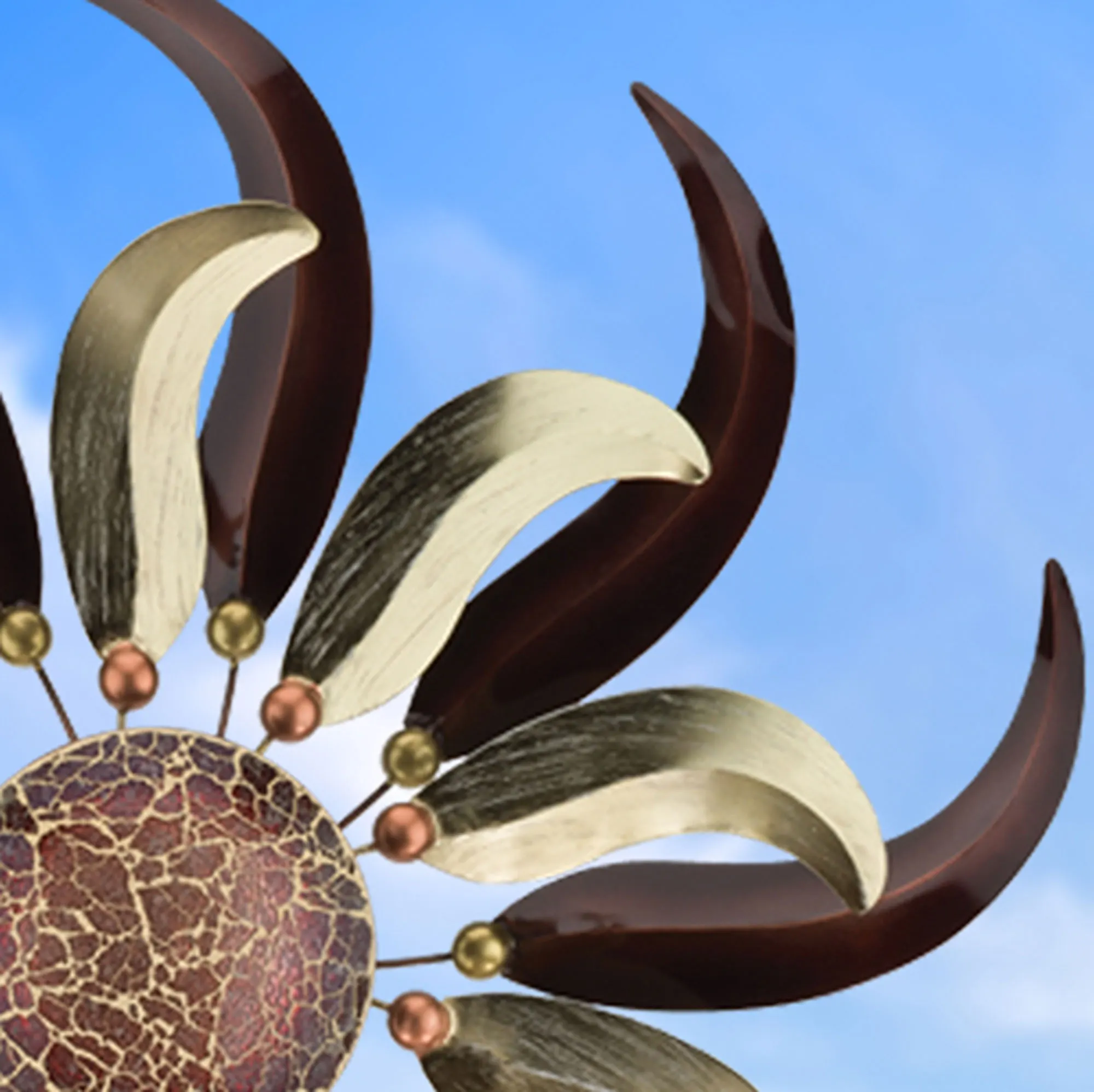 When gentle breezes blow, the durable Lariander Wind Spinner mesmerizes all who watch it. This metal wind spinner is fade- and weather-resistant and has large bronze and gold blades that spin in different directions. The burgundy and gold mosaic disc in the center is made of glass. Place into the ground using the sturdy five-prong ground stake. Outdoor year-round use. Measures 32"Wx9"Dx82"H.