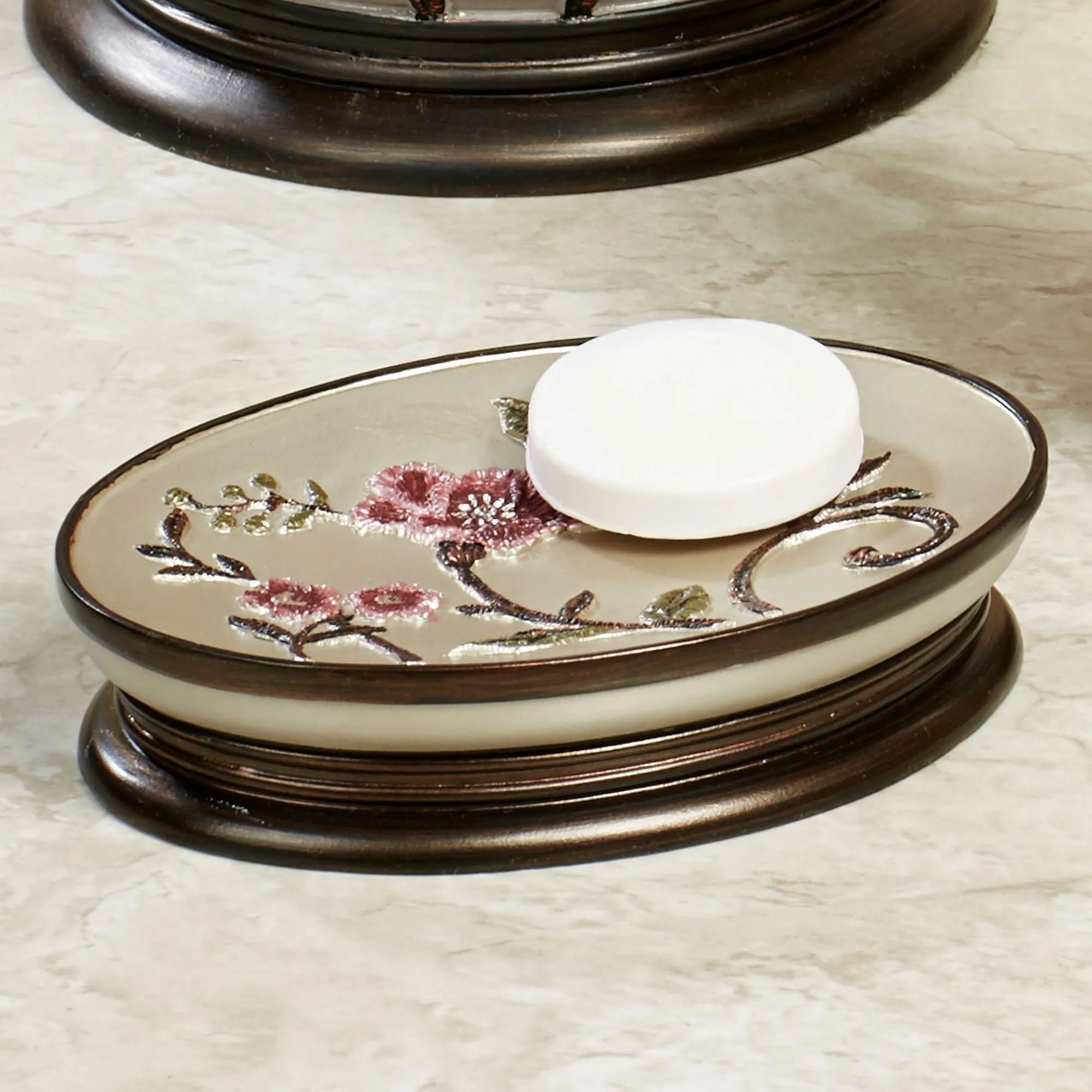 • Bath accessories have a raised floral design