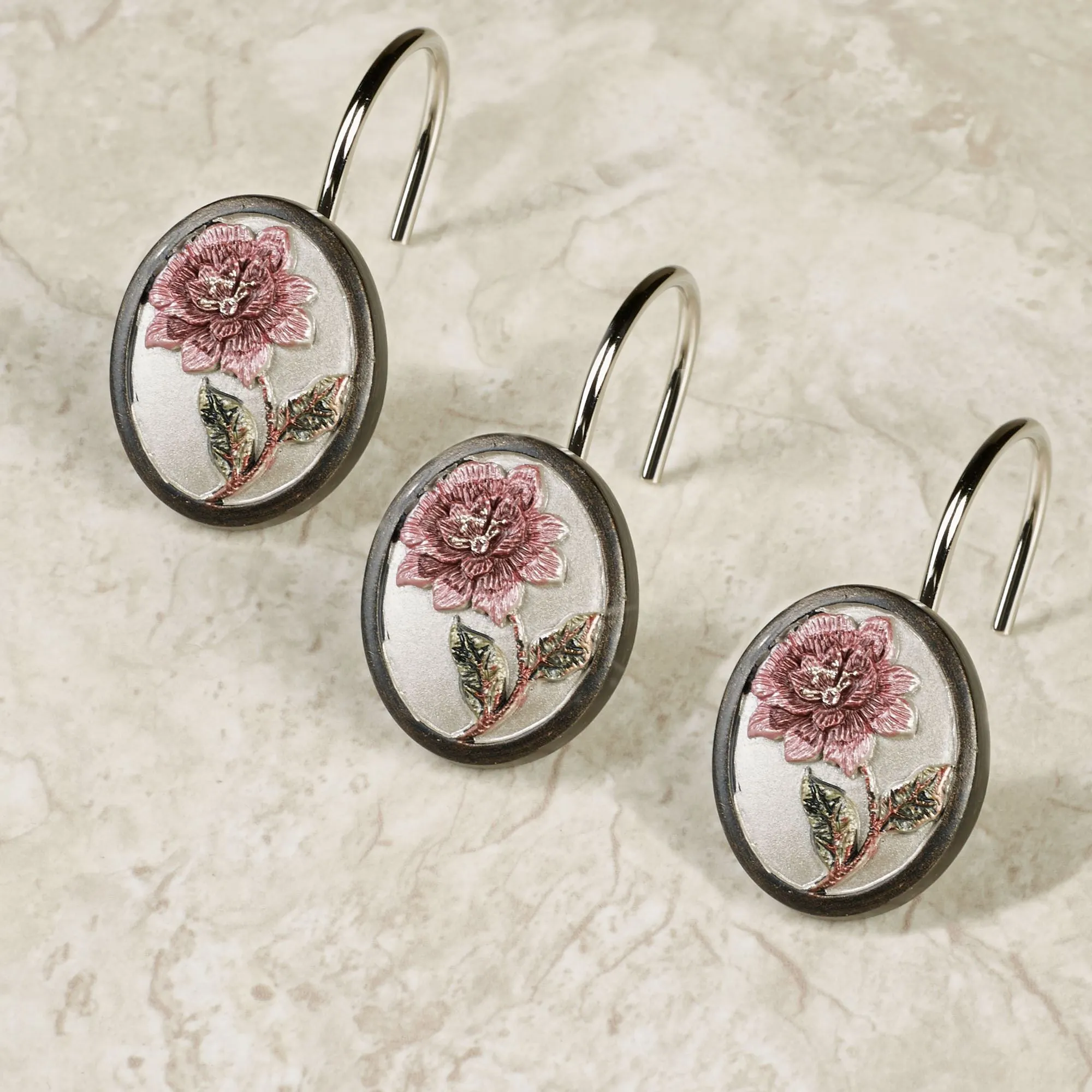 Sheer elegance embellishes your routine from the Larissa Shower Accessories as roses vine and bloom across your space. Each light taupe accent features shimmering rose wine and maroon blooms with sage leaves against bronze vines for a sophisticated and beautiful appeal. Shower Curtain has a sheer polyester fabric with embroidered designs. Shower curtain, 72"Wx72"L, is machine washable. A waterproof liner, not included, is recommended. Shower Hooks are sold separately in a 12-piece set. Shower hooks are resin medallions with raised designs and bronze-colored frames; each is 1.5"Wx2"Dx2.5"H. Imported.