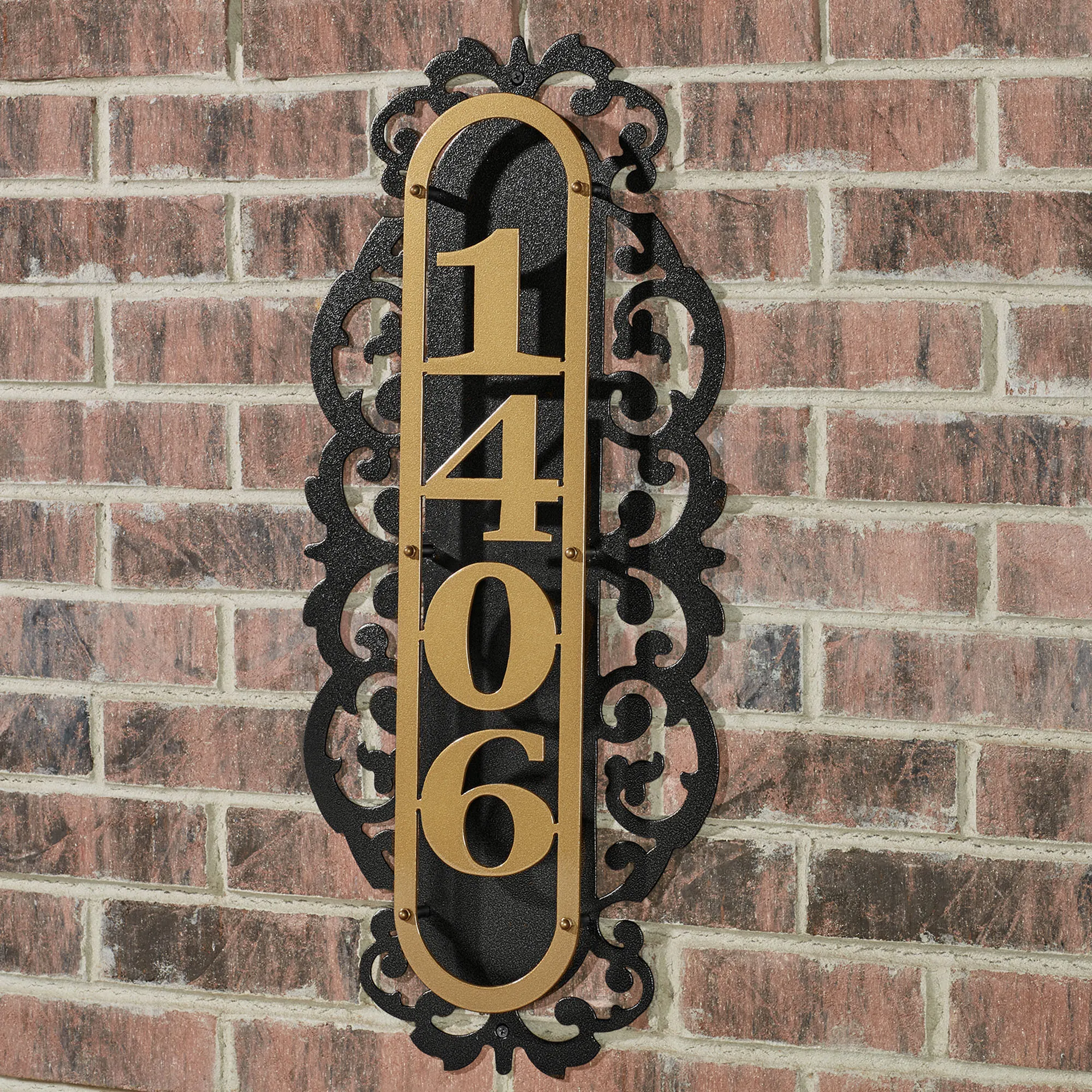 The decorative LaRoyal Vertical House Number Address Plaque will display not only your address but also the sophisticated tastes of those who reside inside. This elegant, precision-cut 14-gauge steel wall plaque, designed by JasonW Studios(R), features ornately cut swirls and scroll motifs in black that make the perfect background for the raised 4"H house number(s) in gold. Classy address plaque has a powder-coat finish and is UV-, weather-, and tarnish-resistant. Outdoor year-round use. The 1-3 numbers plaque is 12"Wx1.5"Dx20"H. The 4-5 numbers plaque is 12"Wx1.5"Dx27"H. Select house number range (1-3 or 4-5) and provide house number(s). (C)2012 Touch of Class(R).