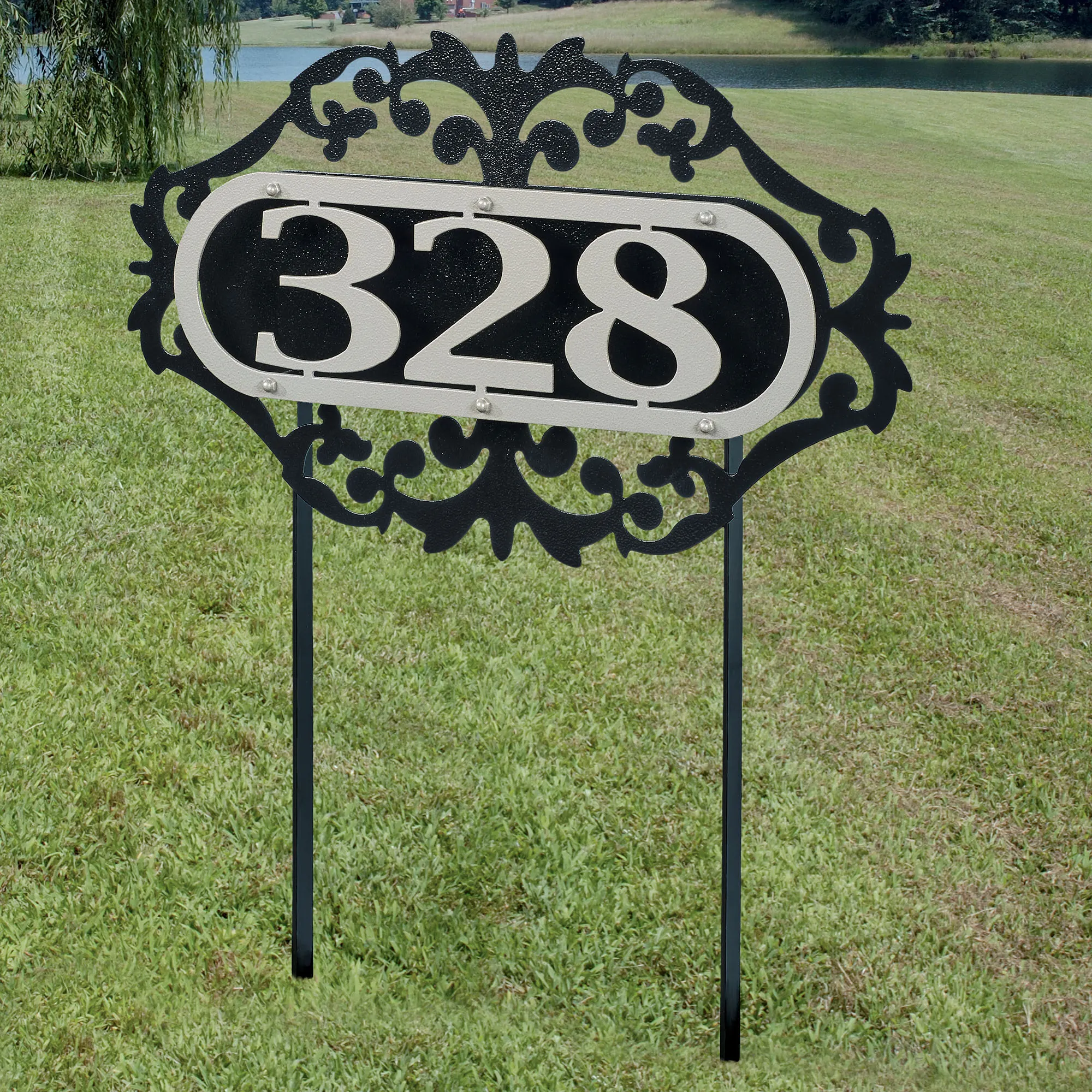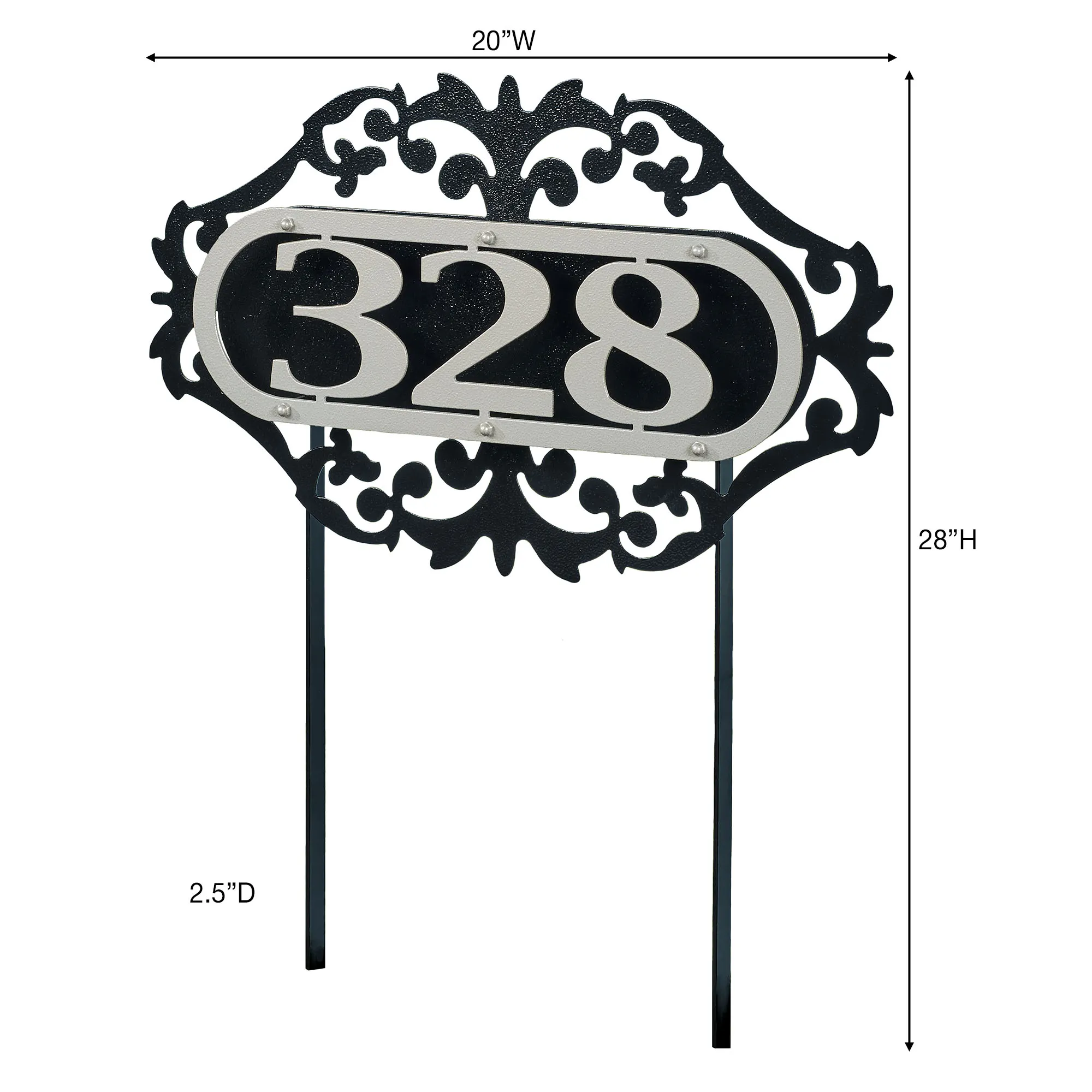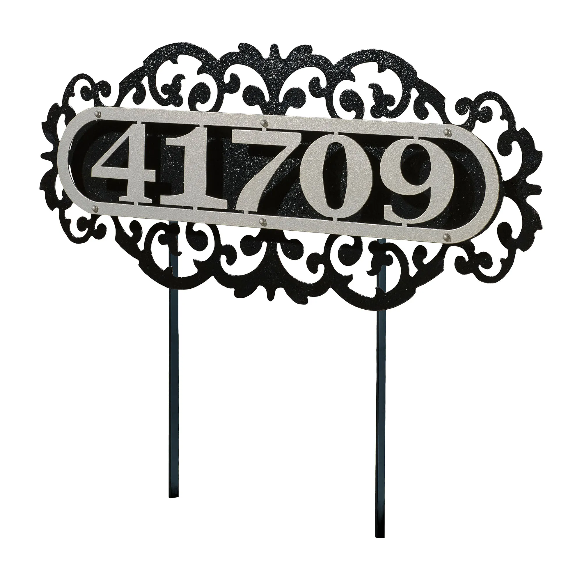 The decorative LaRoyal House Number Yard Address Stake will display not only your address but also the sophisticated tastes of those who reside inside. This elegant, precision-cut 14-gauge steel accent, designed by JasonW Studios(R), features ornately cut swirls and scroll motifs in black that make the perfect background for the raised 4"H house number(s) in silver. Classy accent has a powder-coat finish and is UV-, weather-, and tarnish-resistant. Outdoor year-round use. The 1-3 numbers yard stake measures 20"Wx2.5"Dx28"H. The 4-5 numbers yard stake measures 28"Wx2.5"Dx28"H. Select house number range (1-3 or 4-5) and provide house number(s). (C)2018 Touch of Class(R).