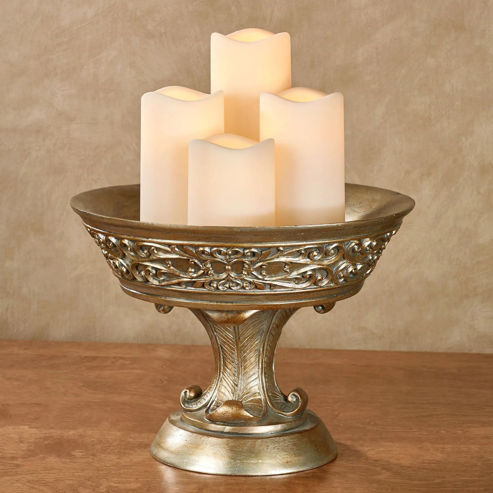Subtle hints of platinum and copper illuminate the refined aura and detailed scrolls of the Laryssa Decorative Centerpiece Bowl. Handpainted in champagne gold, the resin accent features a shaped design, band of graceful scrolls, and leaf embellishments. Decorative use only. Centerpiece bowl measures 12"dia.x9"H. Candles are not included.