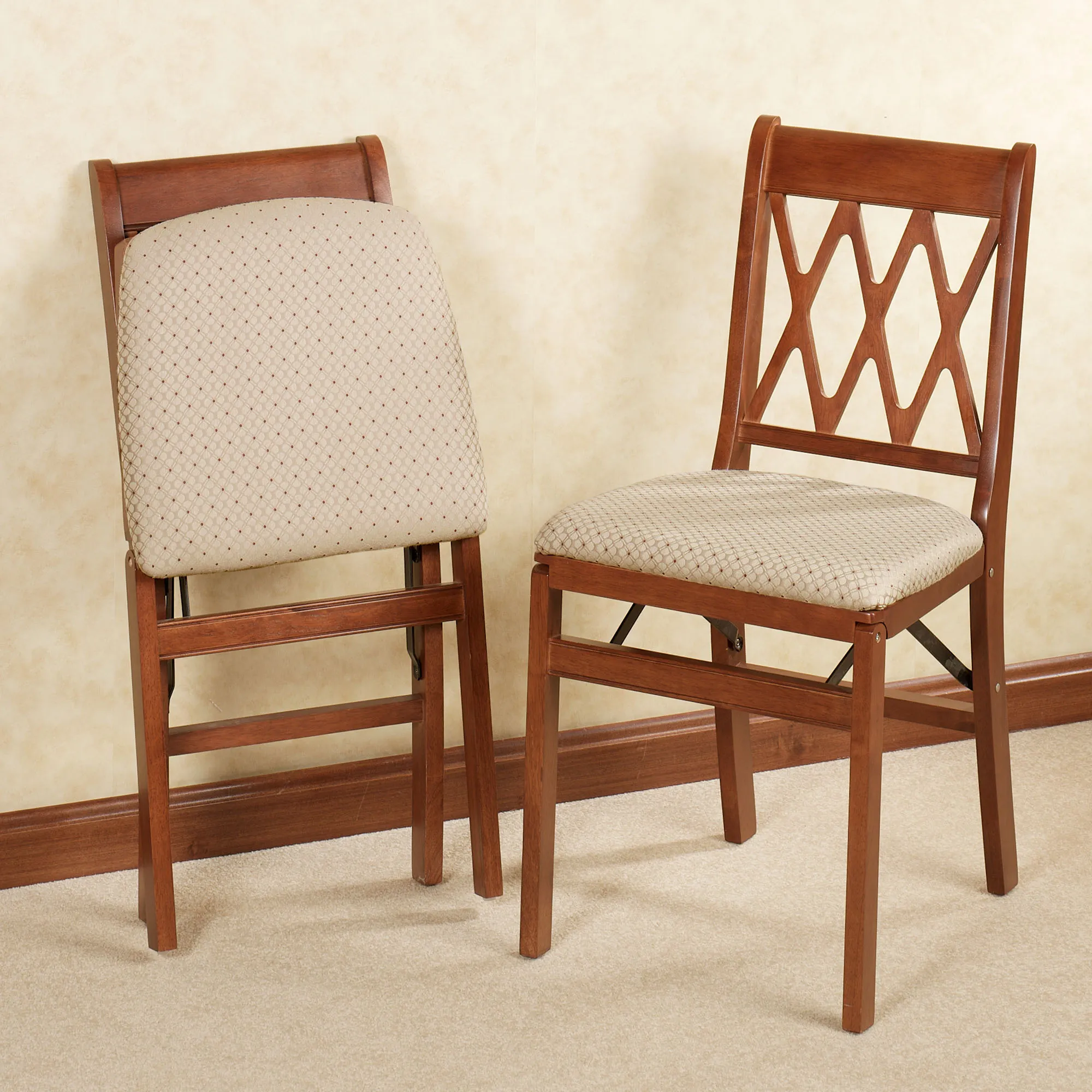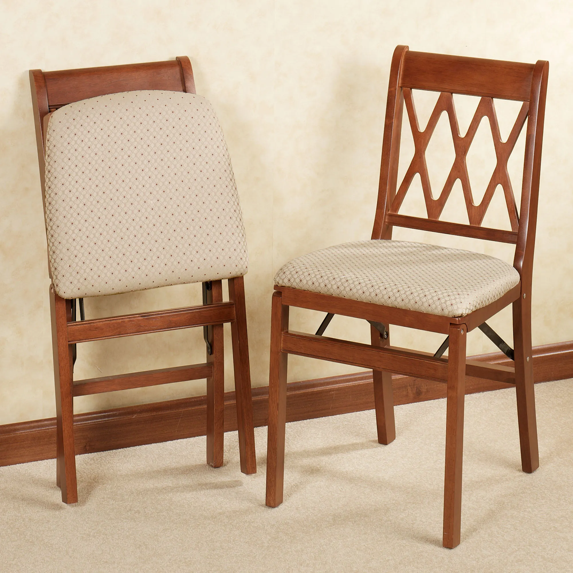 The handcrafted, hardwood Lattice Back Folding Chairs by Stakmore are paragons of convenience, possessing the appearance of fine, permanent furniture, yet perfect to use with a game table or when company drops by. Each chair features a folding mechanism that allows it to be easily and compactly stored away when not in use. Padded seat cushions are covered in a jacquard-woven polyester fabric, which features a lattice design accented with bordeaux dots. Furnishings are stained with a water-based stain, sealed, and top-coated for protection. Specify finish: Cherry or Fruitwood. Sold as a pair. No assembly required.