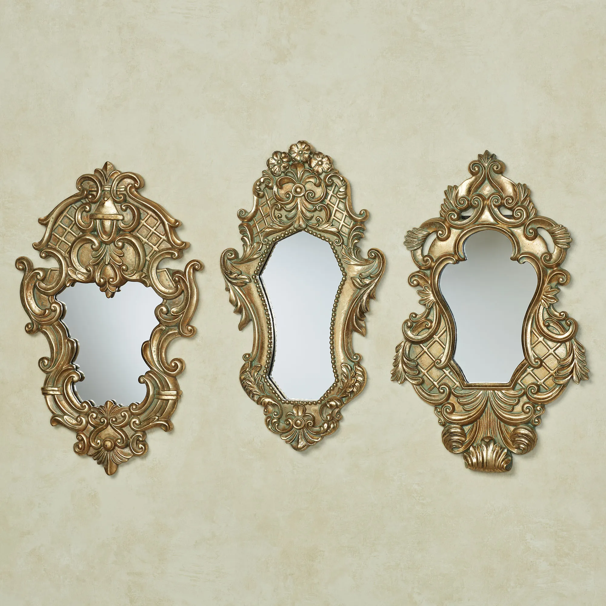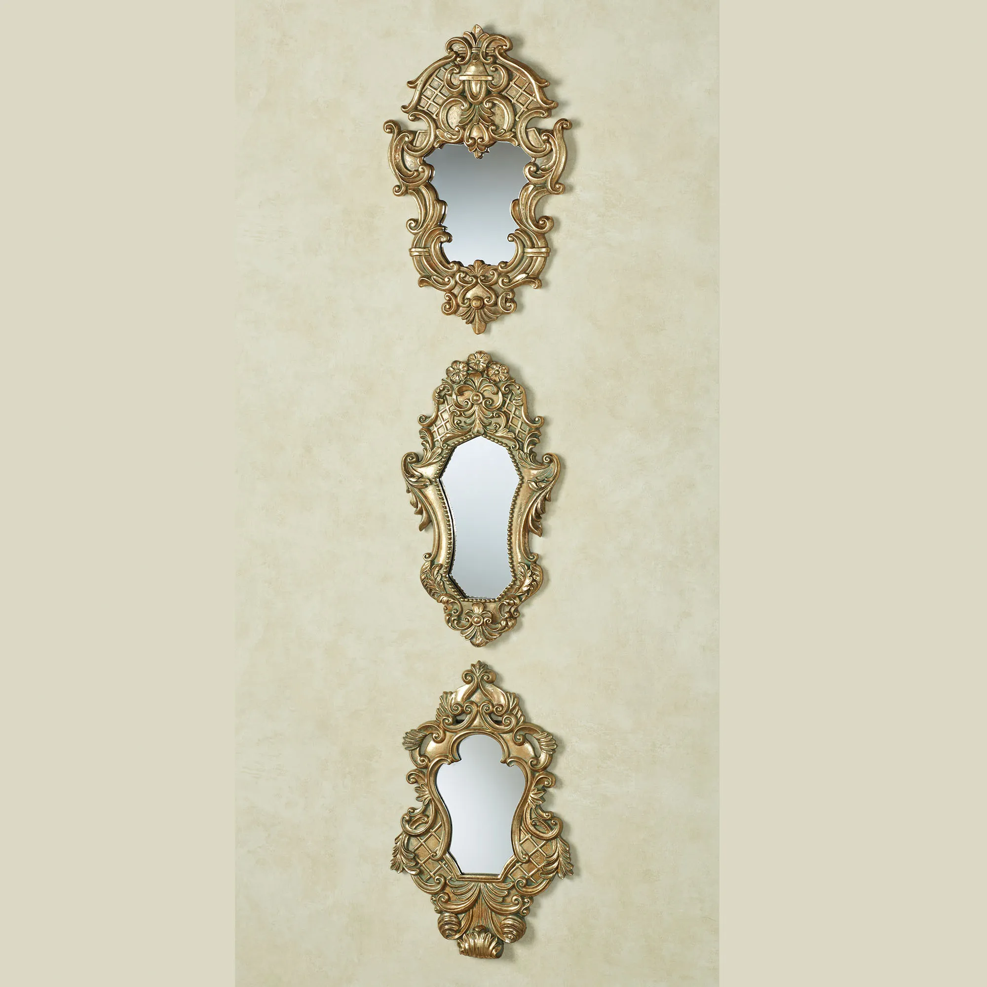 Acanthus leaves, fleurs, and Lattice Scrolls ornately display traditional splendor. Made of resin and finished in autumn gold, the accent wall mirrors in this set have central, shaped glass mirrors. Each is approx. 8.5"W-10"Wx1"Dx15.5"H.