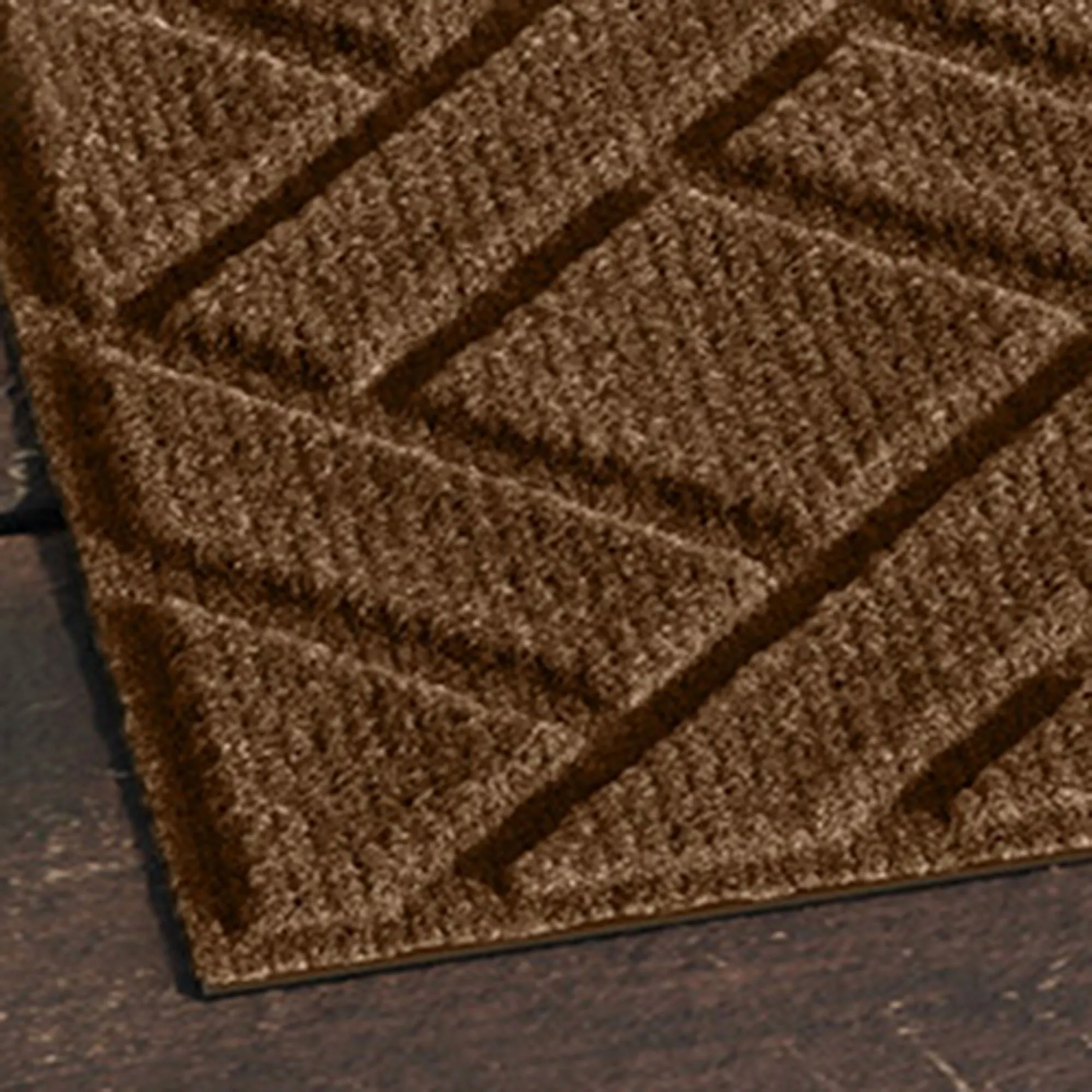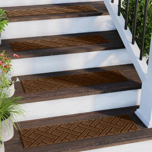Classic geometrics create a timeless Lattice pattern upon this indoor/outdoor stair tread set with a dimensional, molded design. The antistatic PET polyester stair treads have a skid-resistant SBR rubber backing that is slip-resistant and certified by the National Floor Safety Institute. The WaterHog(R) property keeps dirt and water on the treads and not your floor. Design is mildew-, mold-, and rot-resistant to withstand indoor or outdoor year-round use. Specify Dark Brown, Burgundy, Charcoal, Dark Green, Gray, Khaki, Navy, or Slate Blue. Stair treads are each 30"x8.5"; sold as a four-piece set. Shake to remove dirt; hose off to clean.