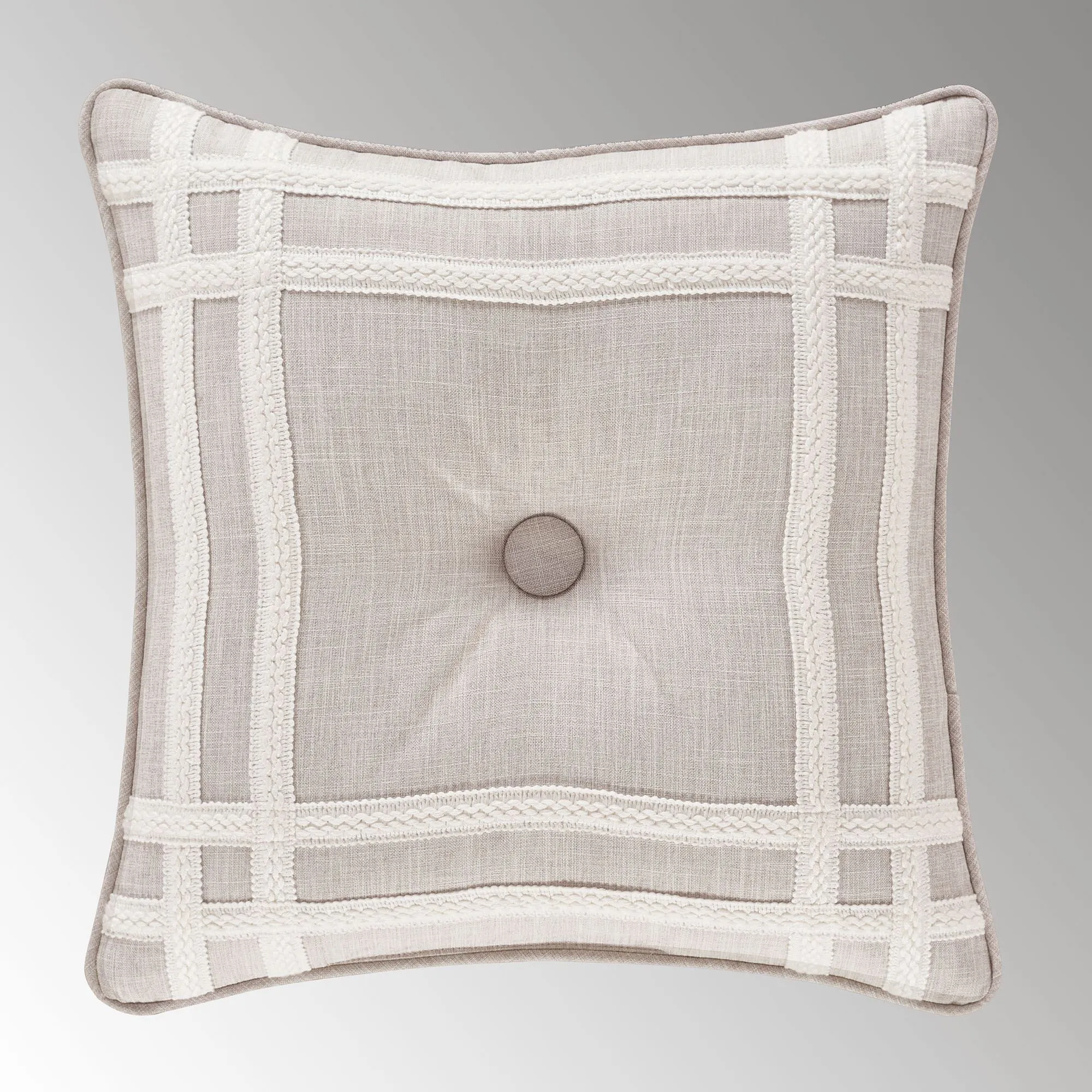Pillows: Spot clean. Piped Framed Square is beige with a double trim frame and center button tuft; reverses to ivory. Reversible Tufted Round is pleated ivory with a button tuft center and 4" side gussets. Piped Embroidered Square is beige with comforter-match designs. Piped Rectangle has layered medallion and trim designs on beige.
