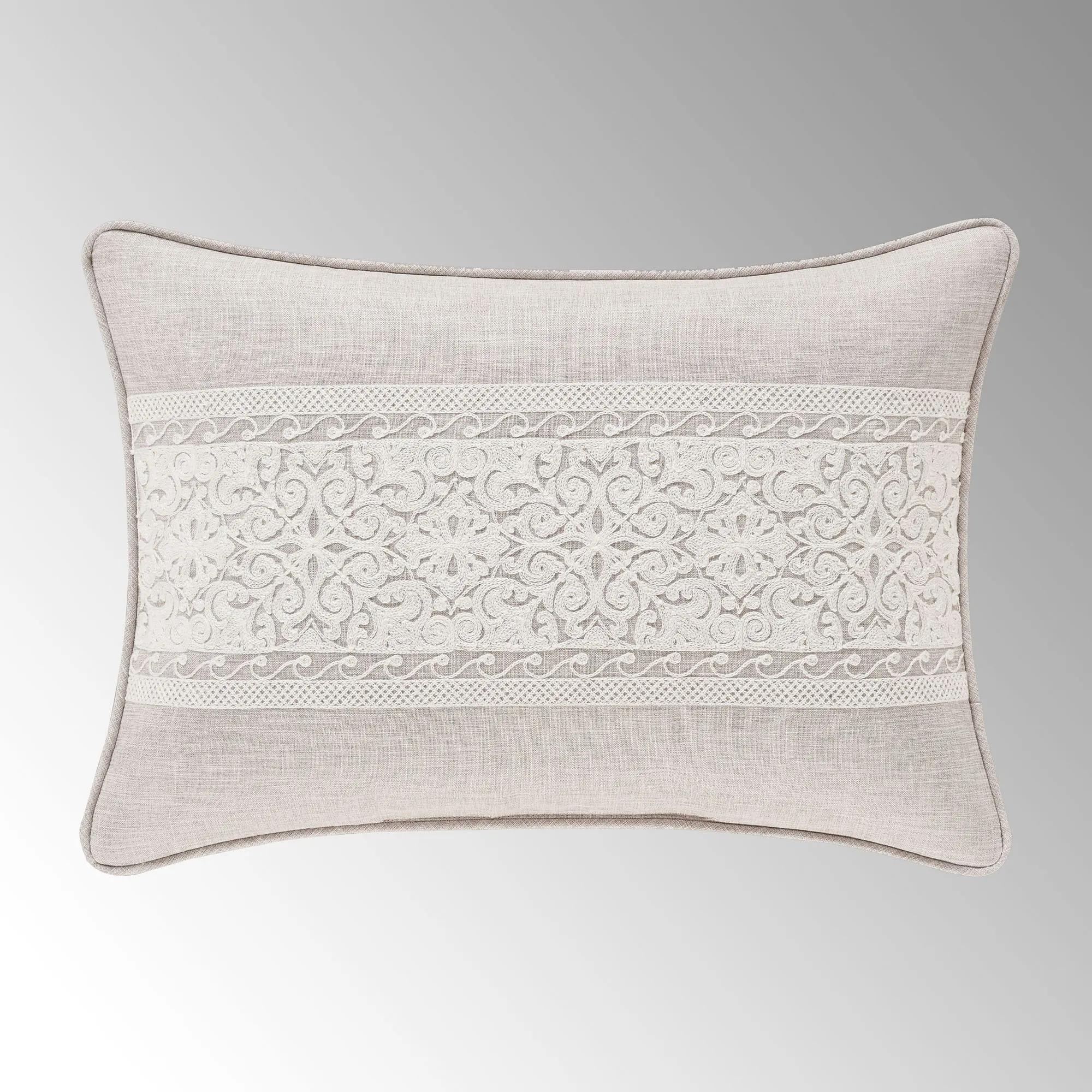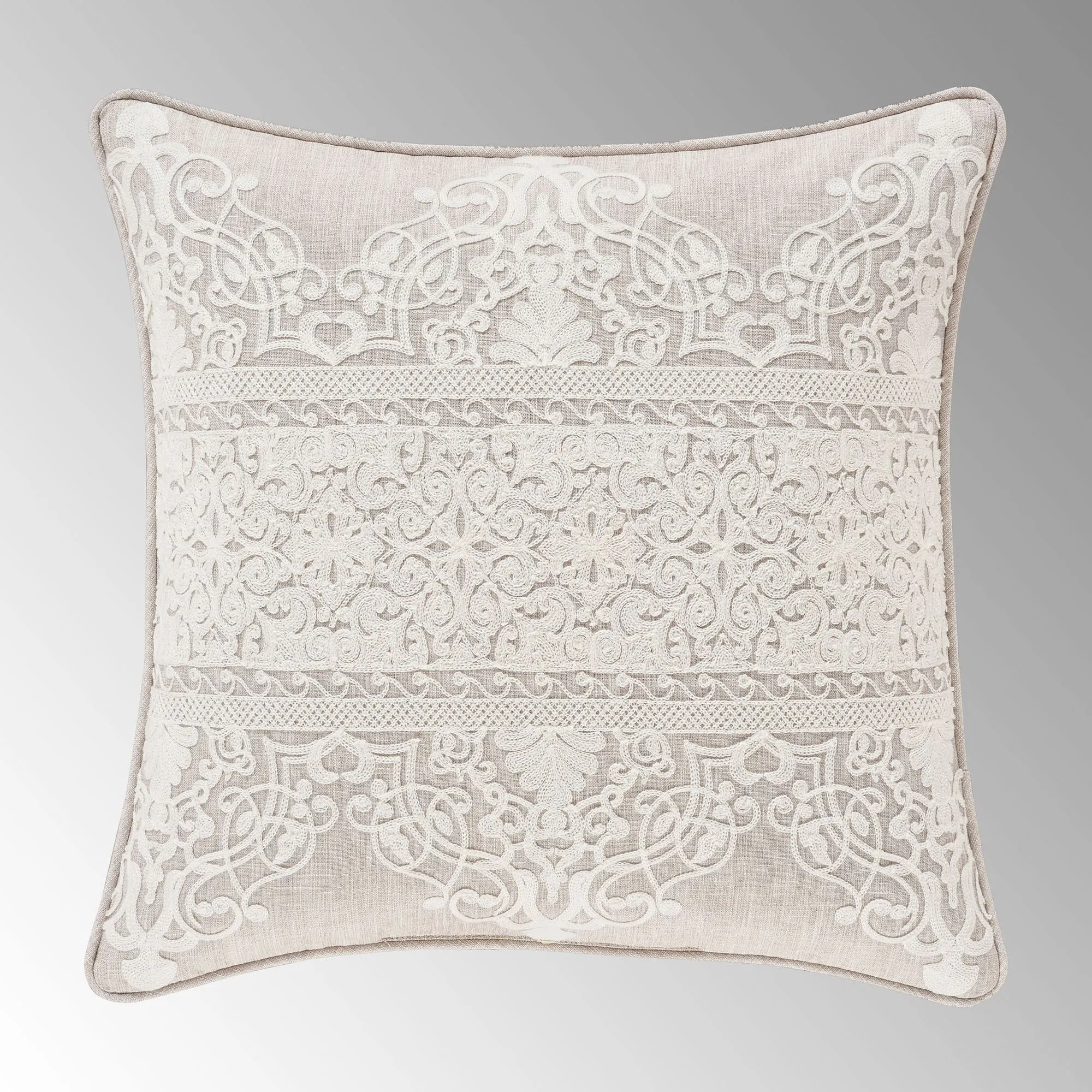 Exquisite needlework details the Lauralynn Bedding with dynamic texture and splendid beauty. From J. Queen New York, the faux linen polyester ensemble features ivory chain-stitched embroidery designs of layered medallions, lovely trim, and scrollwork damask.