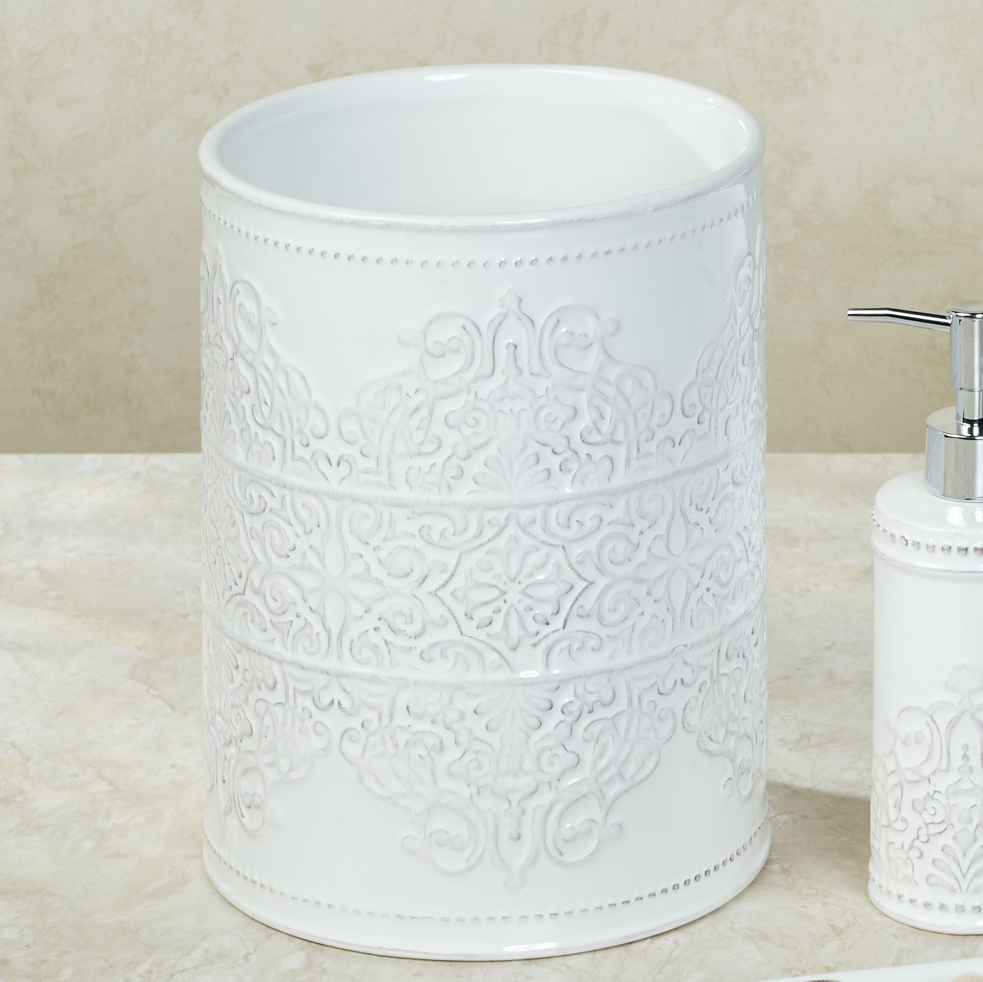 Sophisticated swirls and ornate motifs are opulent and beautiful on the Lauralynn Bath Accessories. These ceramic accents, from J. Queen New York, have a white glaze atop a natural glaze and embossed detailing. Specify Wastebasket, Tissue Cover, Lotion/Soap Dispenser, Tray, or Tumbler.