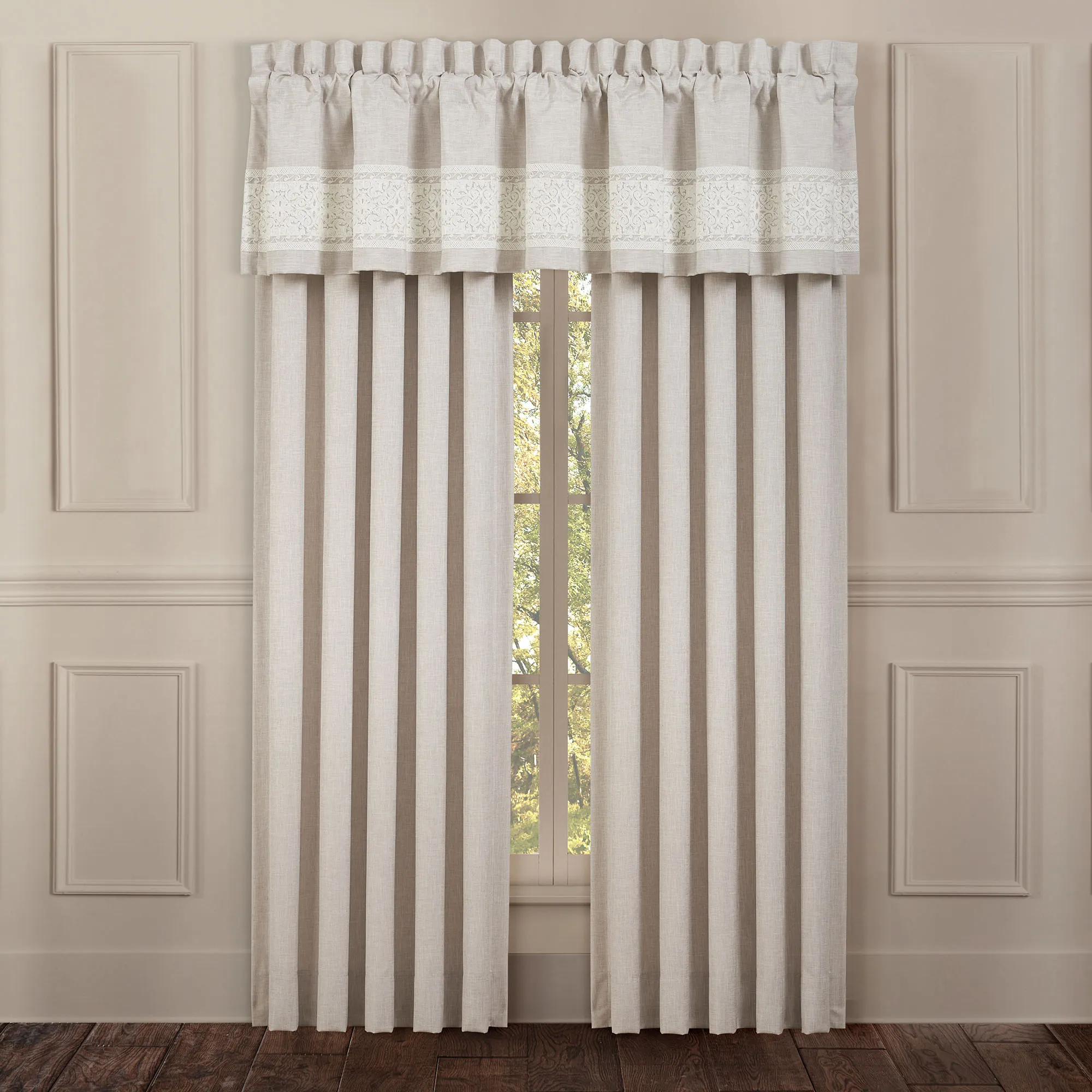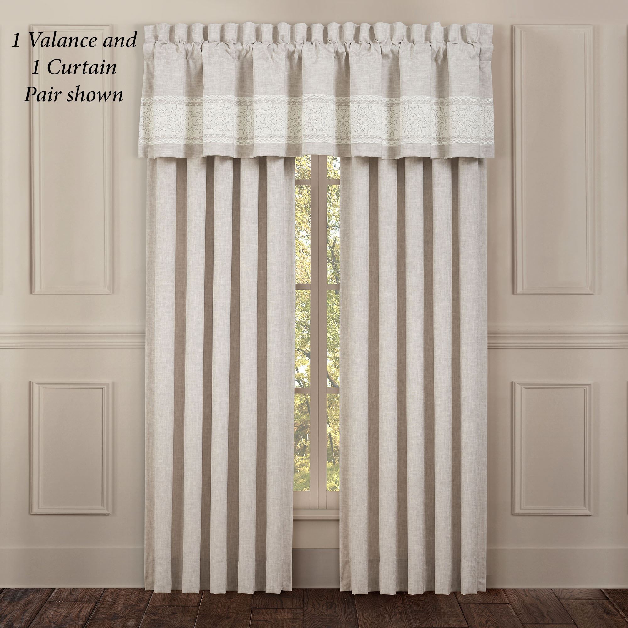 The Lauralynn Window Treatment adds dynamic texture and splendid beauty to your room. From J. Queen New York, the lined, polyester window treatment is beige faux linen. Choose Wide Curtain Pair or Tailored Valance. The Wide Curtain Pair has a 3" rod pocket and includes tiebacks. The Tailored Valance has trim with ivory chain-stitched embroidery designs of layered medallions and a 3.25" rod pocket. Dry clean only. Imported. The curtain pair width is the total width of two panels together.