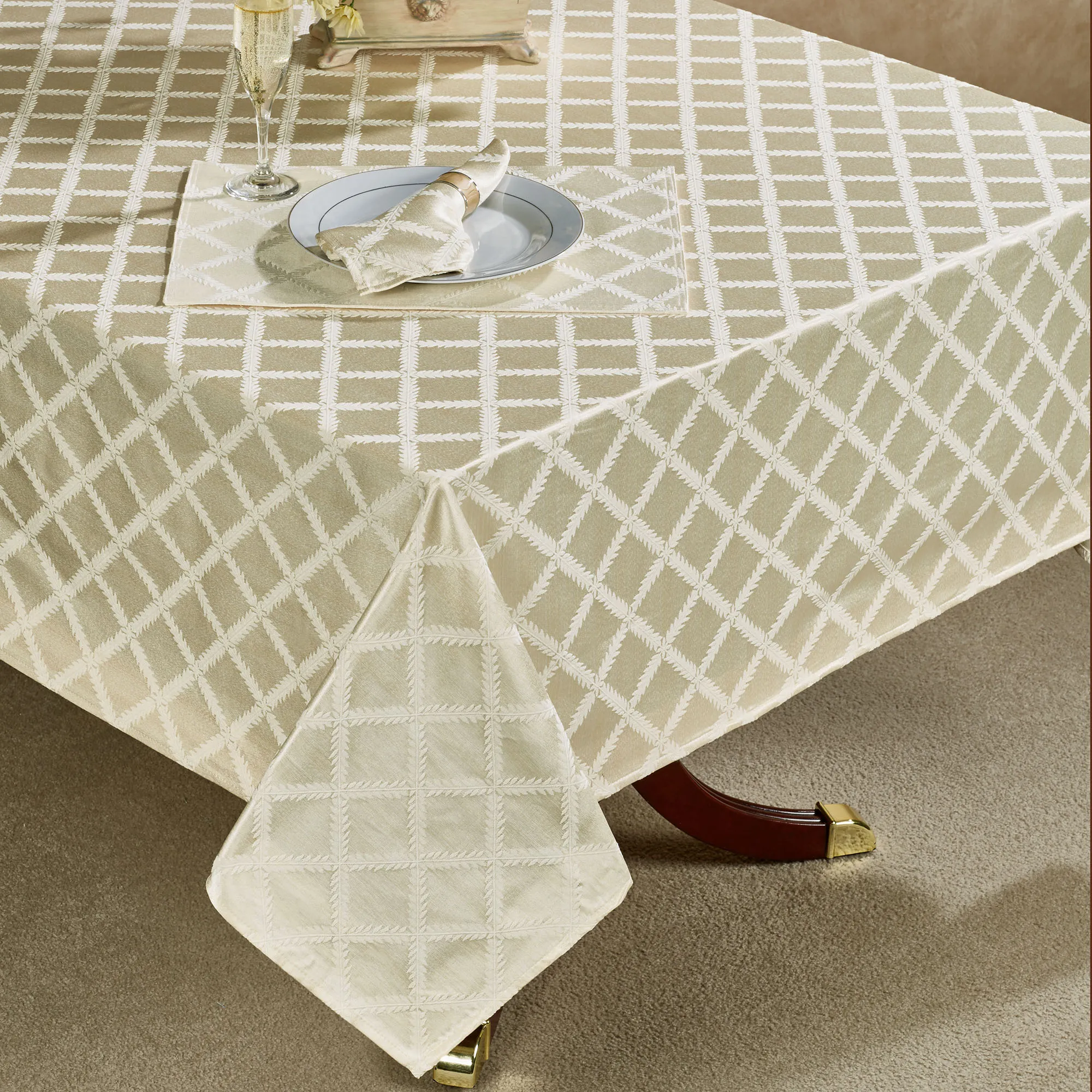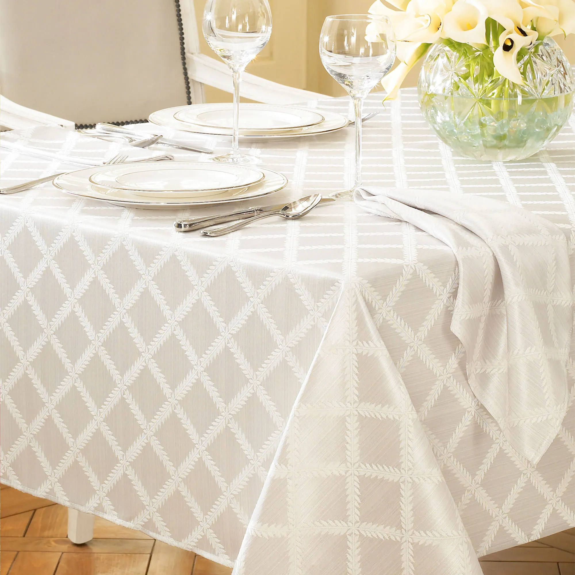 The Laurel Leaf(TM) Table Linens decorate any table with the regal look of luxury. These cotton/polyester accents by Lenox(R) American by Design feature graceful leaf garlands on a damask background. Ivory has a striped damask background in ivory and light cream. Off-White has a solid damask background. Platinum has a striped damask background in platinum and silver gray. Specify Oblong Tablecloth, Table Runner, Placemat Set of 4, or Napkin Set of 4. Oblong Tablecloth is 70"Wx86"L. Table Runner is 14"Wx90"L. Placemats are 18"x13". Napkins are 19" sq. Machine washable. Imported.