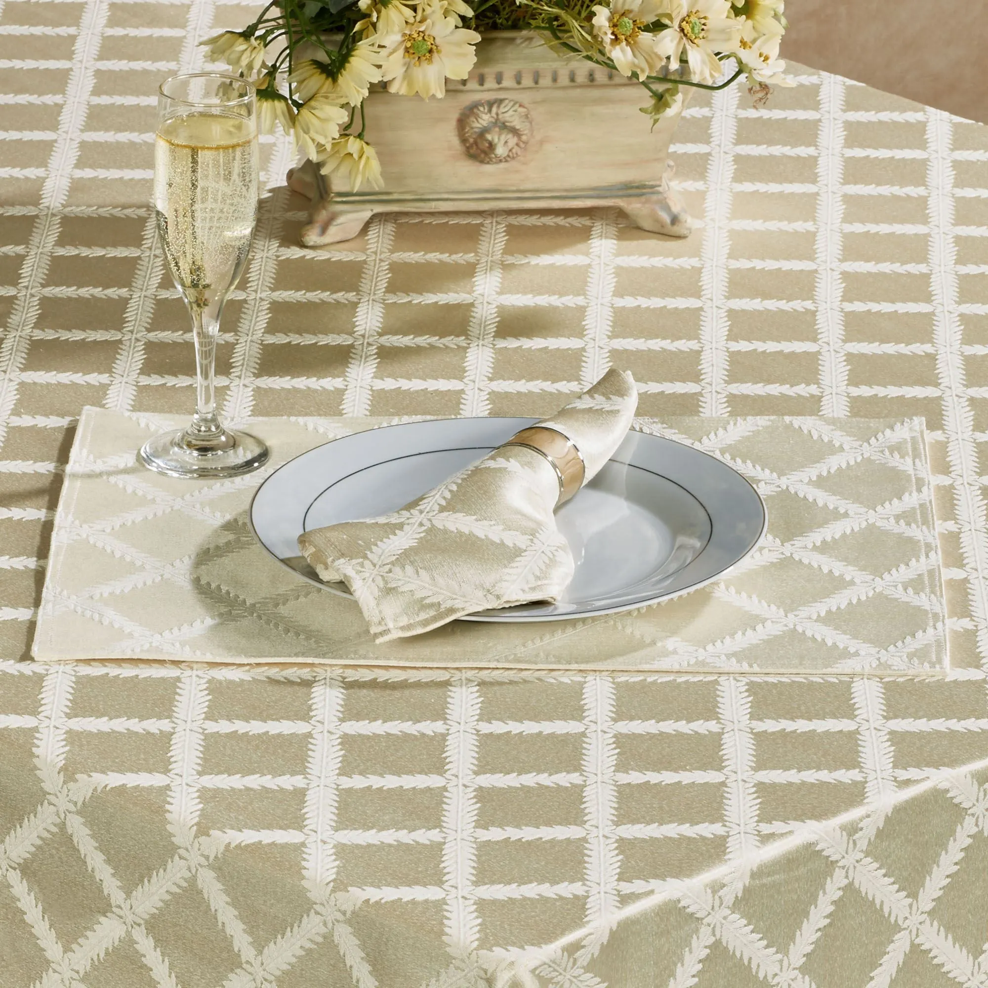 The Laurel Leaf(TM) Table Linens decorate any table with the regal look of luxury. These cotton/polyester accents by Lenox(R) American by Design feature graceful leaf garlands on a damask background. Ivory has a striped damask background in ivory and light cream. Off-White has a solid damask background. Platinum has a striped damask background in platinum and silver gray. Specify Oblong Tablecloth, Placemat Set of 4, or Napkin Set of 4. Oblong Tablecloth is 70"Wx86"L. Placemats are 18"x13". Napkins are 19" sq. Machine washable. Imported.