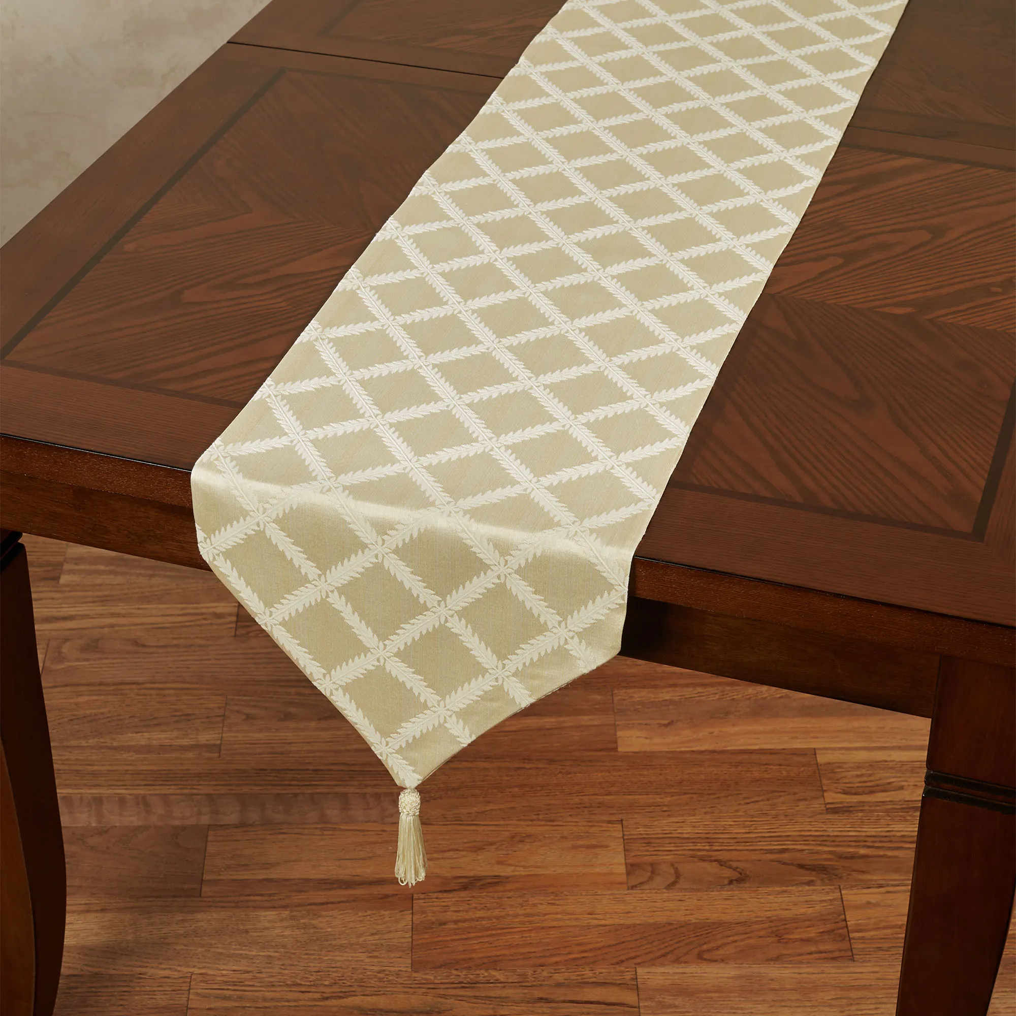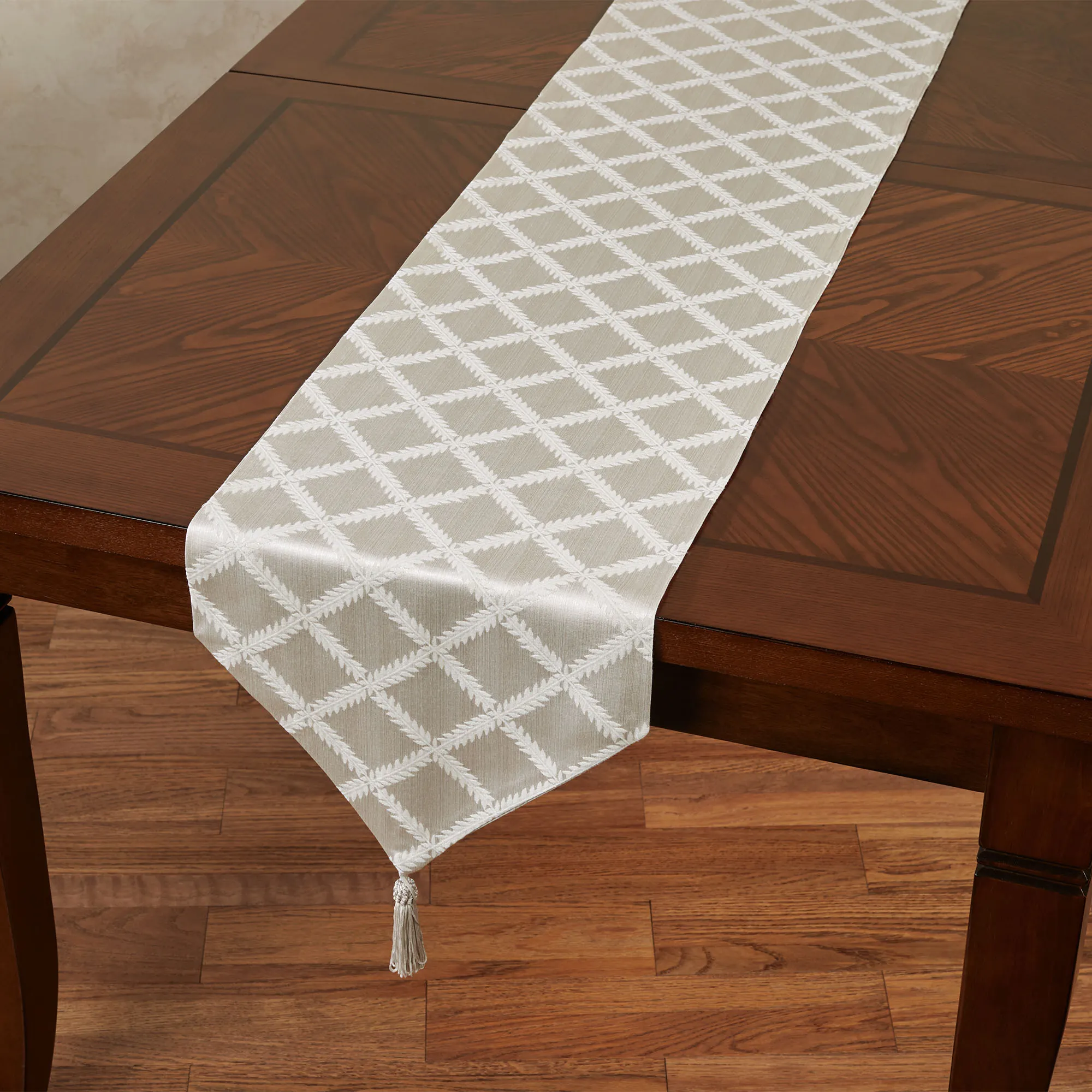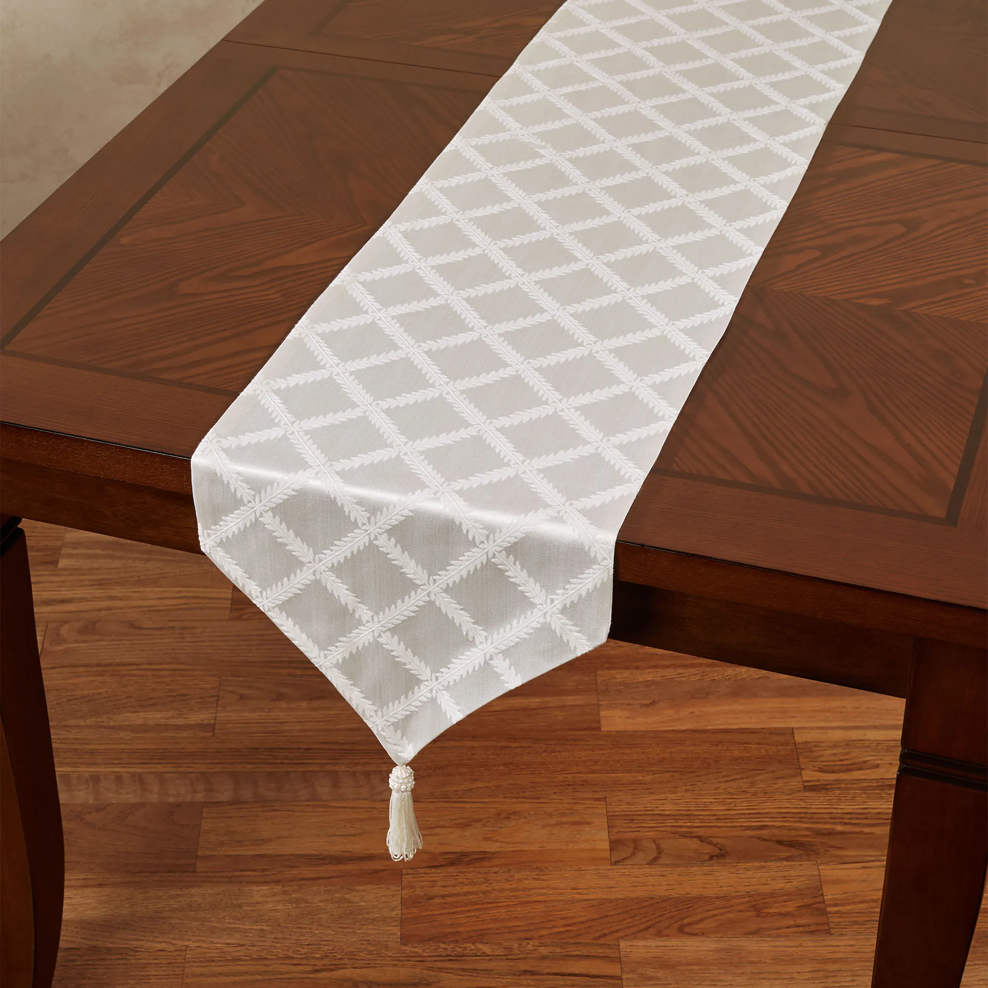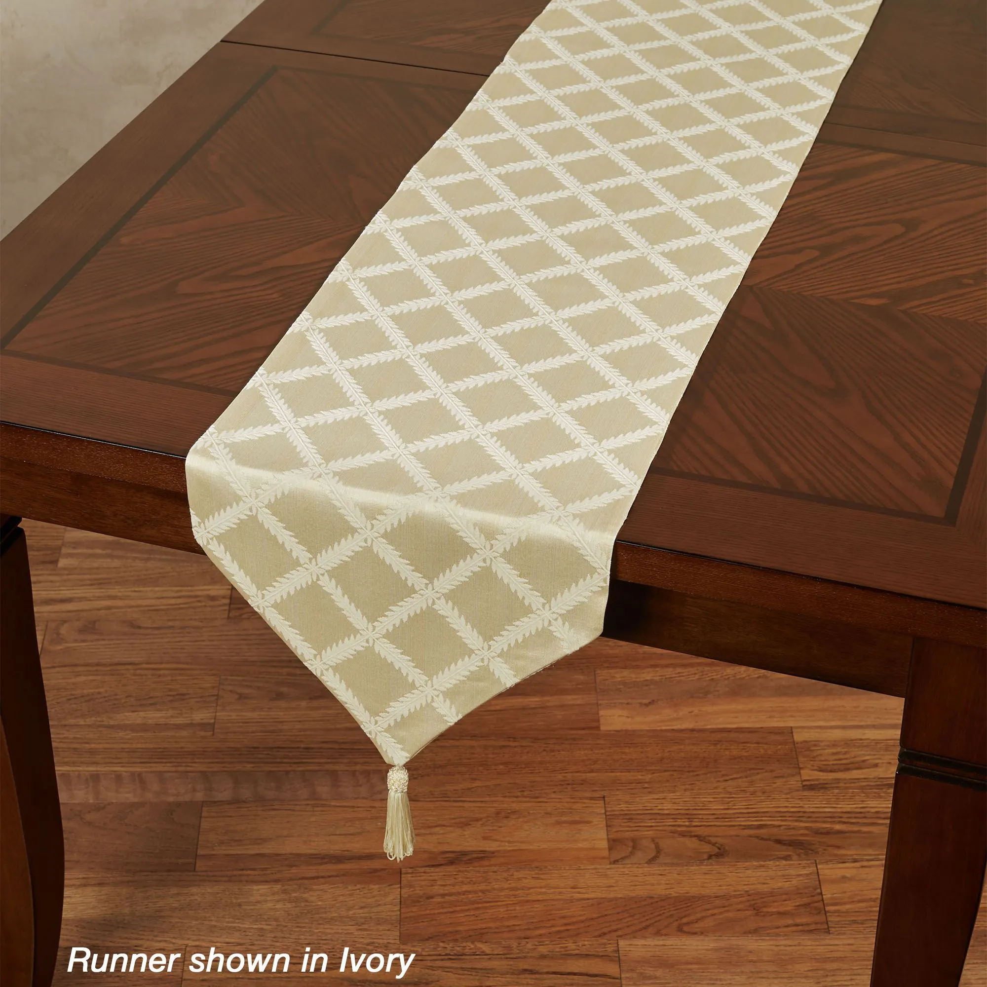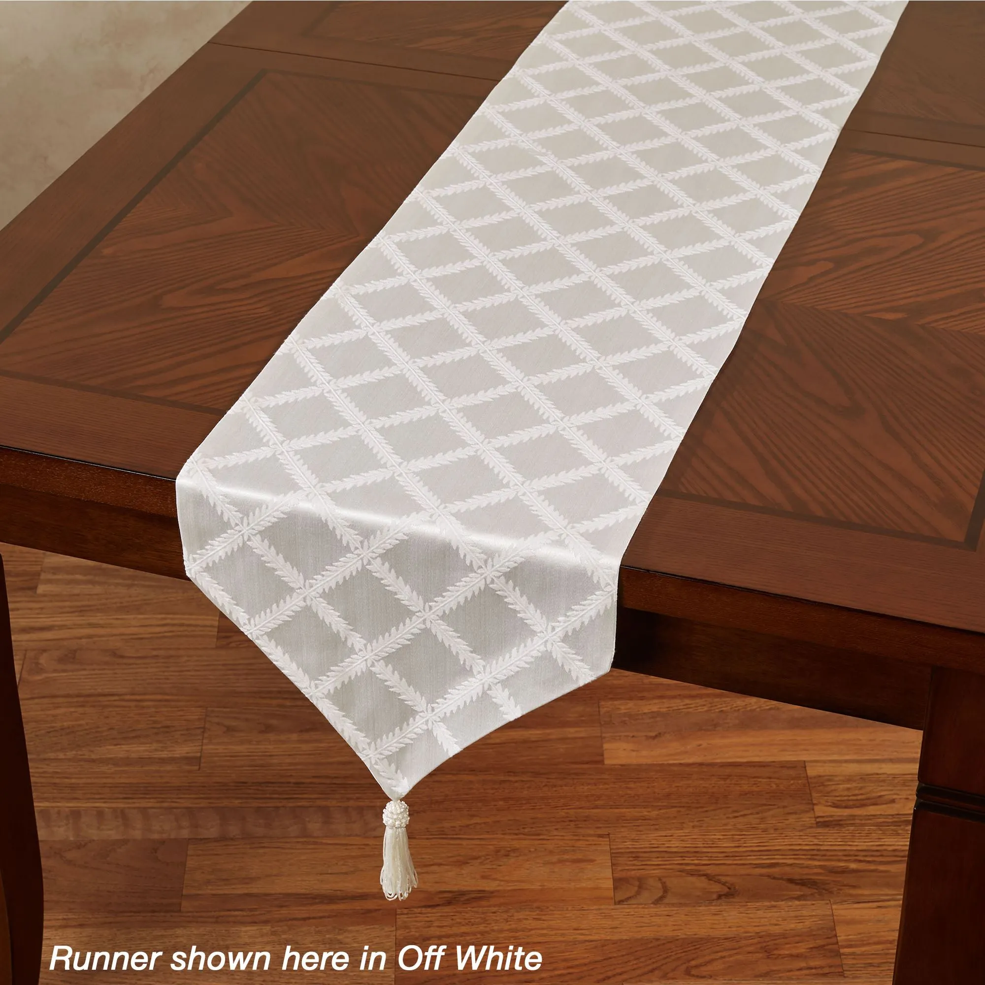 The Laurel Leaf(TM) Table Runner and Accessories decorate any table with the regal look of luxury. These cotton/polyester accents by Lenox(R) American by Design feature graceful leaf garlands on a damask background. Off-White has a solid damask background. Ivory has a striped damask background in ivory and light cream. Platinum has a striped damask background in platinum and silver gray. Specify Table Runner, Placemat Set of 4, Napkin Set of 4, or Oblong Tablecloth. Table Runner is 14"Wx90"L. Placemats are 18"x13". Napkins are 19" sq. Oblong Tablecloth is 70"W. Machine washable. Imported.