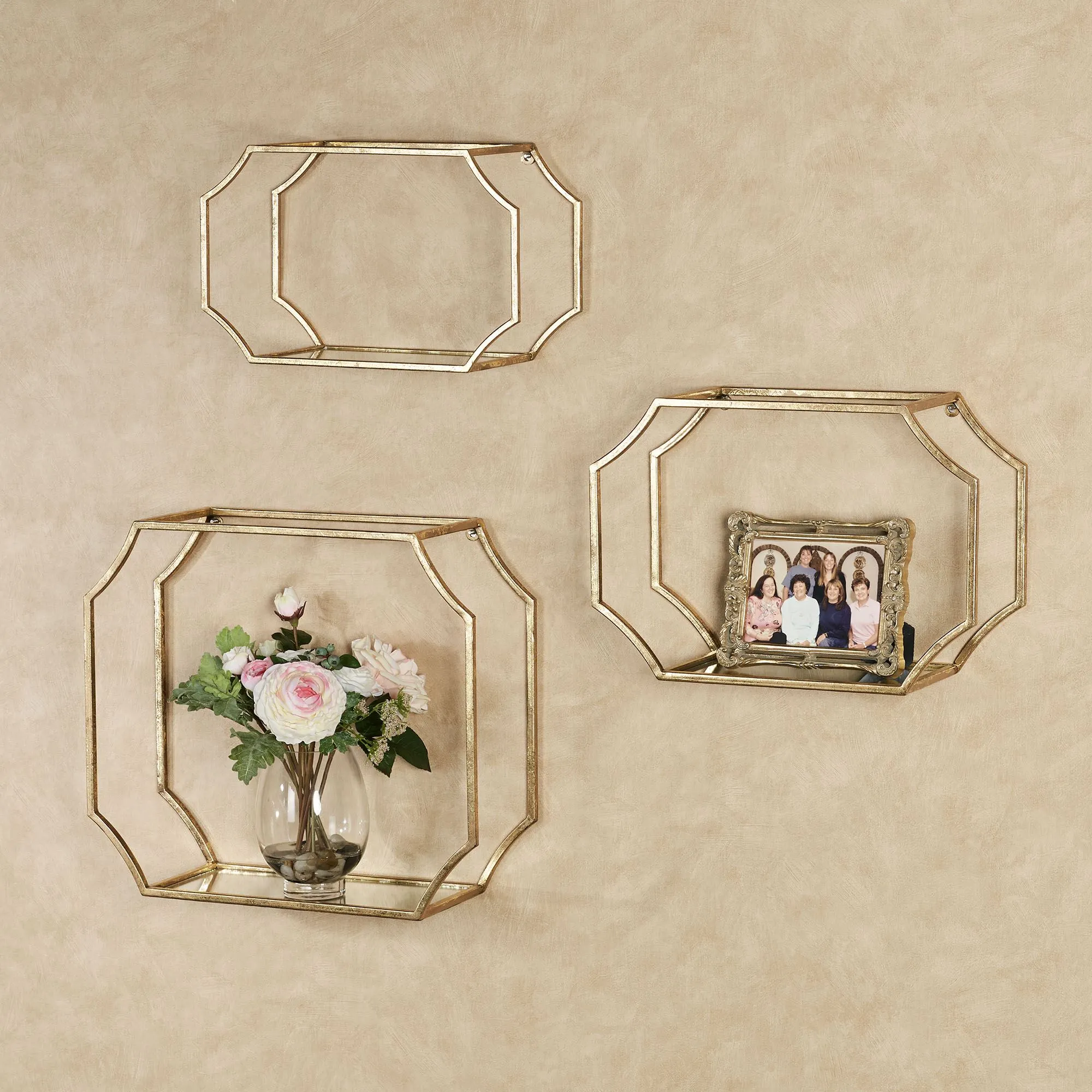 The Laurent Wall Shelf Set is artfully designed in contemporary fashion. These metal openwork wall shelves have angled corners, a gold foil finish, and mirrored glass bottoms. Small is 16"Wx7"Dx10"H; medium is 18"Wx7"Dx12.5"H; large is 20"Wx7"Dx18"H.