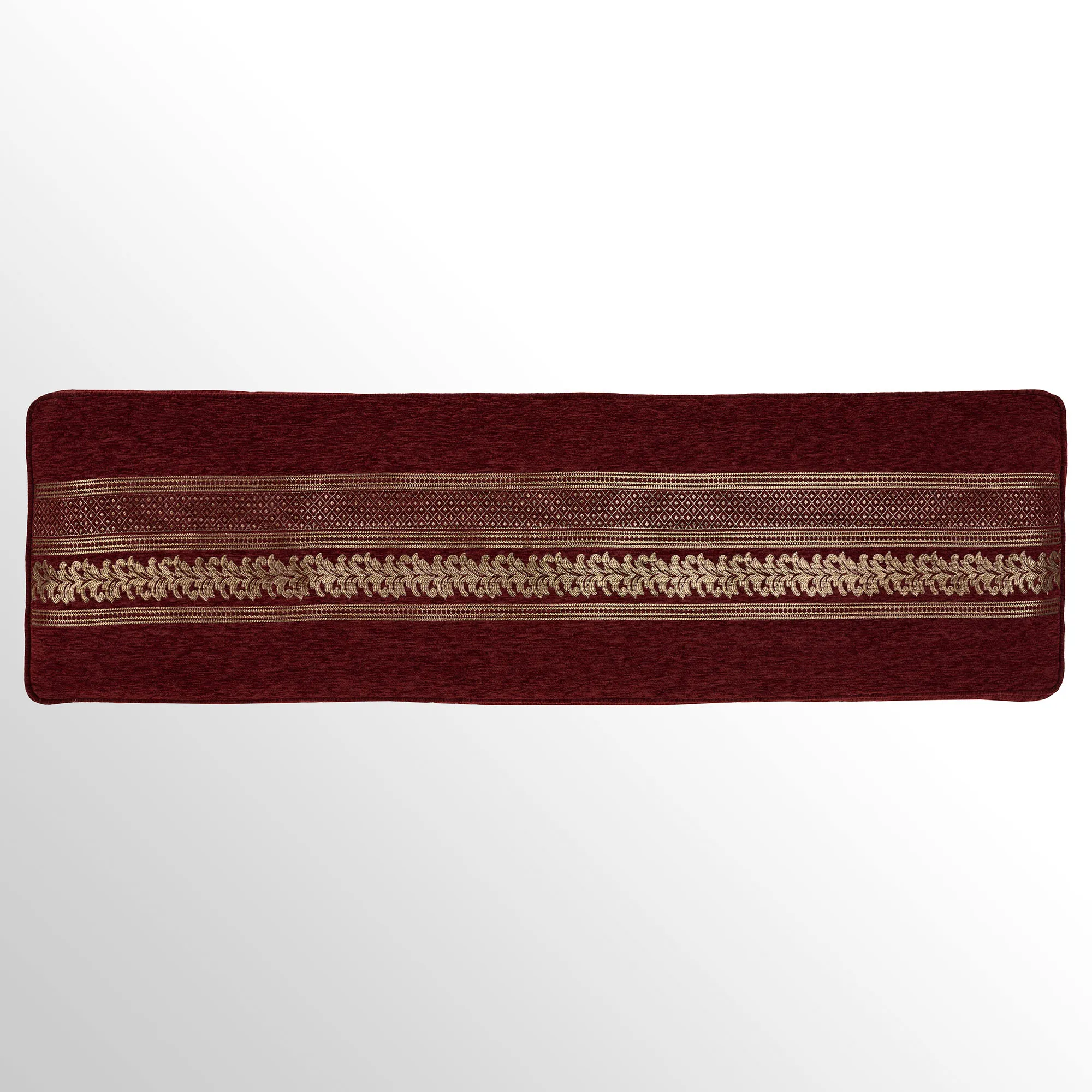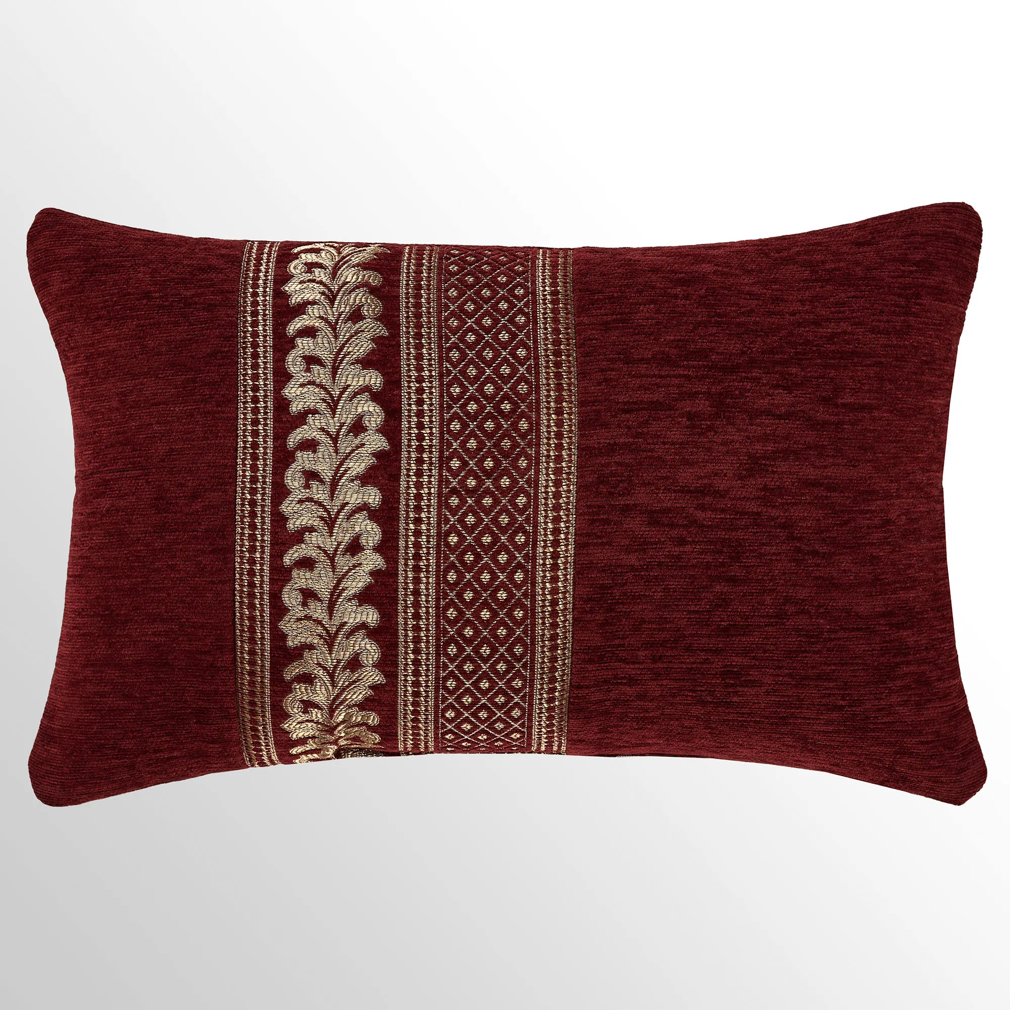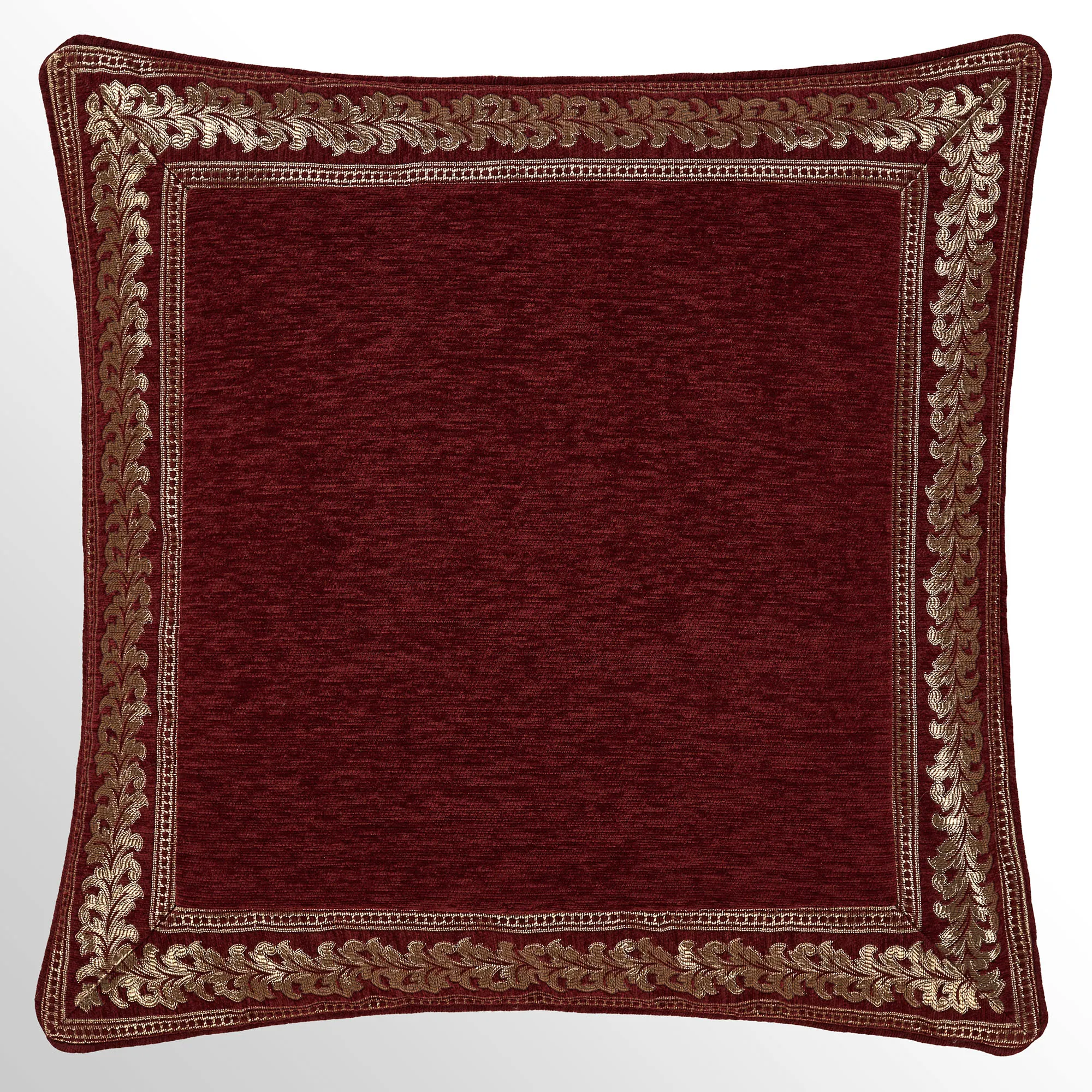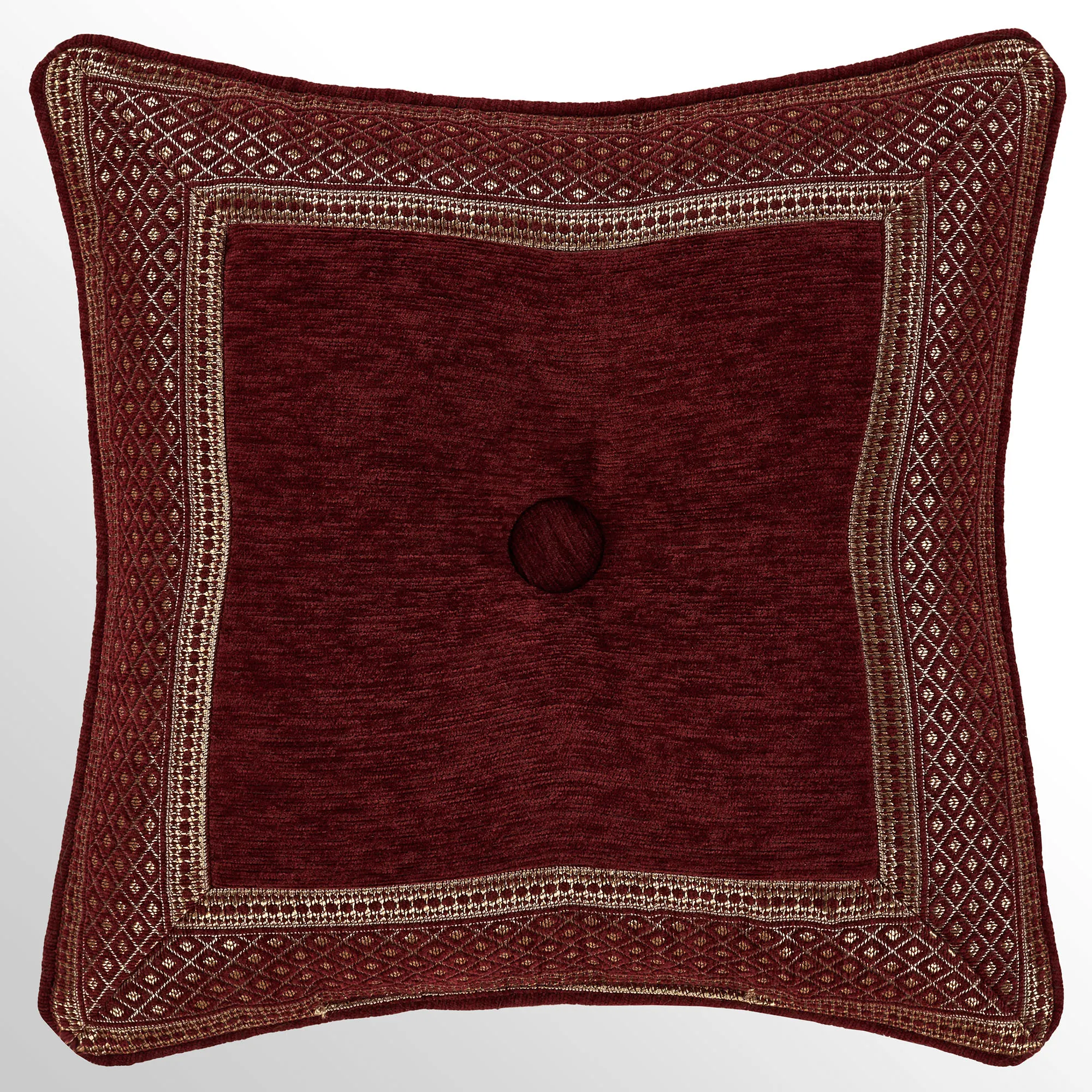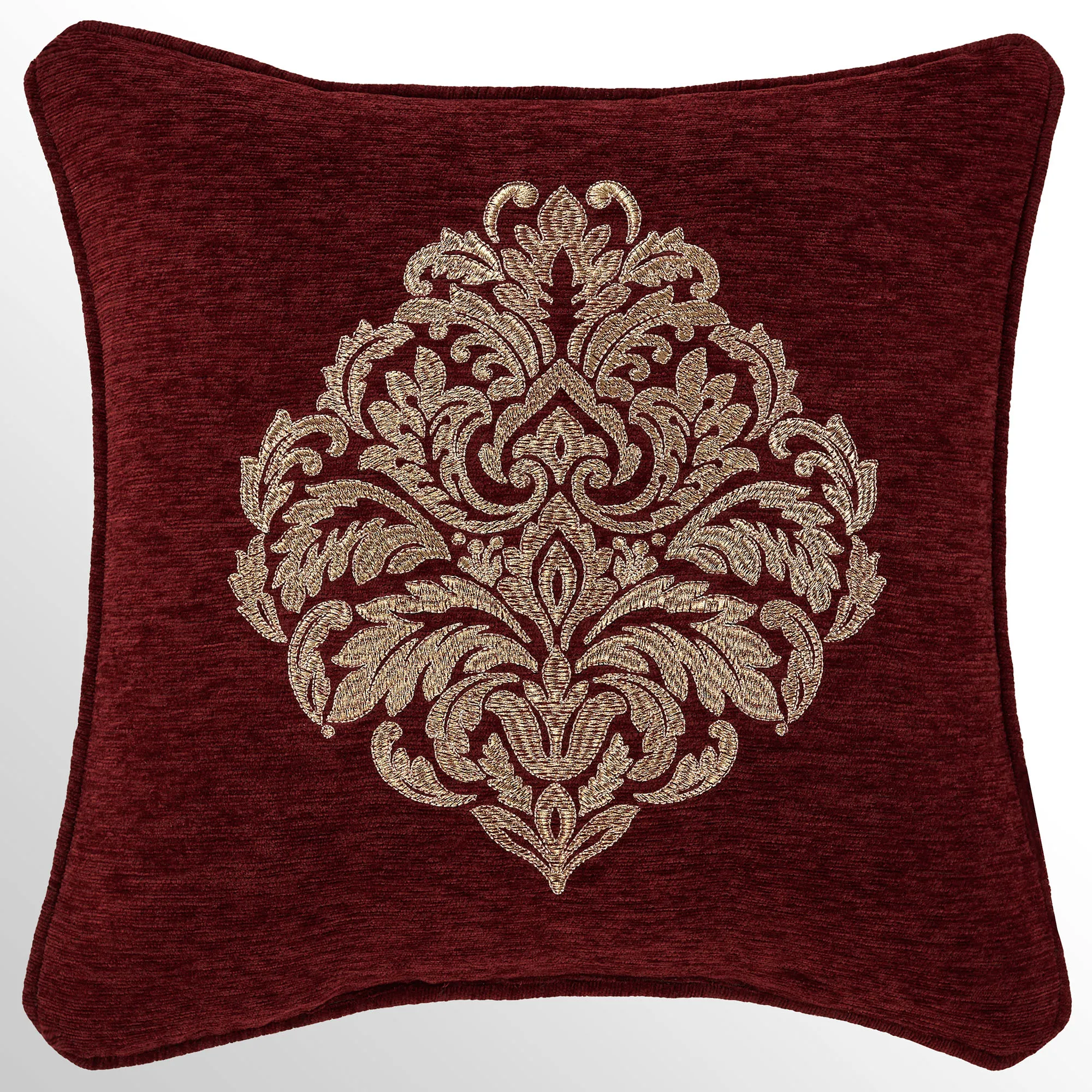 Crimson chenille Pillows: Spot clean. The Tufted Square has mitred corners, stripe and diamond motifs, a tufted button in the center, and piped ends. The piped Embroidered Square has gold damask embroidery. The Piped Square has mitred corners and damask, stripe, and diamond designs; reverses to diamond, stripe, and solid crimson motifs. The Tailored Rectangle has gold diamond, stripe, and fleur designs. The piped Jumbo Rectangle has gold diamond, stripe, and fleur designs and a 2.5" side gusset; reverses to diamond, stripe, and solid crimson motifs. The reversible, handmade Round has pleats, a 3" side gusset, and a button tuft in the center.