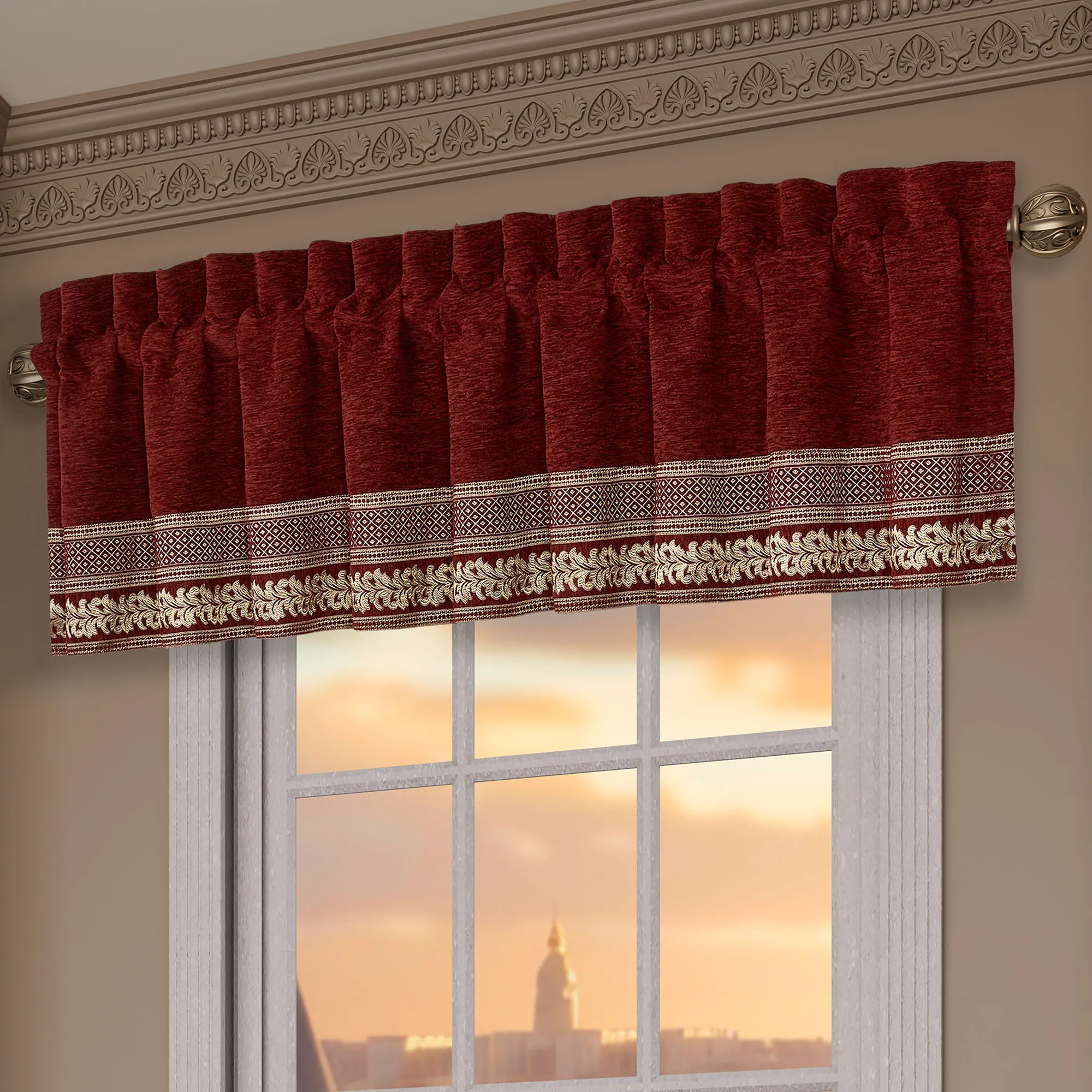 The lined, crimson chenille Window Treatments have 3" rod pockets. The tailored Wide Curtain Pair includes tiebacks. Curtains are available in two lengths. Tailored Valance has diamond, stripe, and fleur designs.