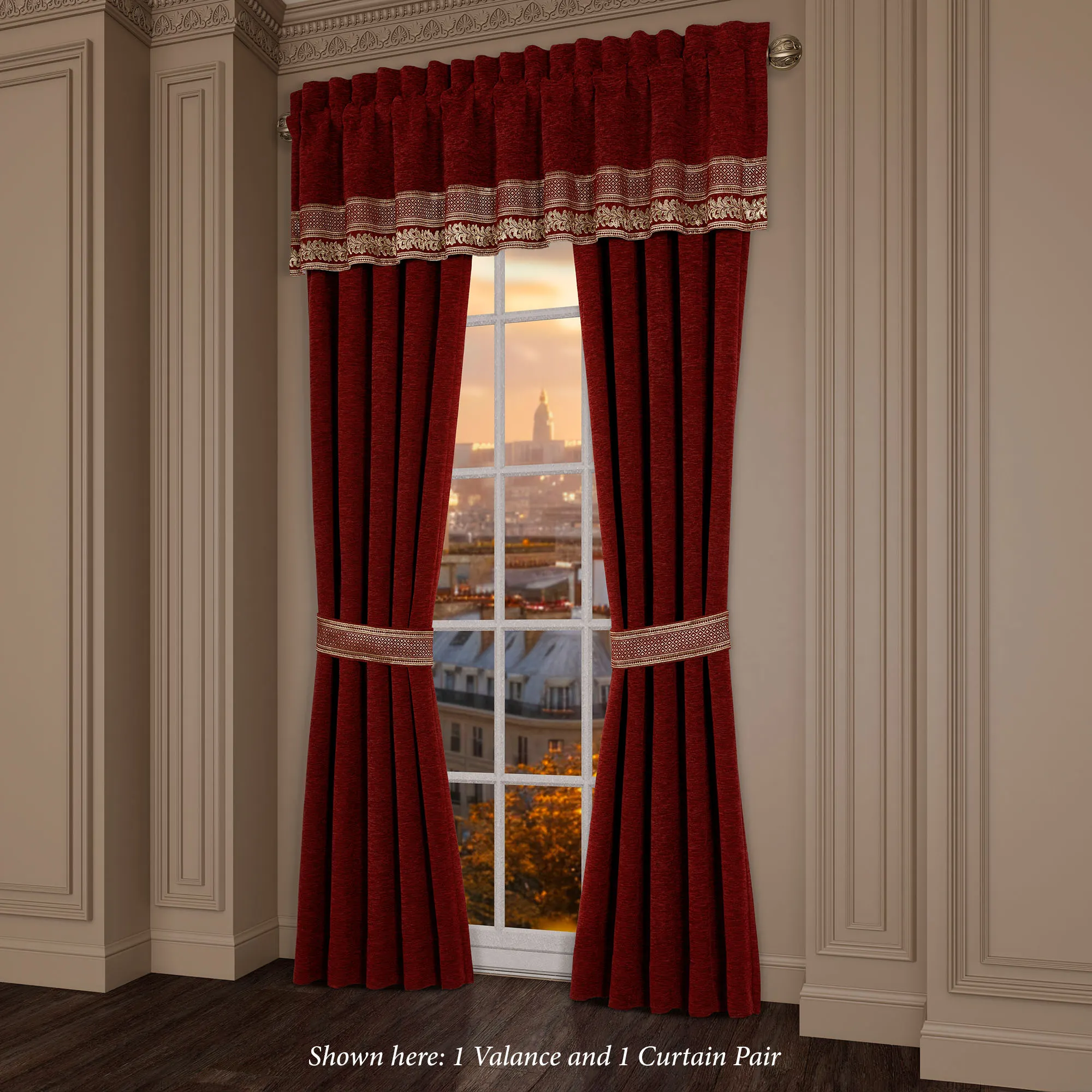 The lined, crimson chenille Window Treatments have 3" rod pockets. The tailored Wide Curtain Pair includes tiebacks. Curtains are available in two lengths. Tailored Valance has diamond, stripe, and fleur designs.