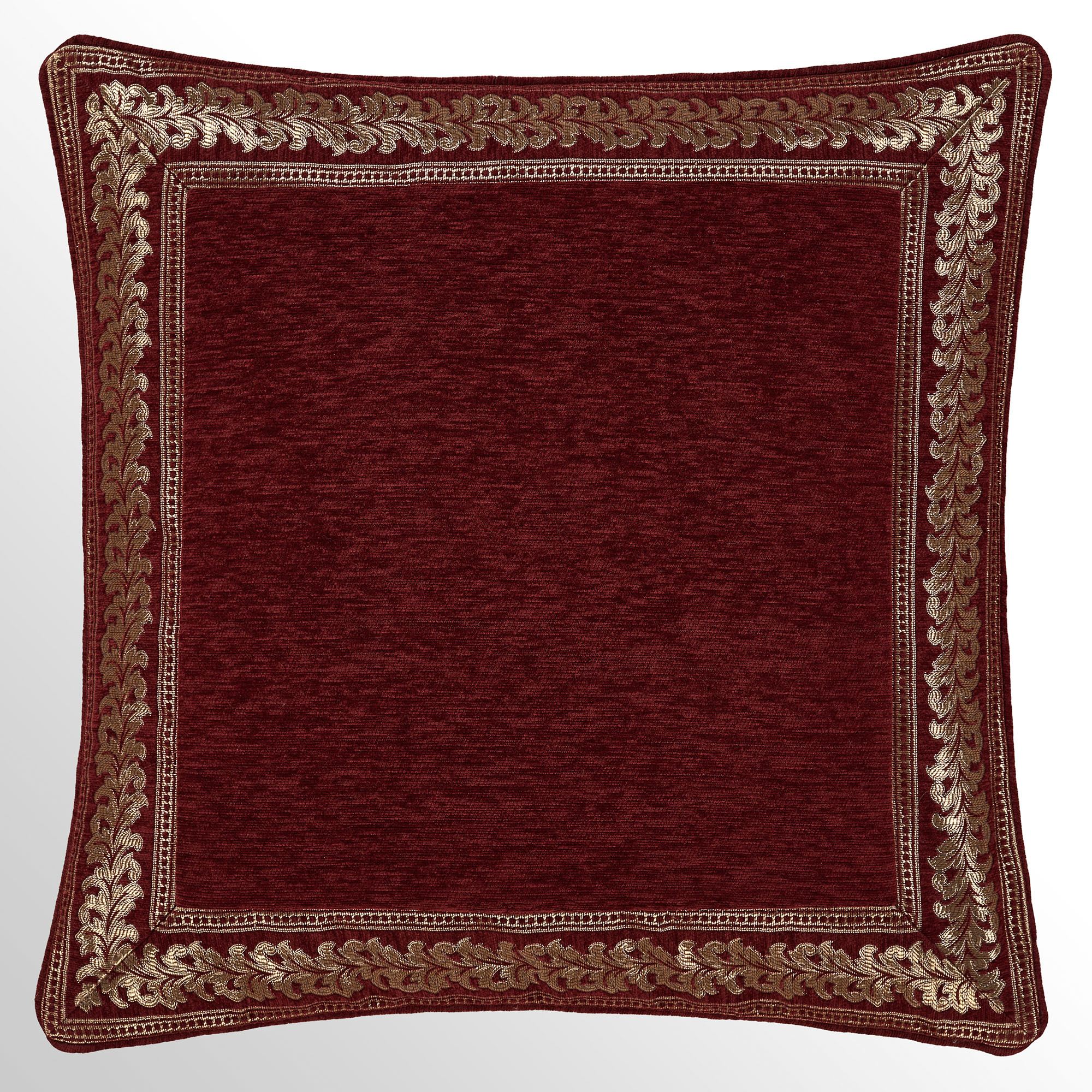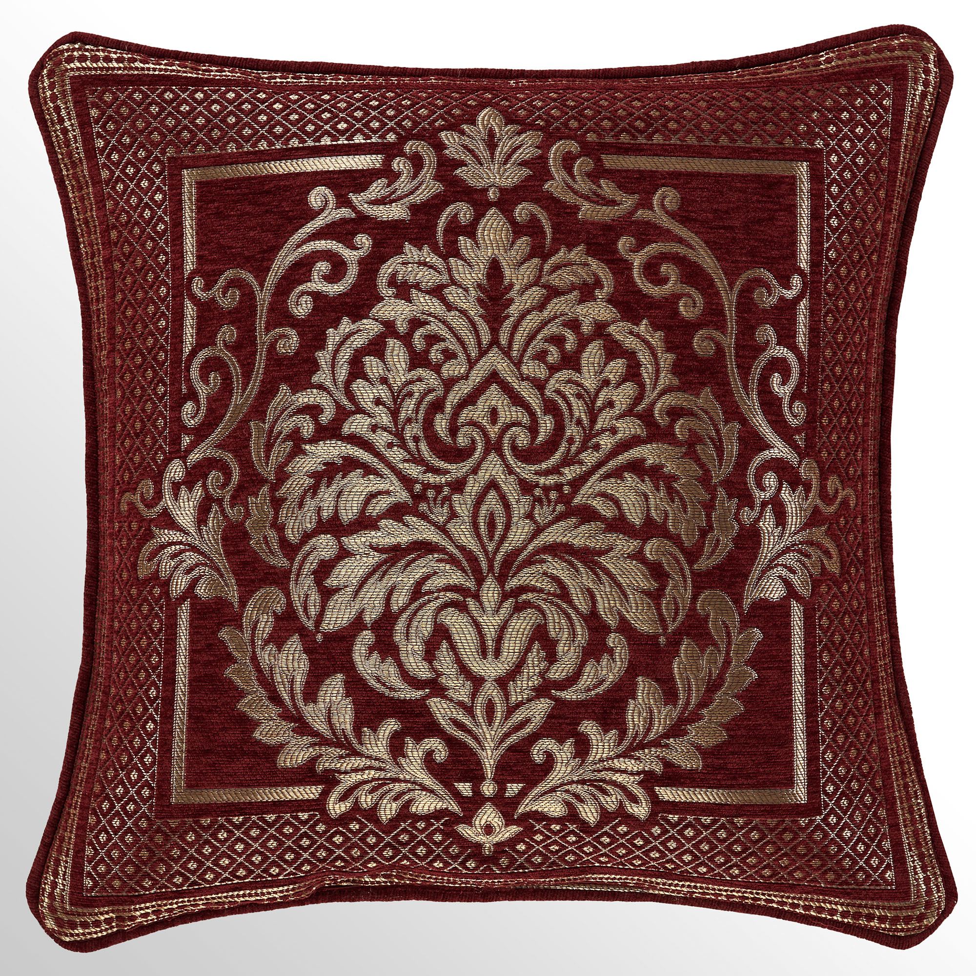Crimson chenille Pillows: Spot clean. The Tufted Square has mitred corners, stripe and diamond motifs, a tufted button in the center, and piped ends. The piped Embroidered Square has gold damask embroidery. The Piped Square has mitred corners and damask, stripe, and diamond designs; reverses to diamond, stripe, and solid crimson motifs. The Tailored Rectangle has gold diamond, stripe, and fleur designs. The piped Jumbo Rectangle has gold diamond, stripe, and fleur designs and a 2.5" side gusset; reverses to diamond, stripe, and solid crimson motifs. The reversible, handmade Round has pleats, a 3" side gusset, and a button tuft in the center.