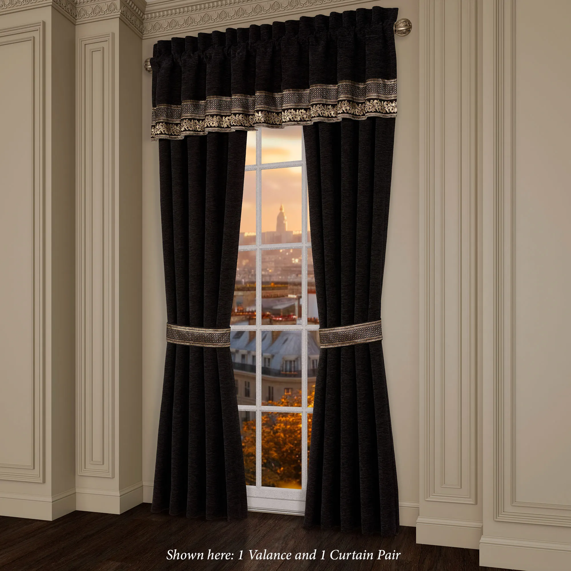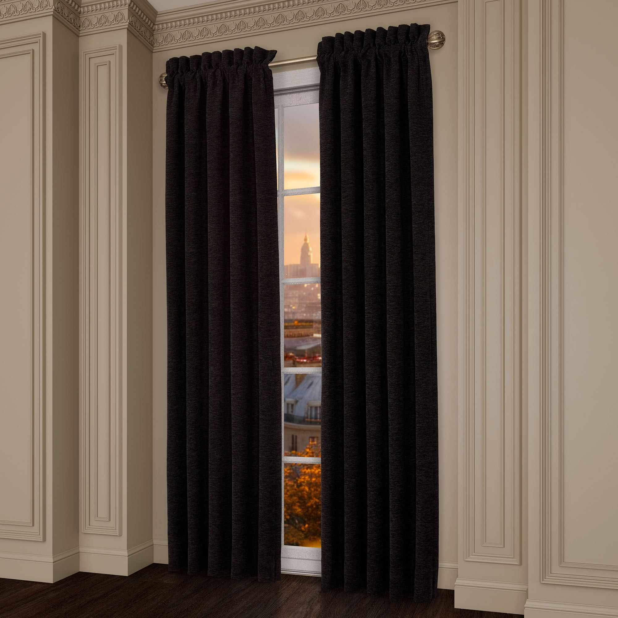 The lined, black chenille Window Treatments have 3" rod pockets. The tailored Wide Curtain Pair includes tiebacks. Curtains are available in two lengths. Tailored Valance has diamond, stripe, and fleur designs.